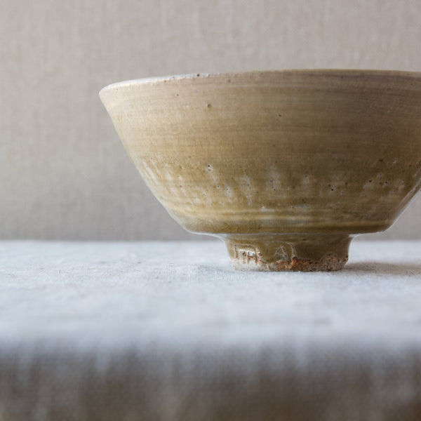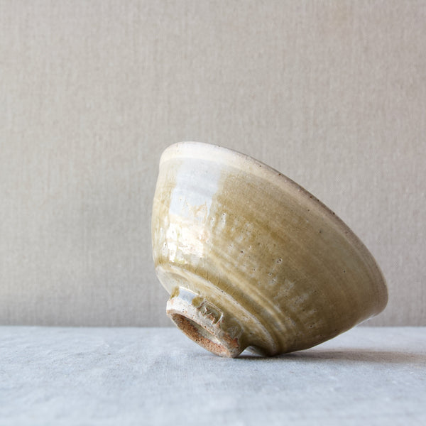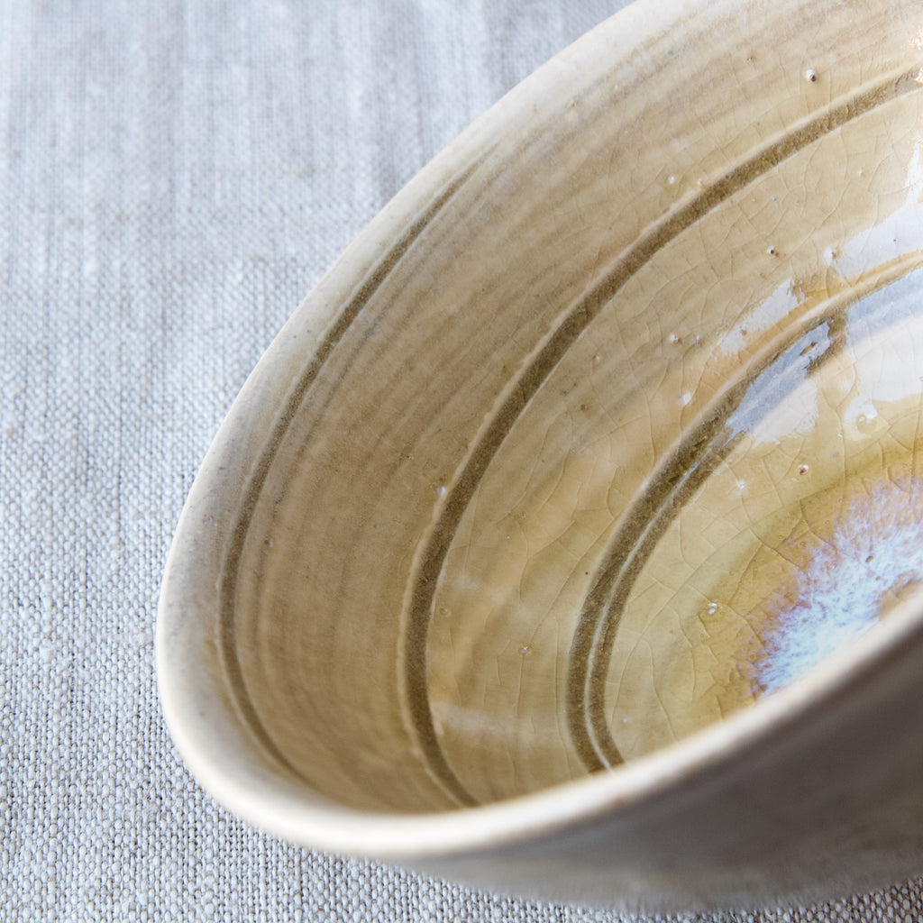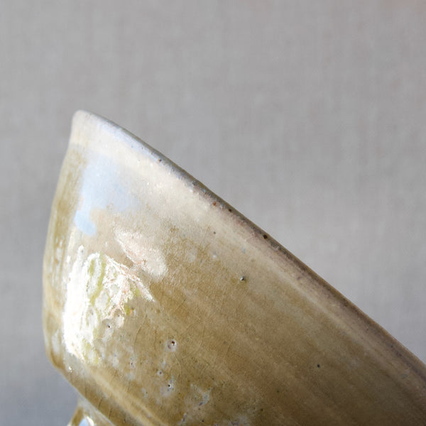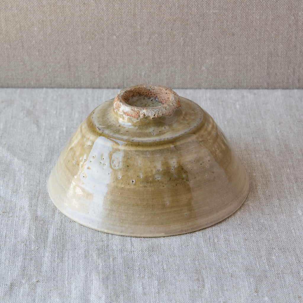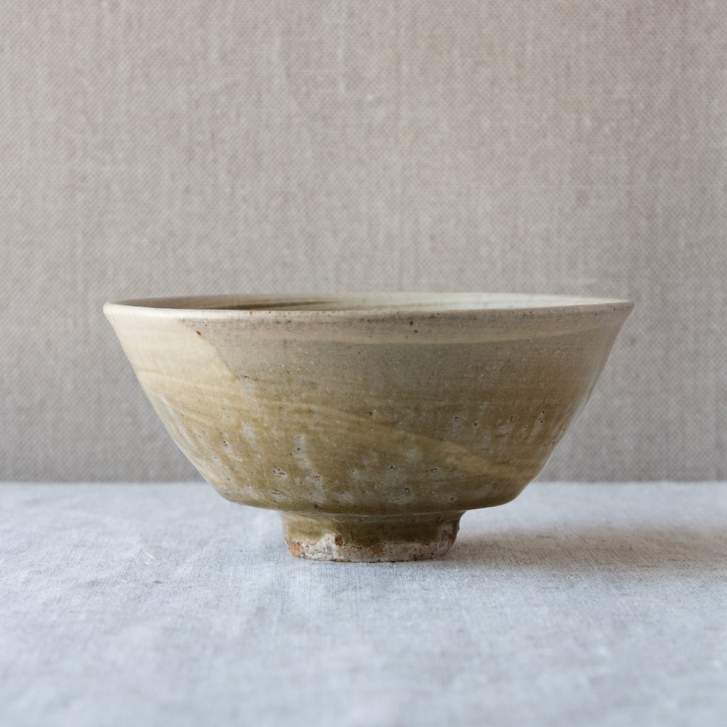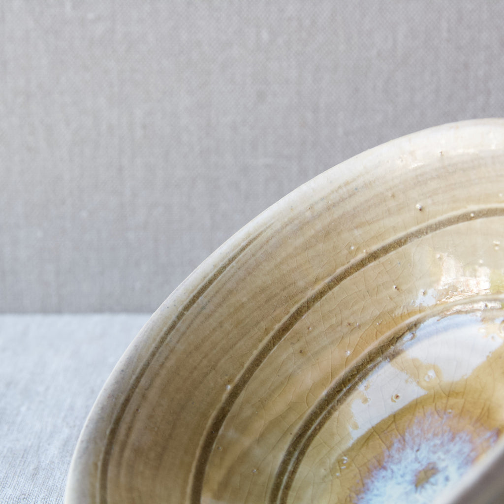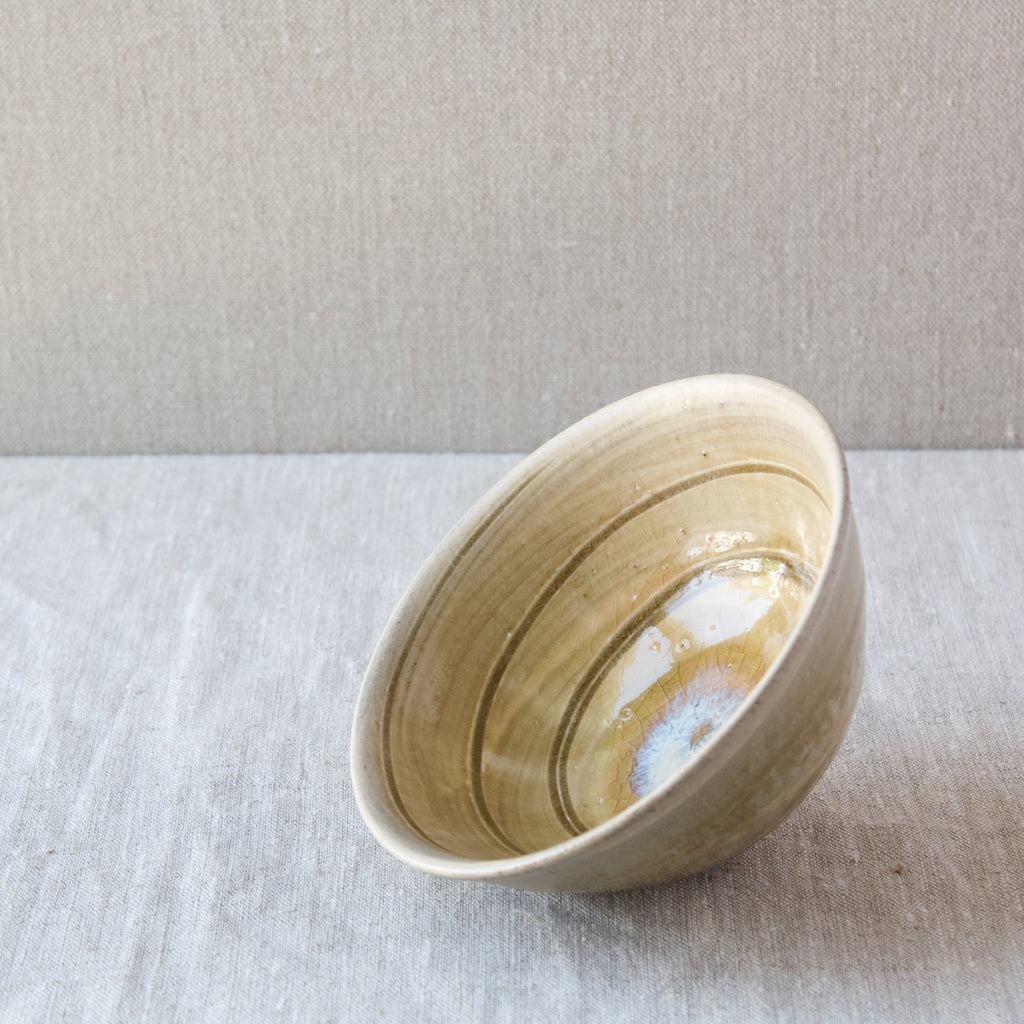 Within the channel of the spiral, the nuka glaze has been caught and created pools of glass in a warm-green colour. This ochre-sage-green has most probably been achieved by sycamore wood ash.