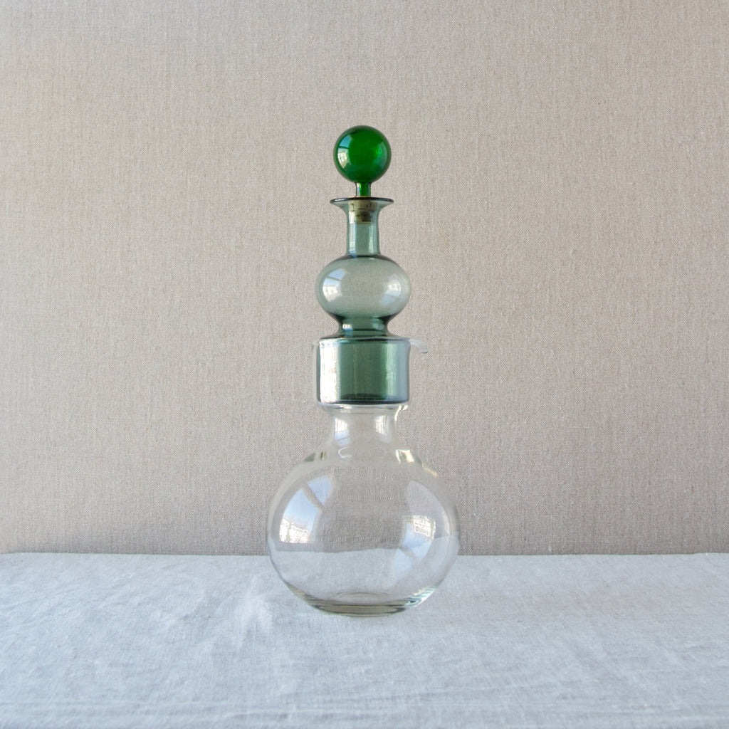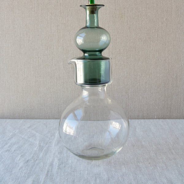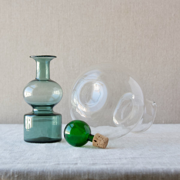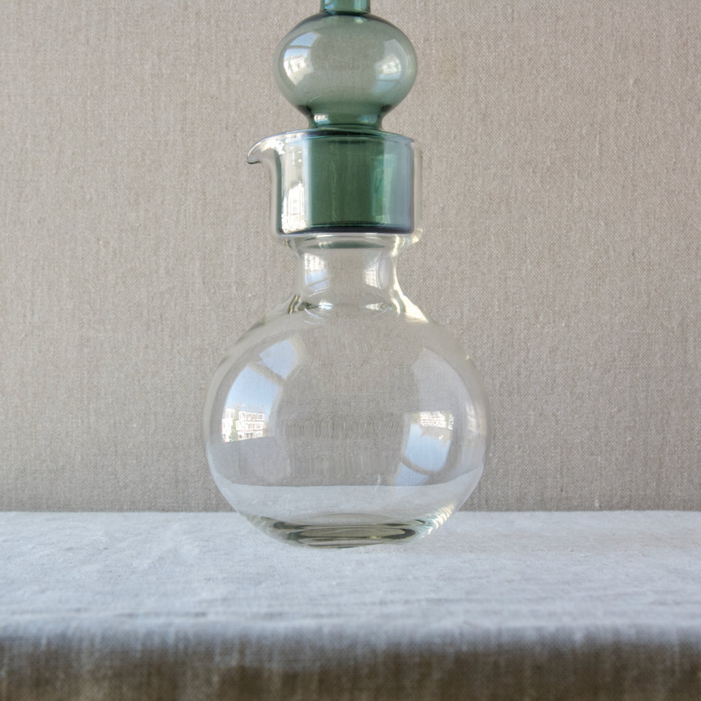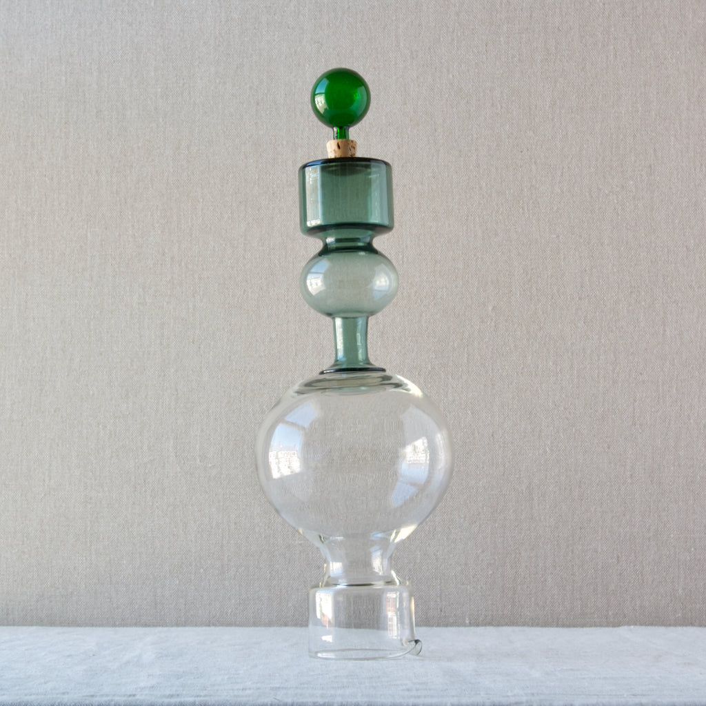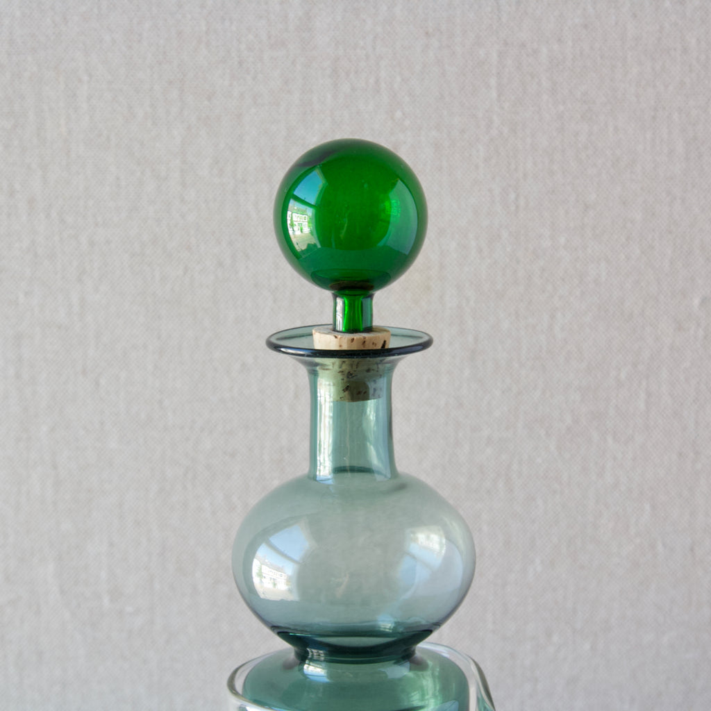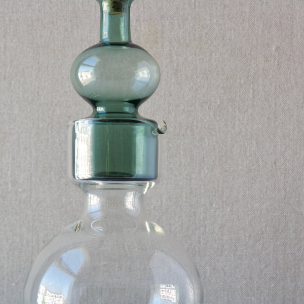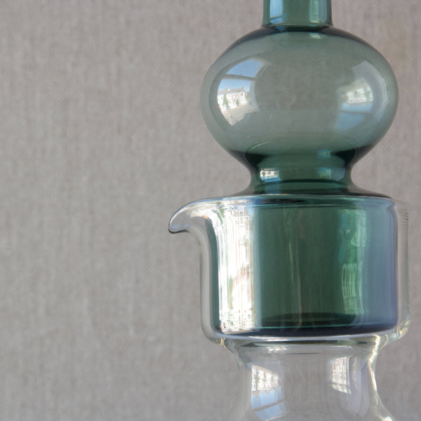A 'Kremlin Kellot' or 'Kremlin Bells' decanter in green, steel-blue, & clear glass designed by Kaj Franck for Nuutajärvi glassworks, Finland, 1957.