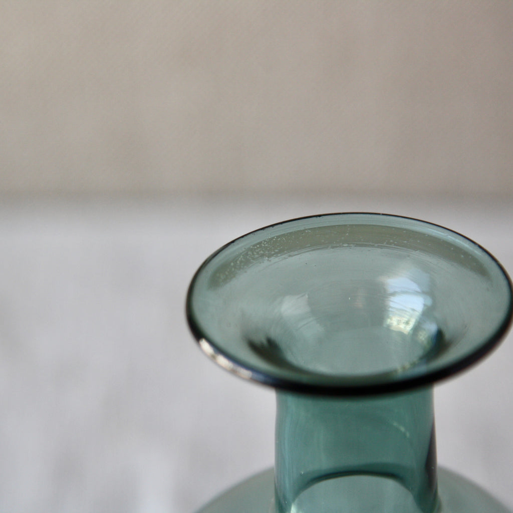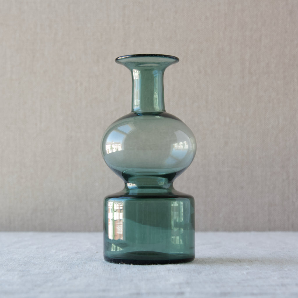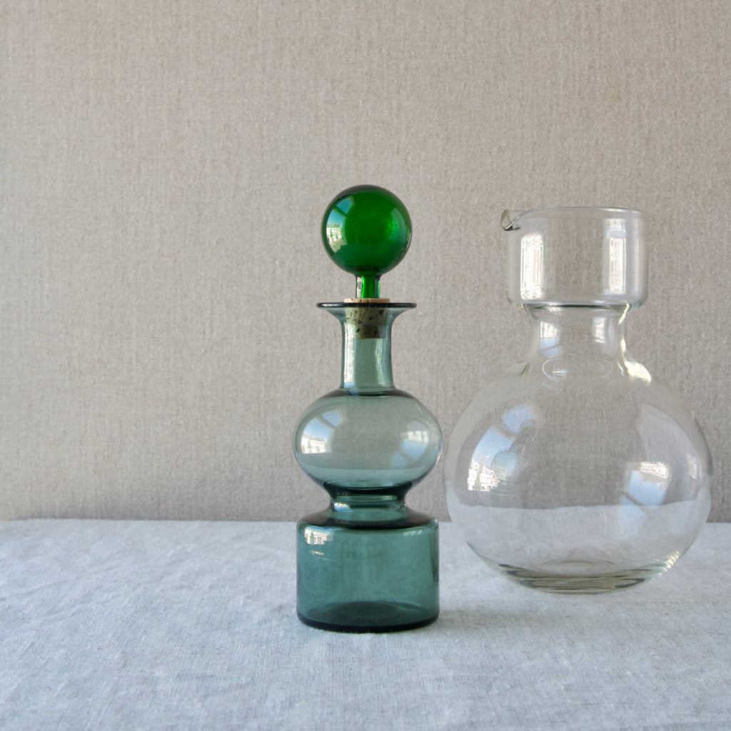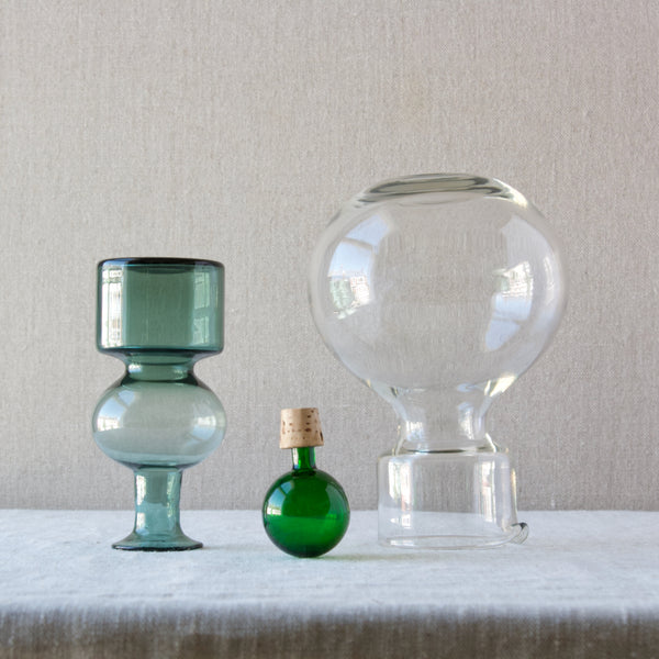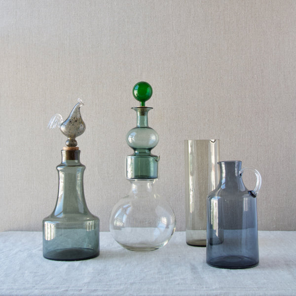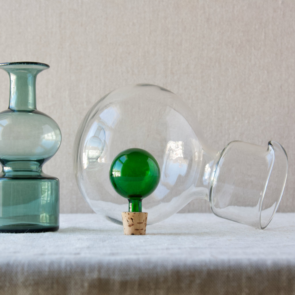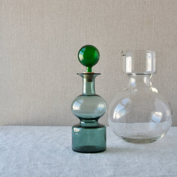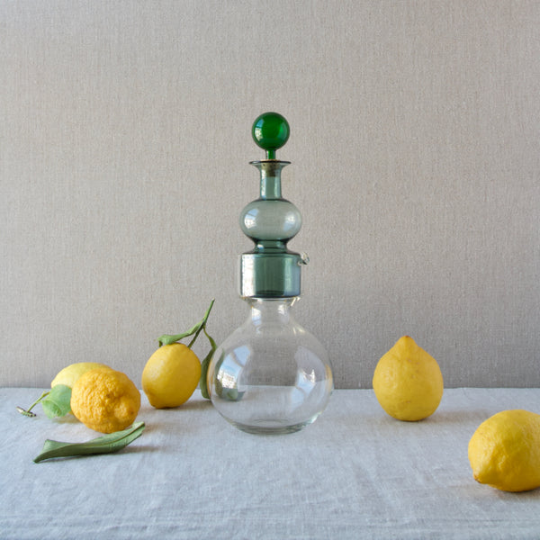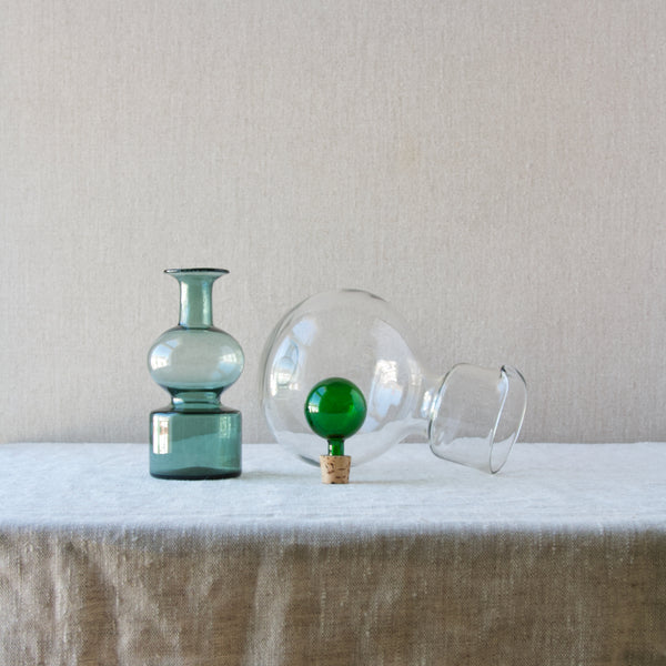 A 'Kremlin Kellot' or 'Kremlin Bells' decanter in green, steel-blue, & clear glass designed by Kaj Franck for Nuutajärvi glassworks, Finland, 1957.