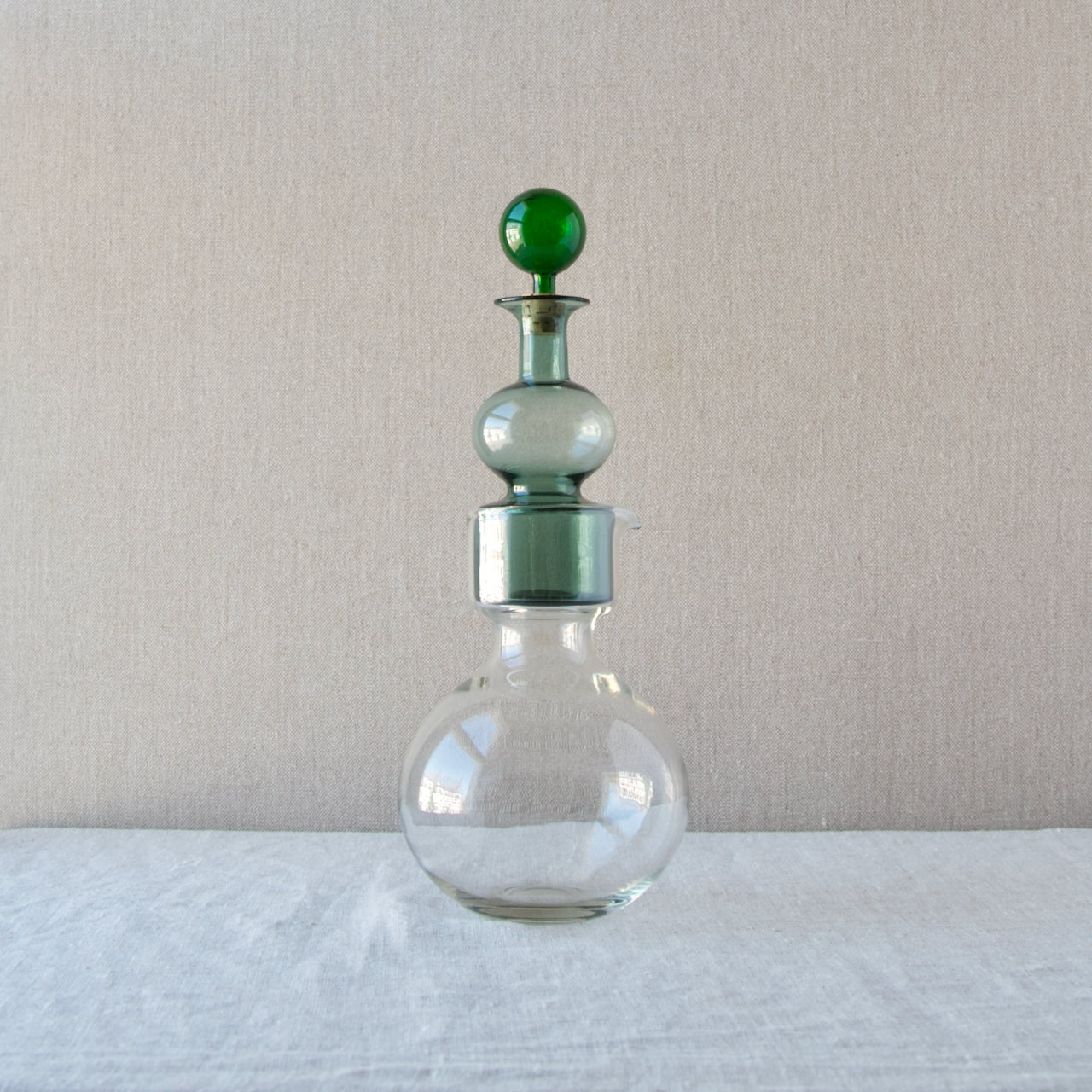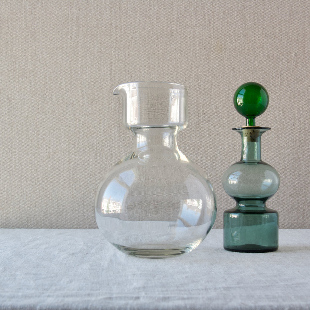 Arguably Franck’s most sought-after design, these stacking vessels were designed as a juice set. The round carafe which forms the lower section is intended to hold water, whilst the decanter with ball stopper is for juice.