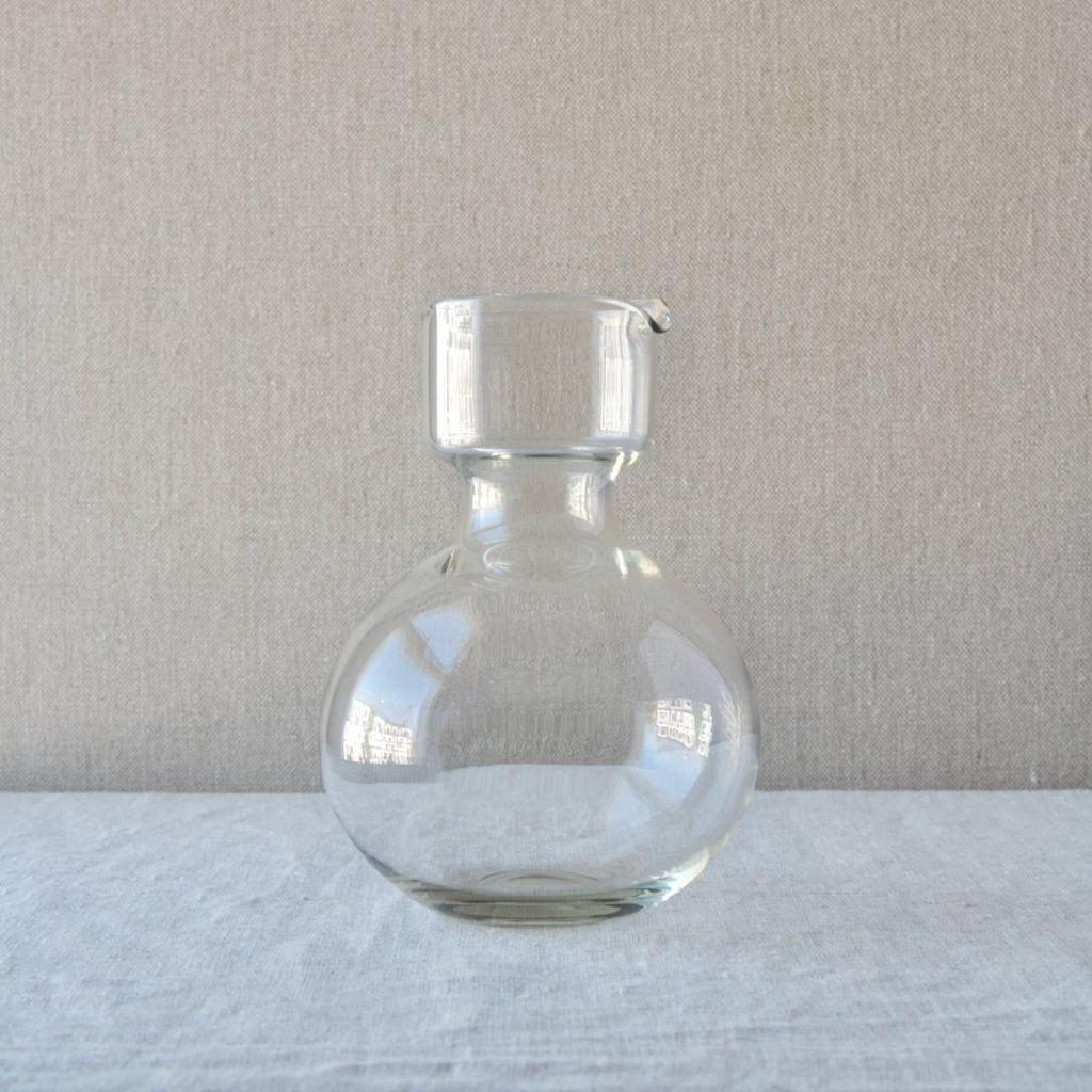 Kaj Franck's utility glassware often takes inspiration from the functional, geometric and clean form of laboratory glass. The idea of a stacking pitcher, with a small decanter placed atop a carafe, is similar to a piece of laboratory glass produced at Nuutajärvi glassworks in the mid 1800's. This antique double vessel can be found on page 73 of the National Museum of Finland's 1983 publication Nuutajärvi - Kartano Ja Lasipruuki.