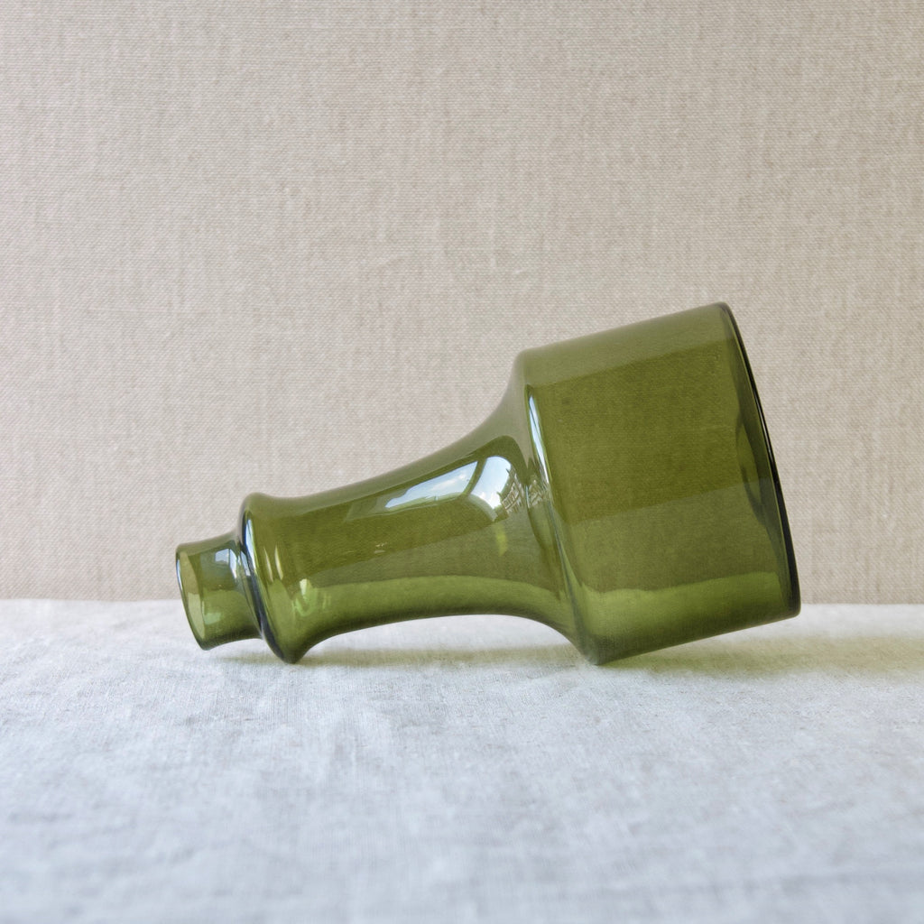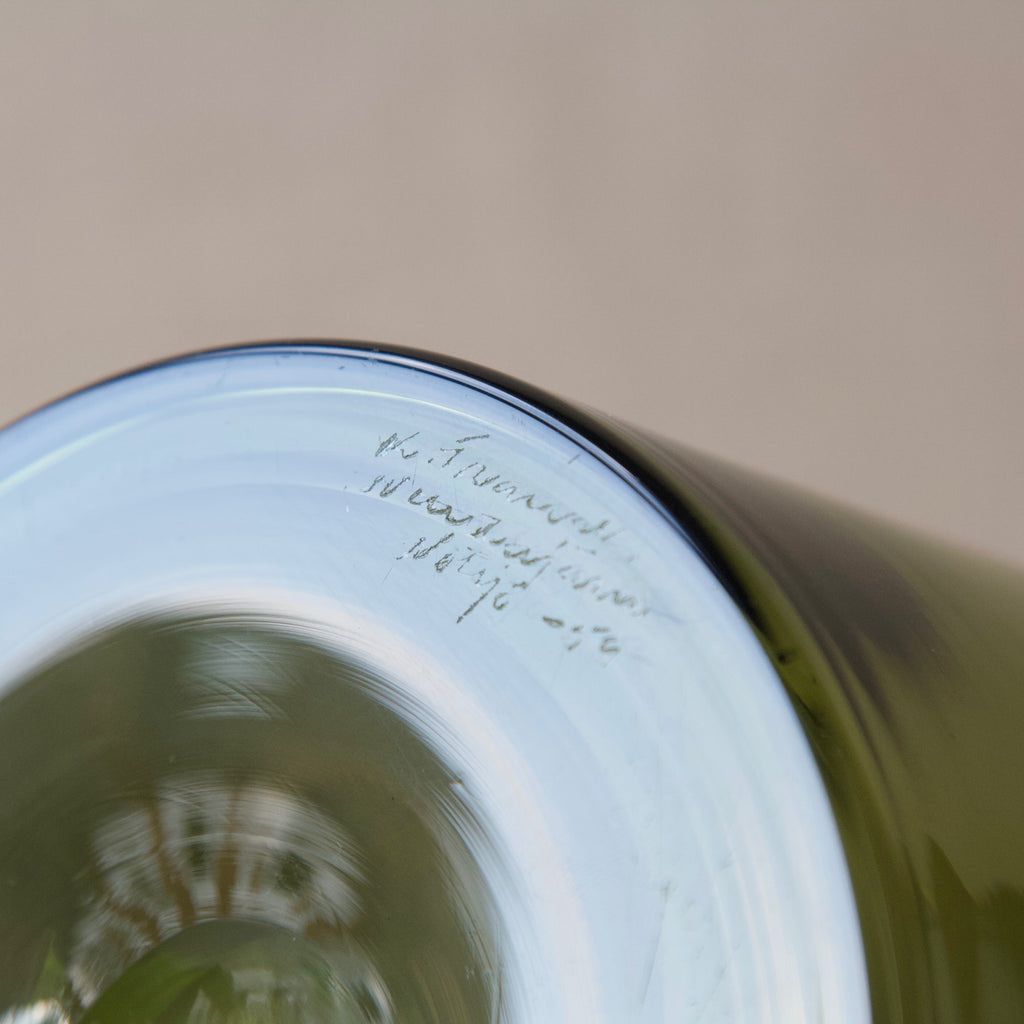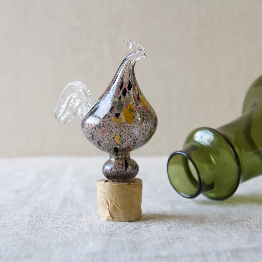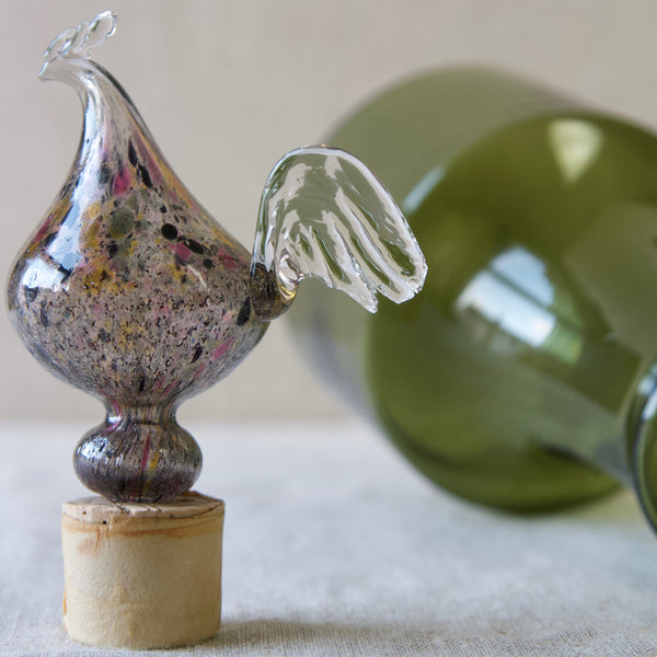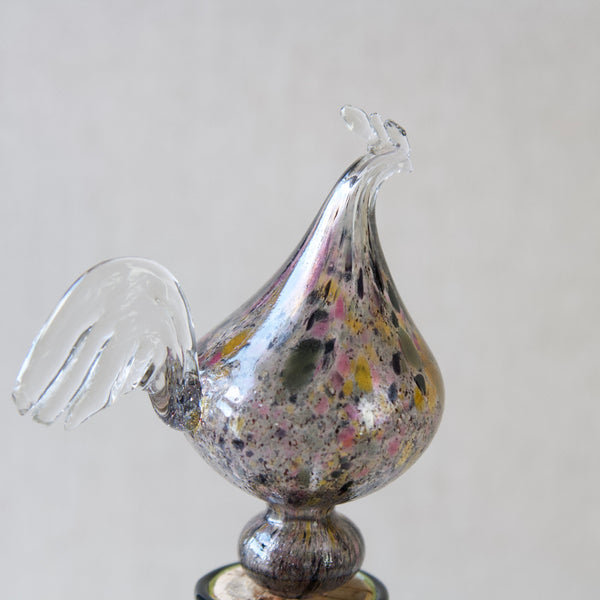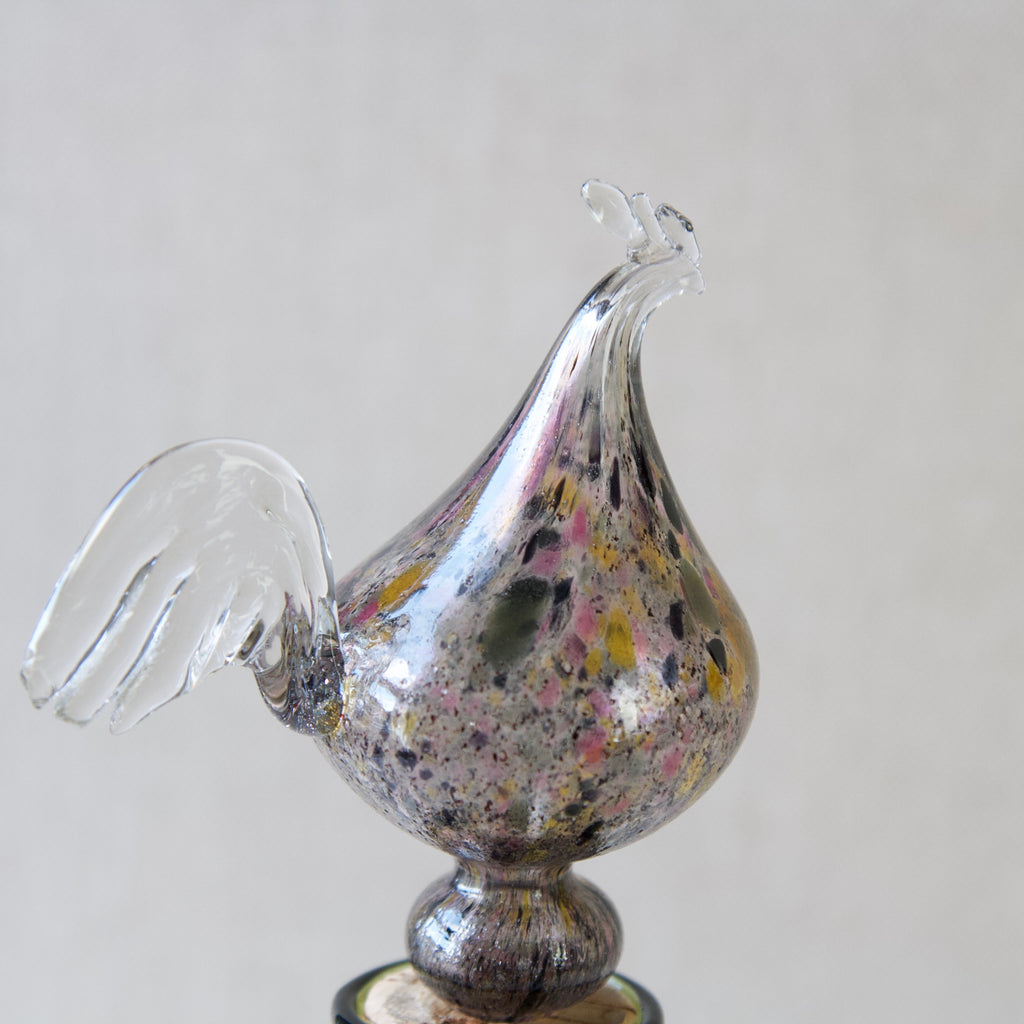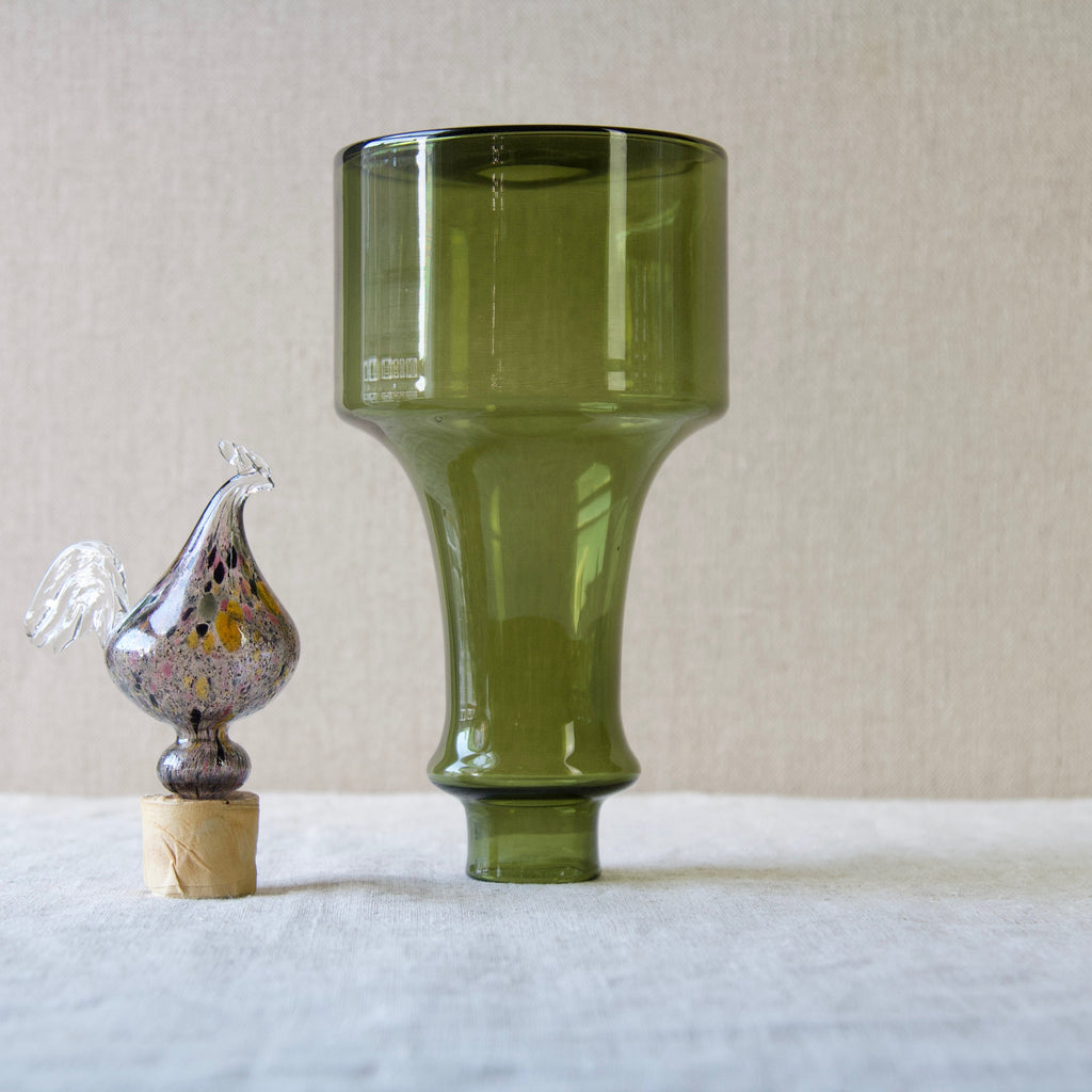 Franck took functional design and production very seriously. He attempted to solve many design problems such as stacking and standardization of form. However, at the same time he constantly explored the creative potential of glass by experimenting with different techniques, shapes, and pigments. In the Kukkopullo we see the result of Franck’s engagement in the two divisions. Marrying austere form with chair-worked glass sculpture the Rooster bottle is a successful synthesis of the art & utility departments. The Kukkopullo is a great illustration of how Franck's career typifies the now revered Nordic approach to industrial glass design in the mid-20th century.
