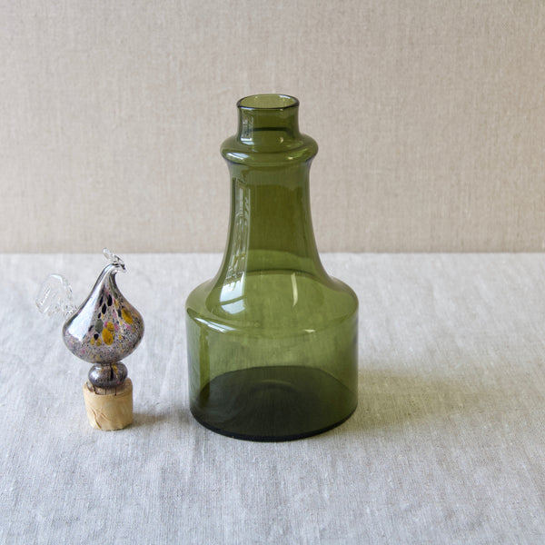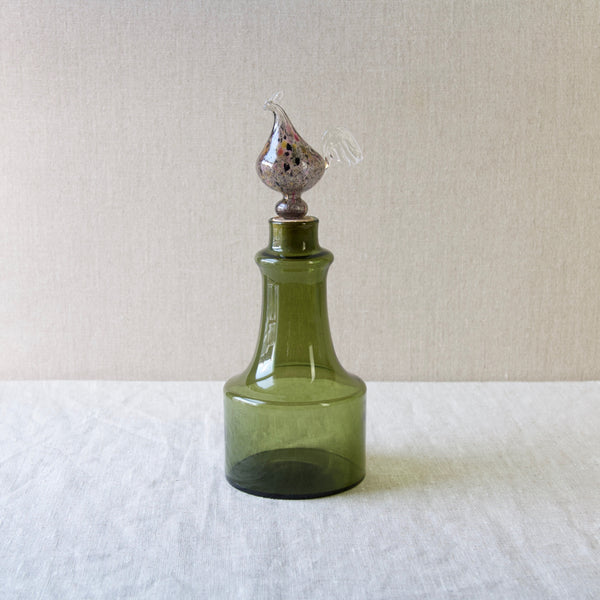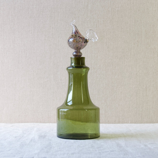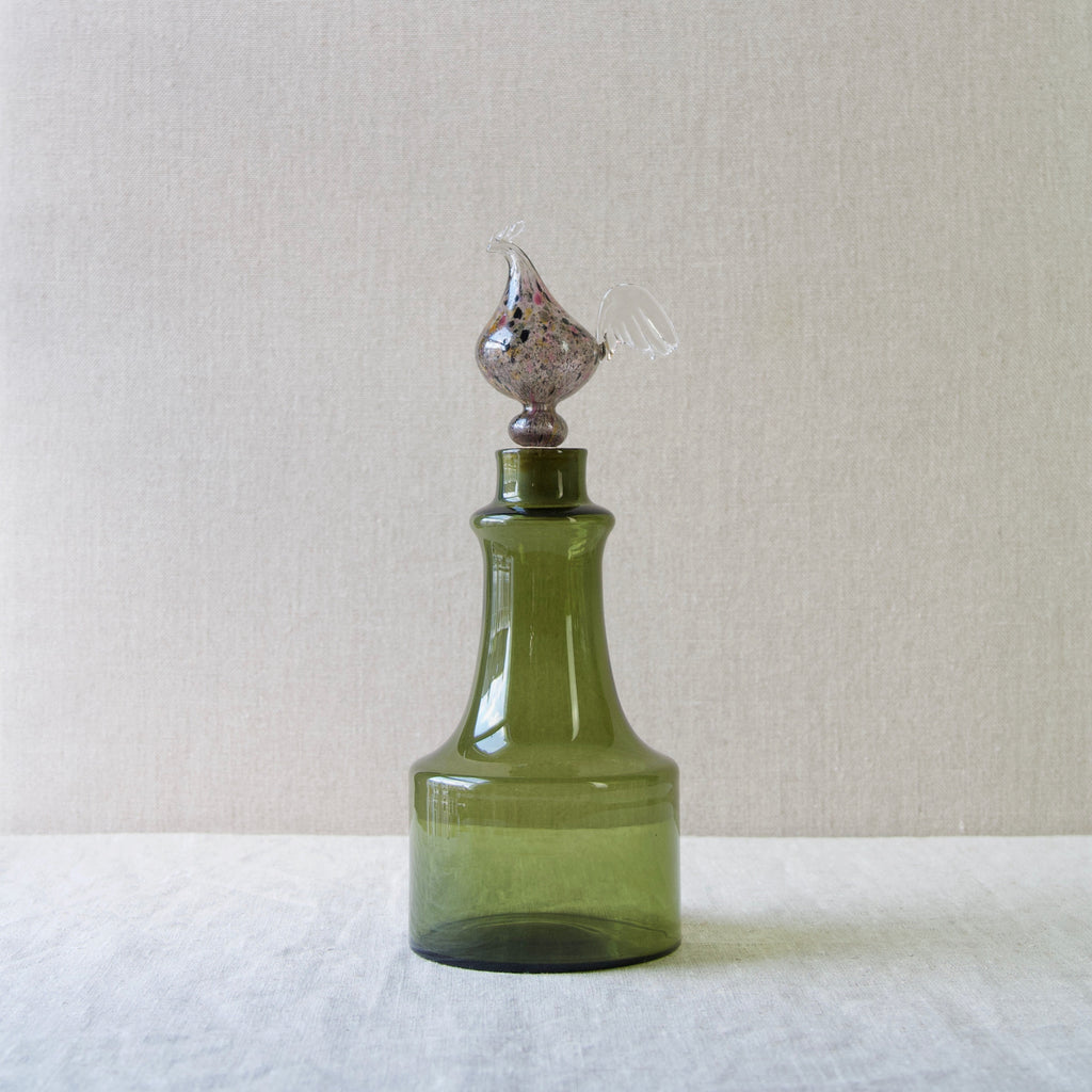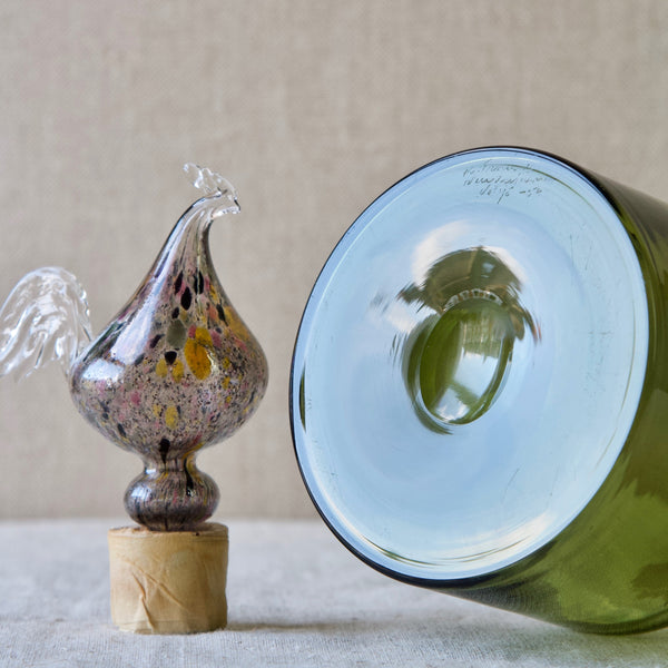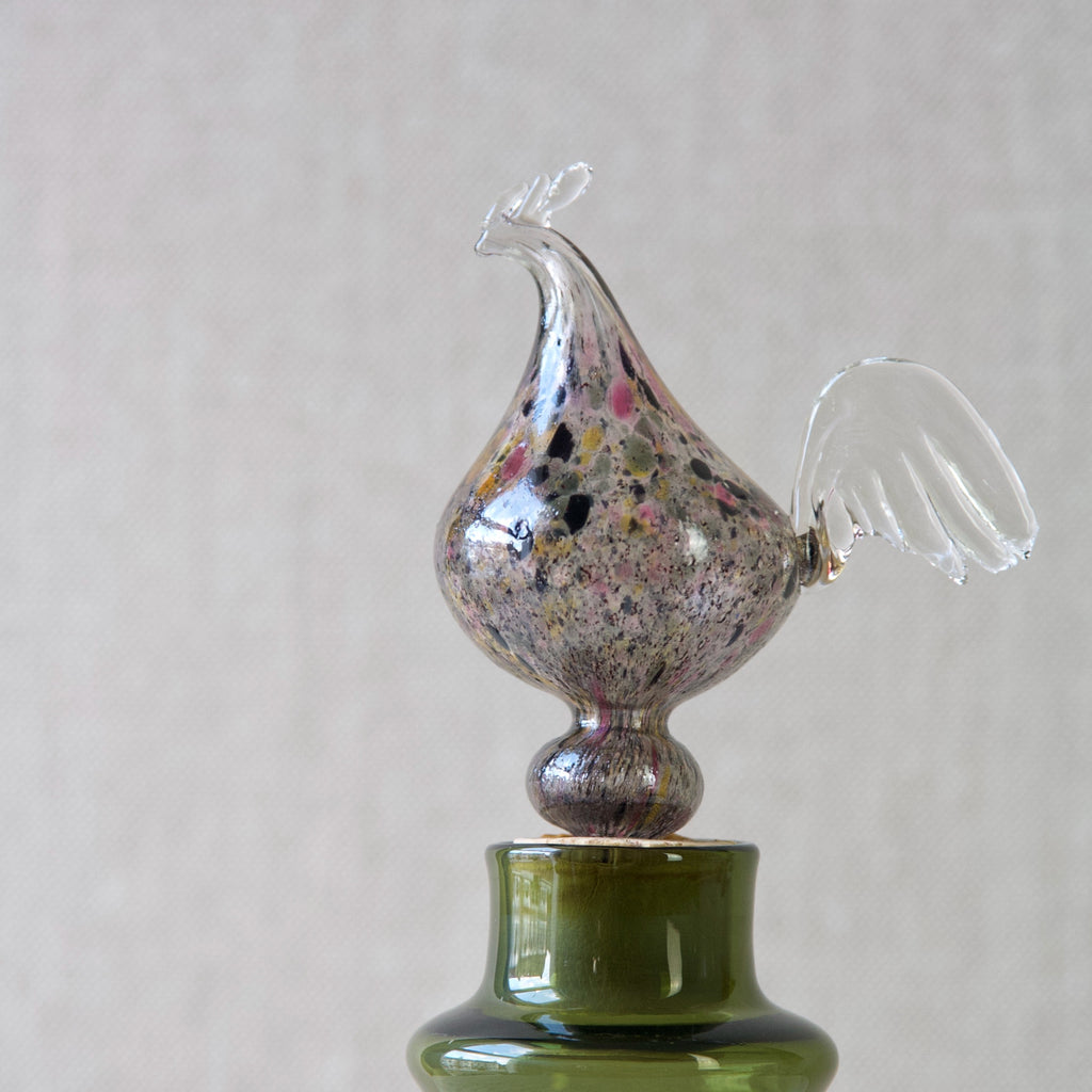 A "Kukkopullo" or “Rooster bottle” designed by Kaj Franck for Nuutajärvi Notsjö, Finland. The body of the turn mould-blown vessel is in olive green. The free-blown, tool-formed speckled bird is multicoloured.
