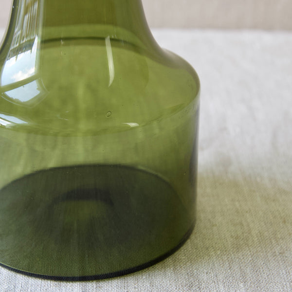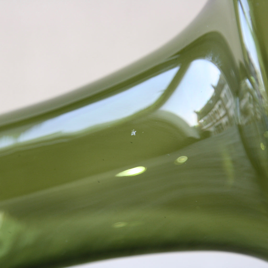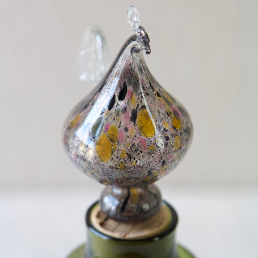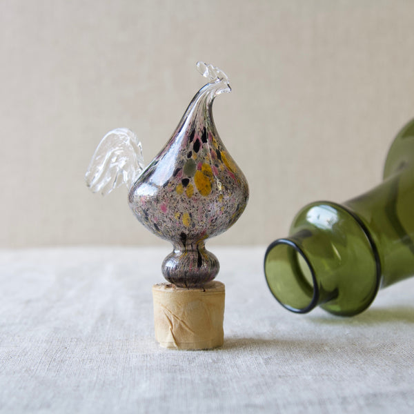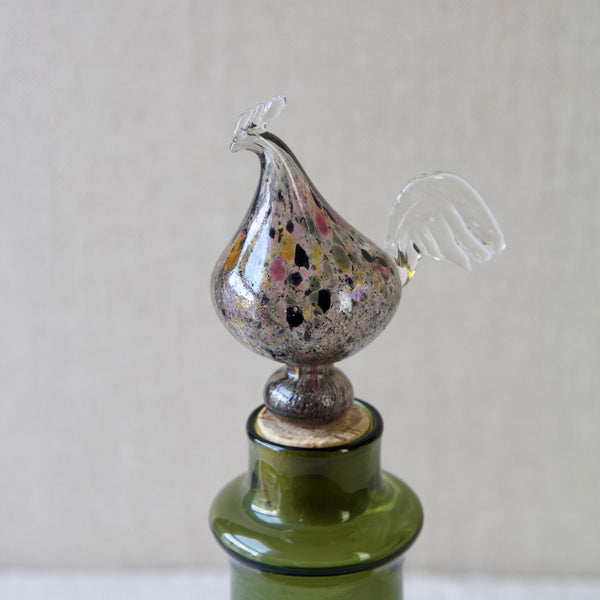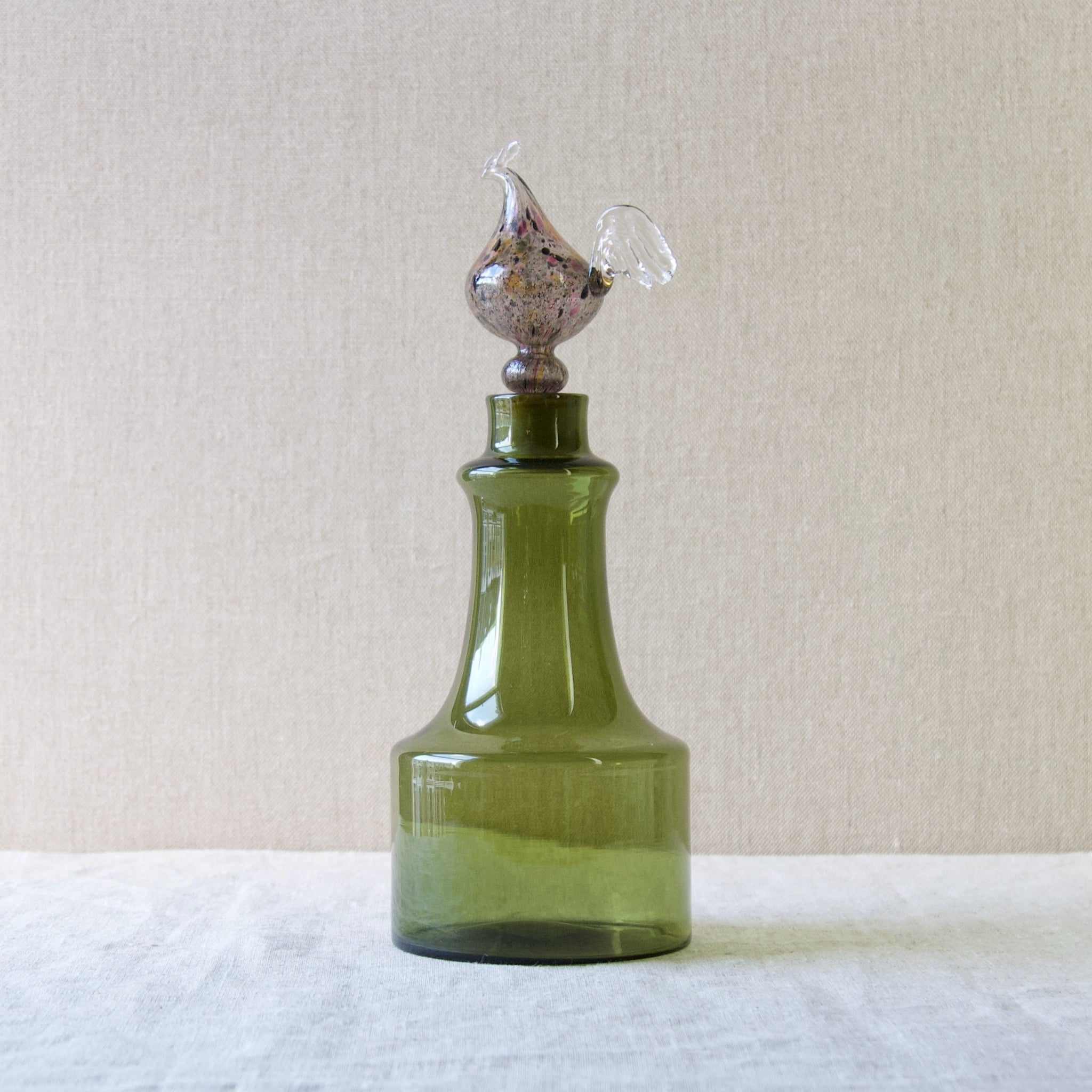 A "Kukkopullo" or “Rooster bottle” designed by Kaj Franck for Nuutajärvi Notsjö, Finland. The body of the turn mould-blown vessel is in olive green. The free-blown, tool-formed speckled bird is multicoloured.