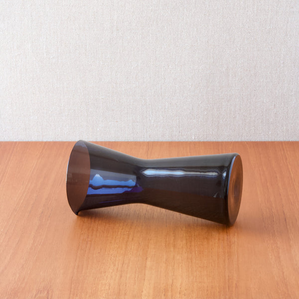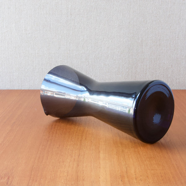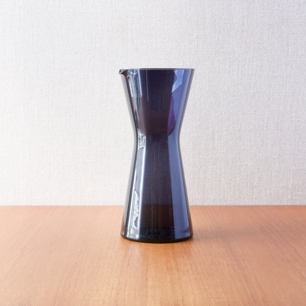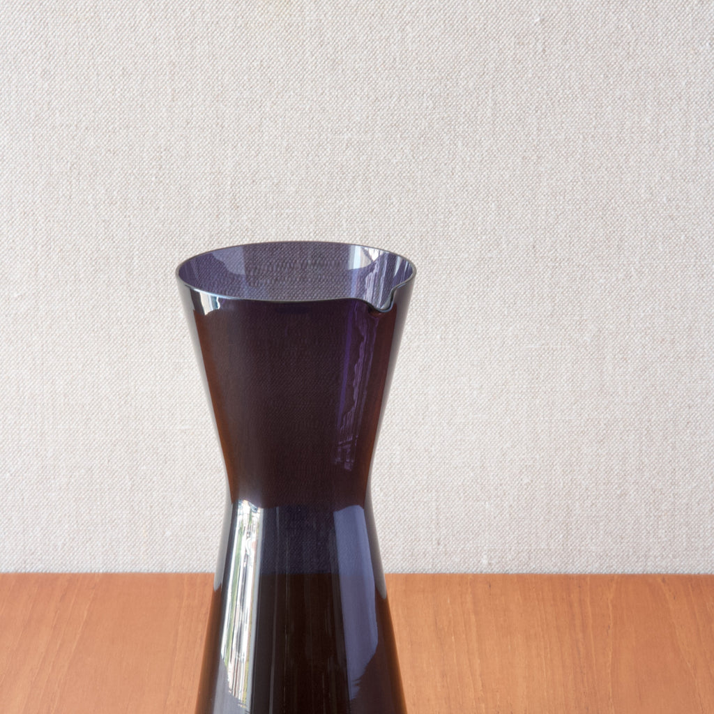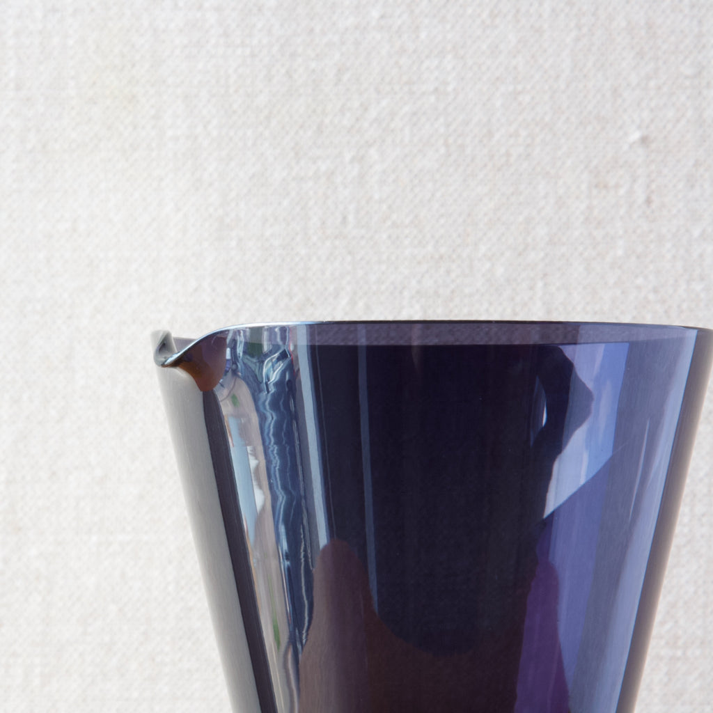 A deep purple coloured glass cocktail pitcher with an hourglass or diablo shaped geometric form, designed by Kaj Franck in 1954.