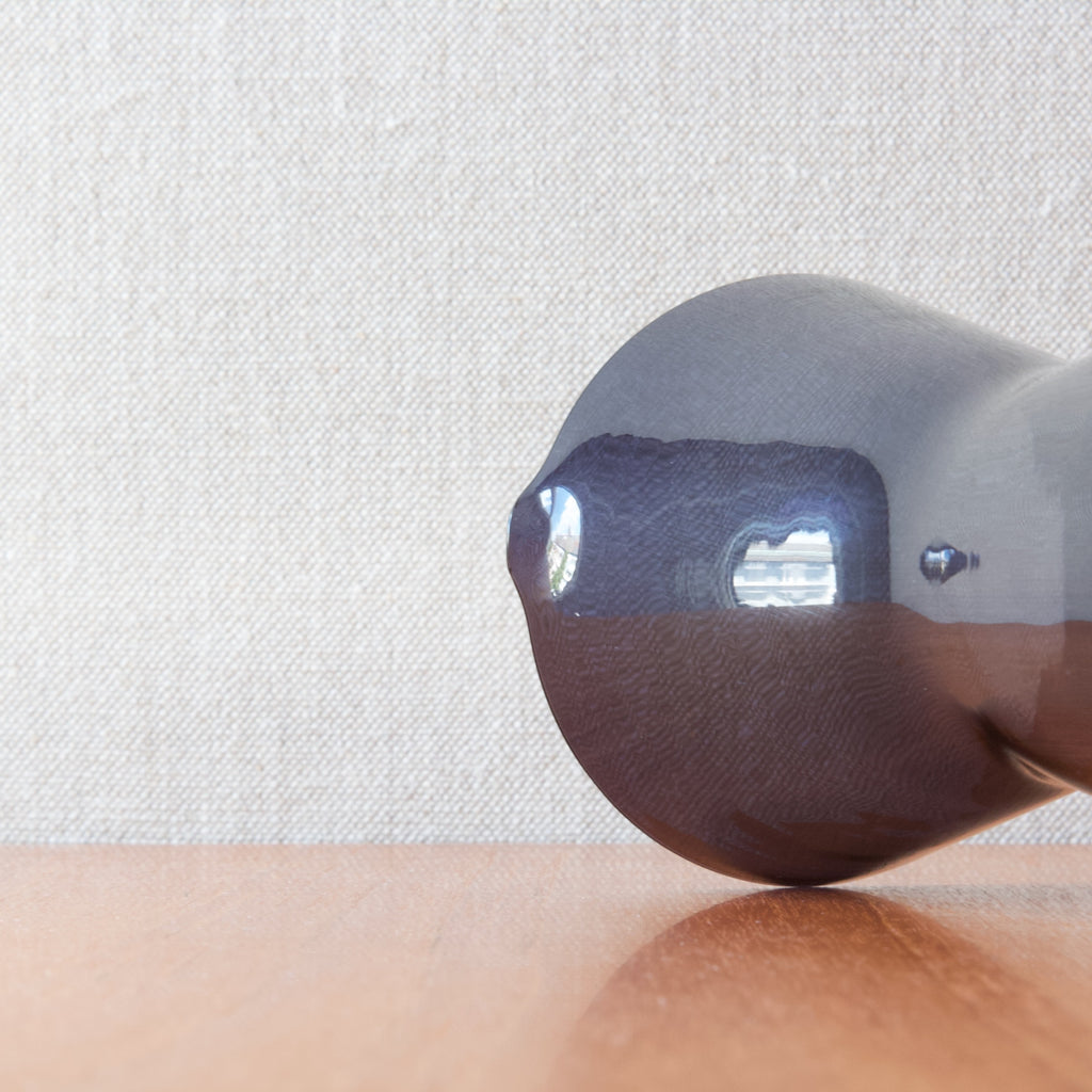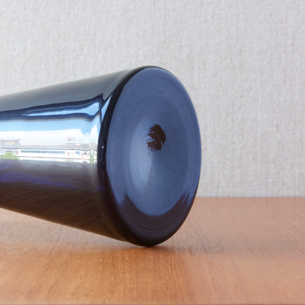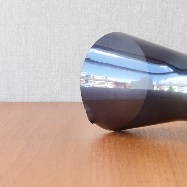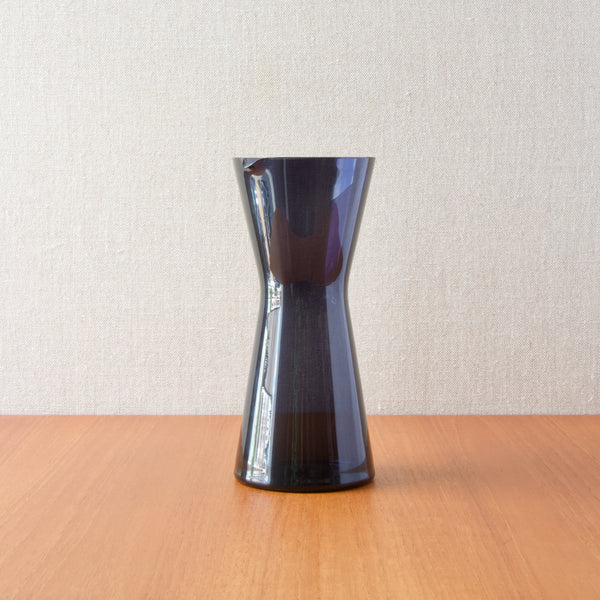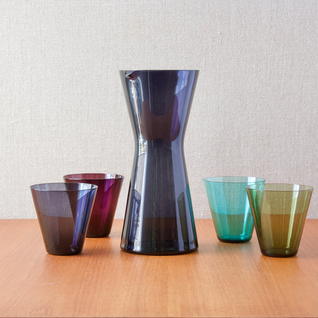 A deep purple coloured glass cocktail pitcher with an hourglass or diablo shaped geometric form, designed by Kaj Franck in 1954.