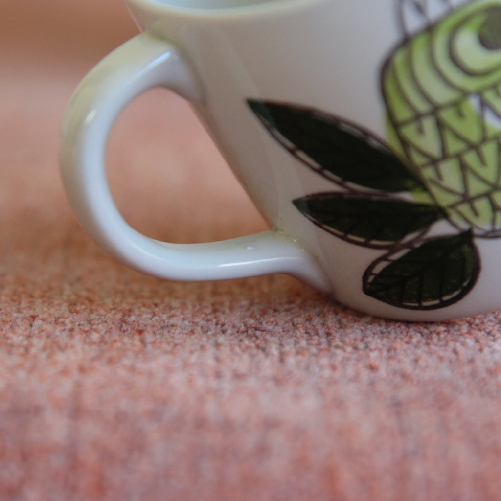 The geometric form of the cup is Rörstrand’s classic model, delicately shaped and weighted with a graceful & comfortable handle. Its crisp white porcelain base provides an ideal canvas for this exquisite pattern, one of many created by Westman, whose designs accounted for almost half of Rörstrand’s production during the company’s heyday in the mid-20th century.