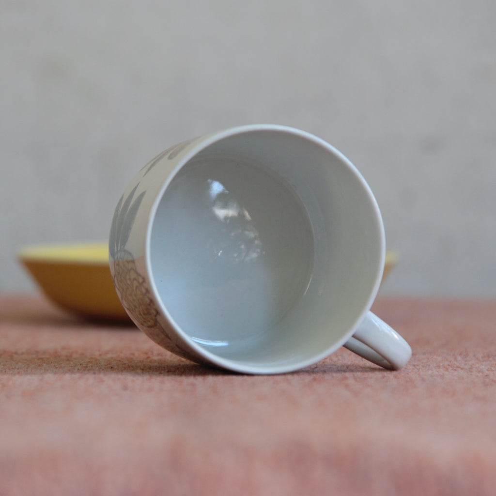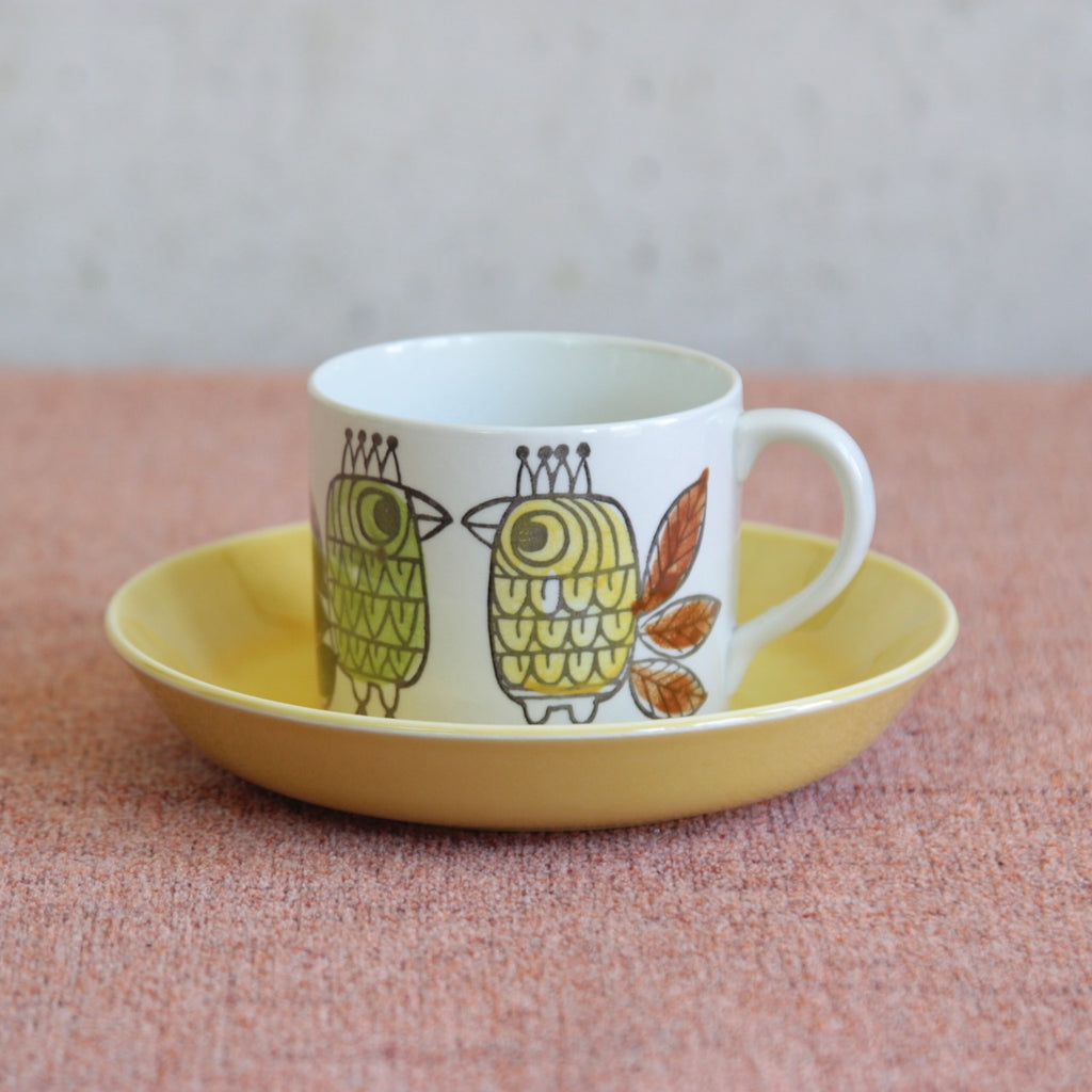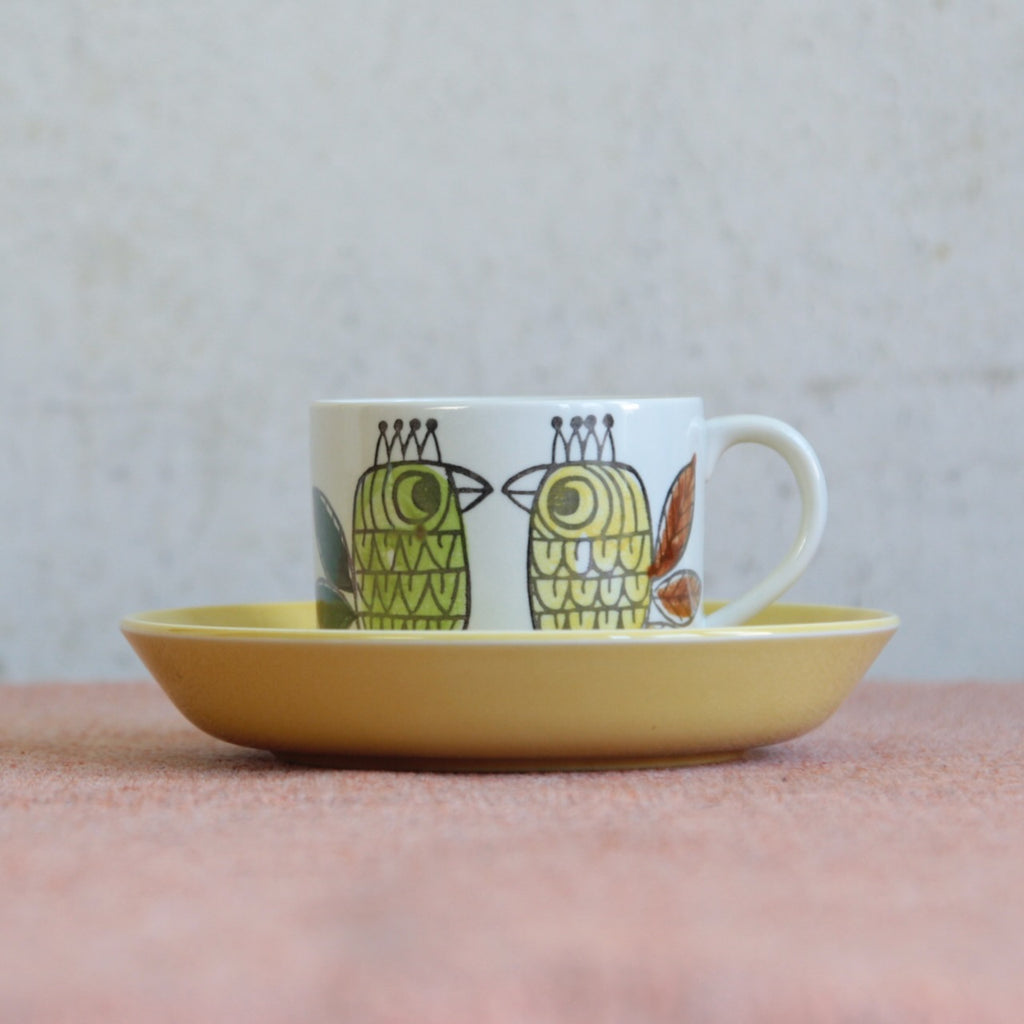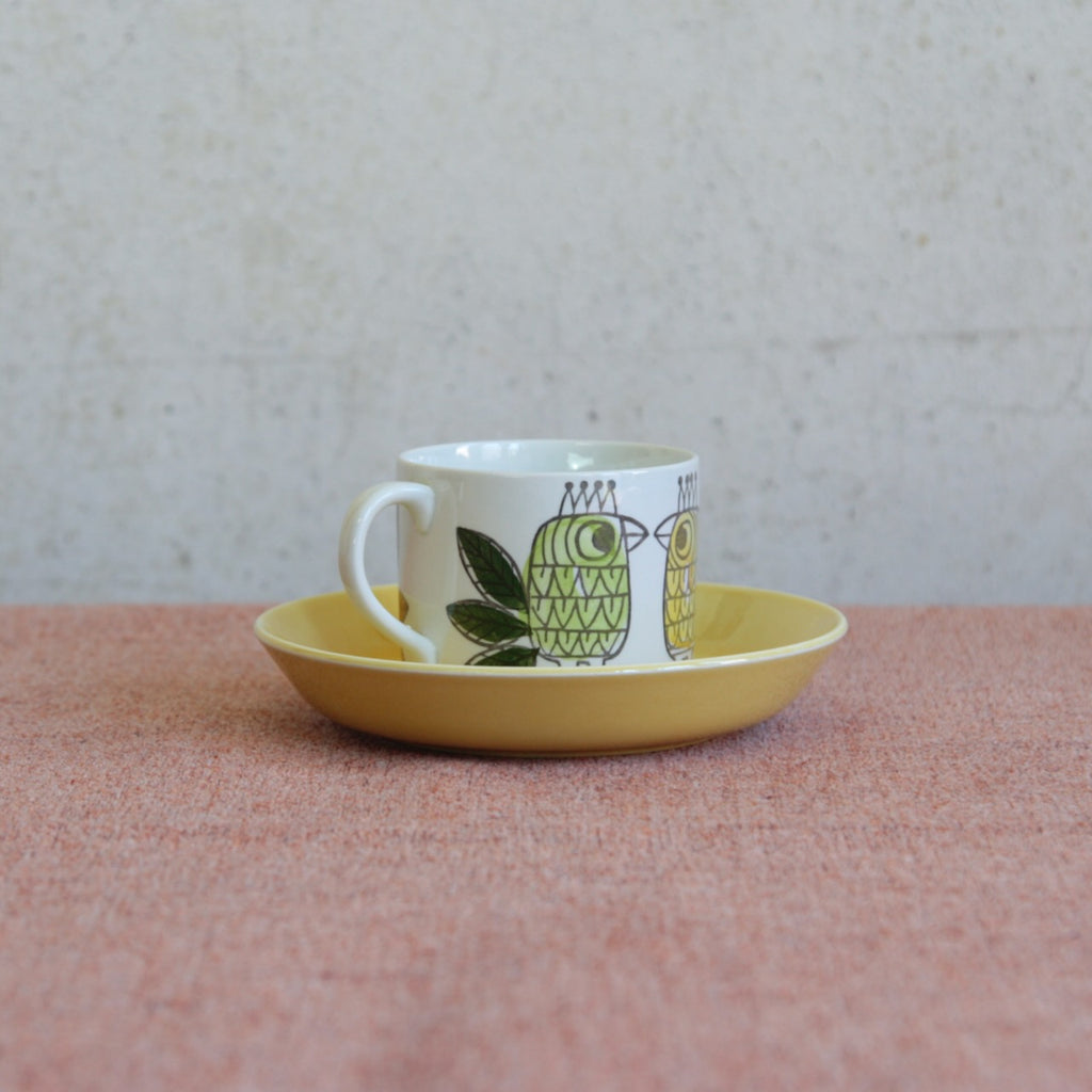 The 1960s Op Art inspired renderings of the birds have been painted in contrasting colours. One bird has a lime green body and leaf green tail feathers whilst their friend is lemon yellow and ruby red. The accompanying saucer, a perfect complement to the cup, is glazed with a pastel yellow colour.