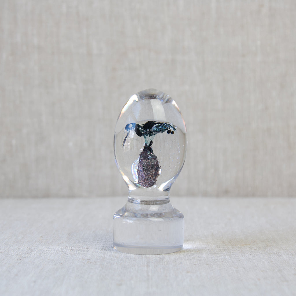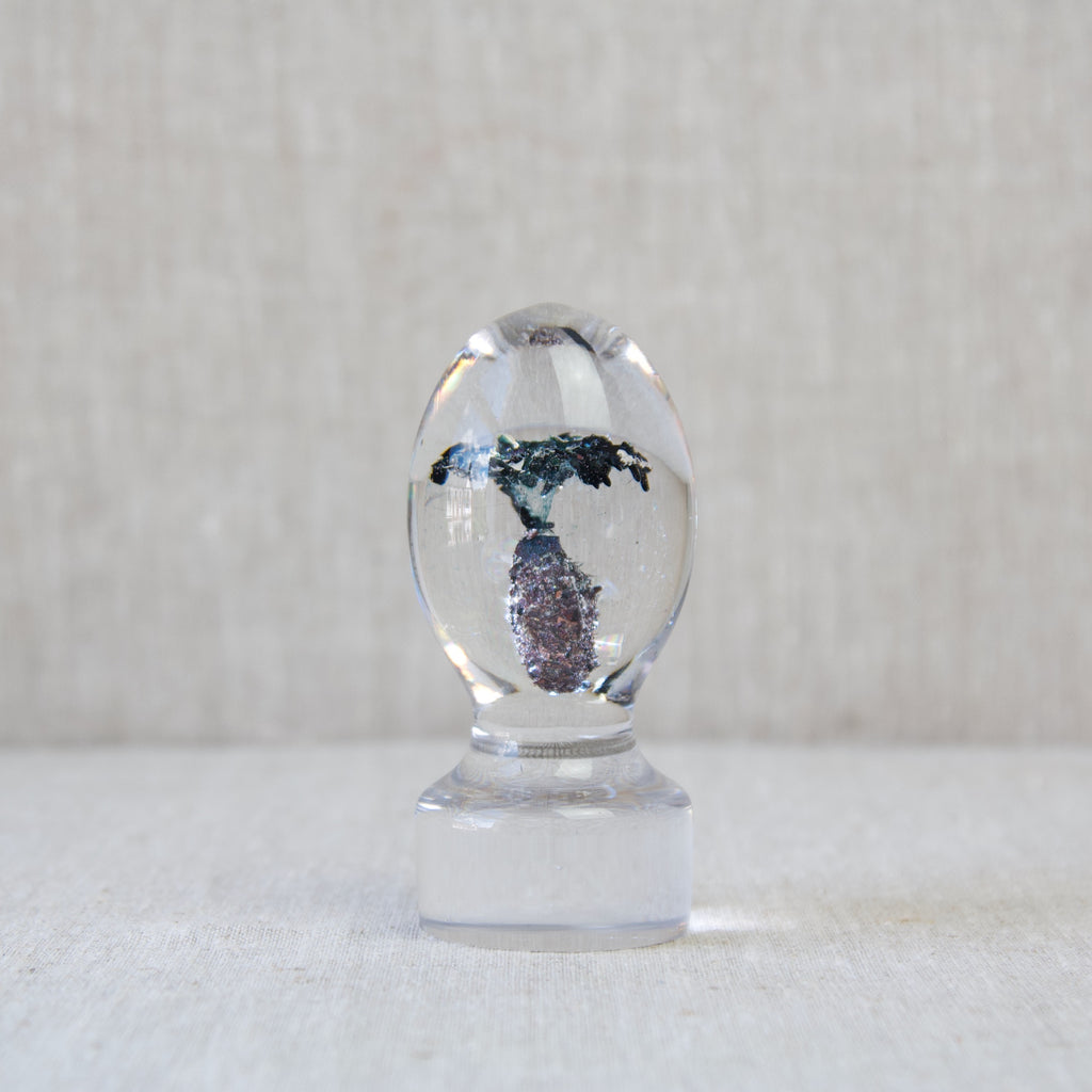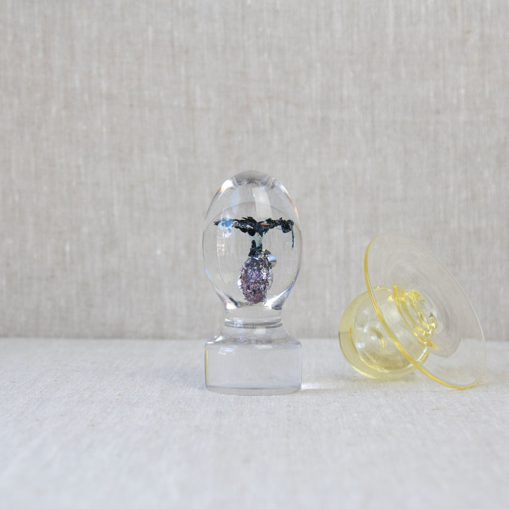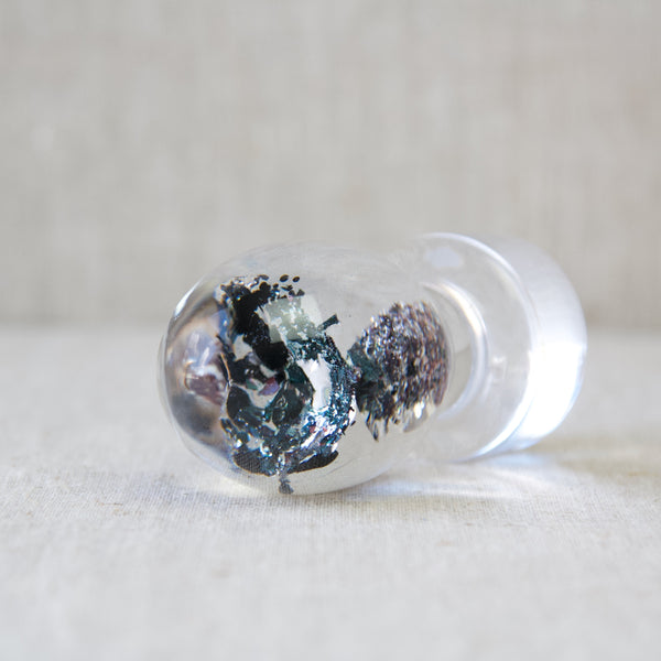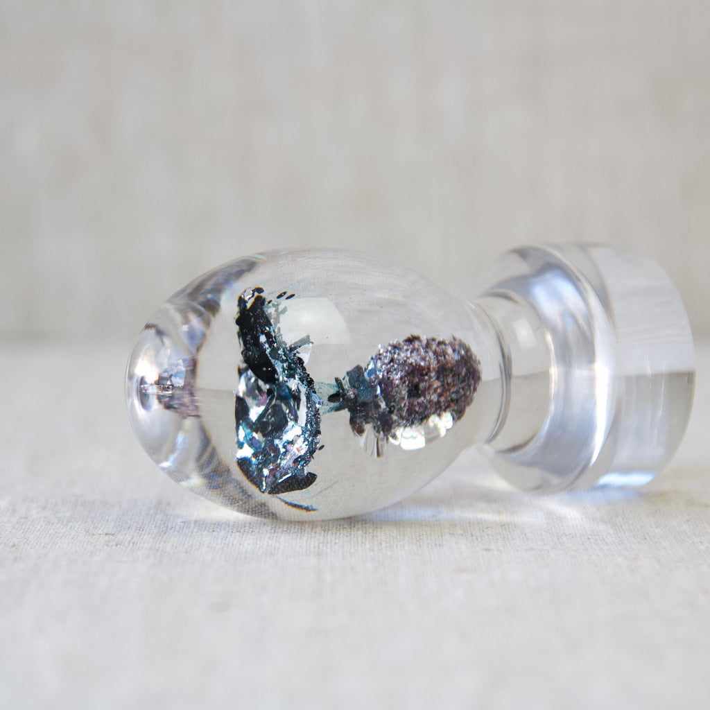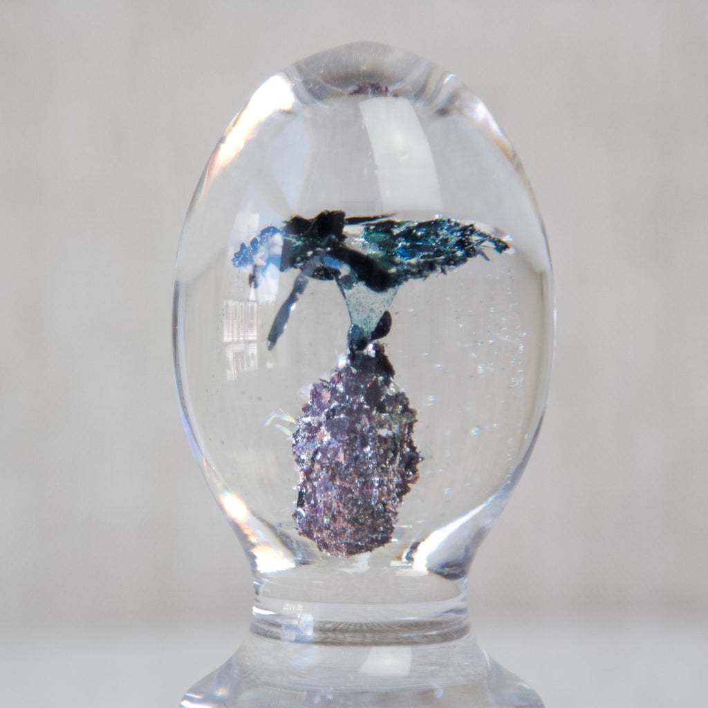 Encased within the glass object are inclusions of coloured metallic flakes. They have been arranged in the manner of an atomic bomb, to emulate the dramatic, explosive sporing of a puffball.
