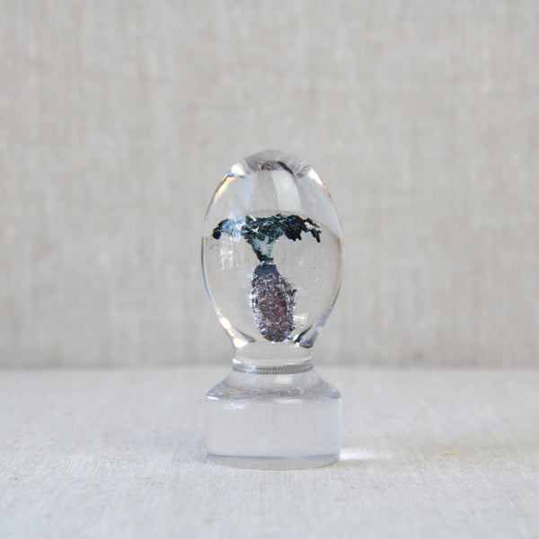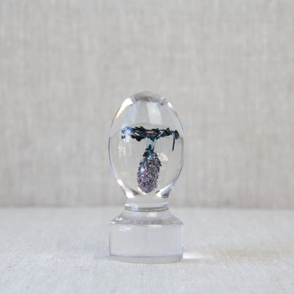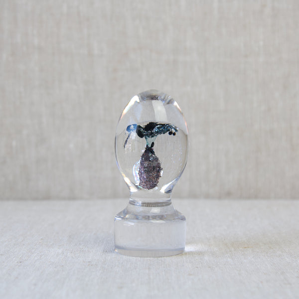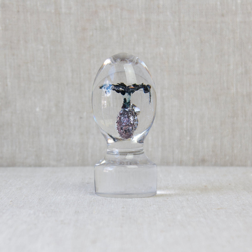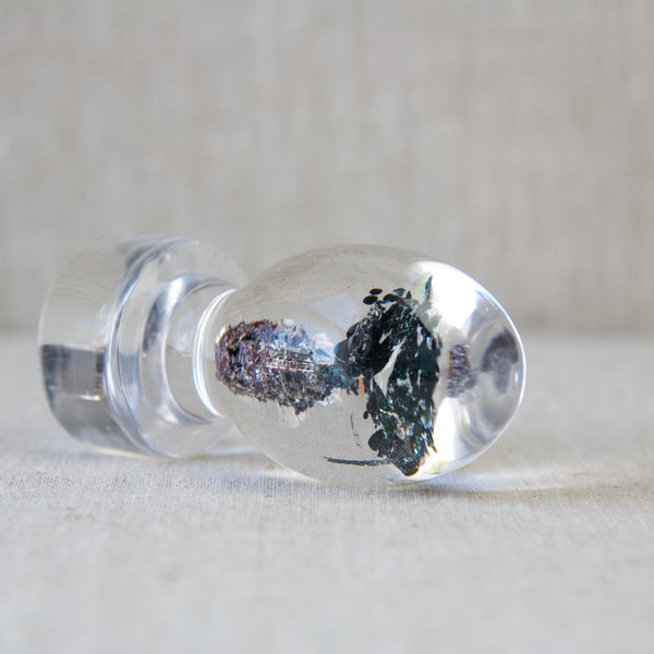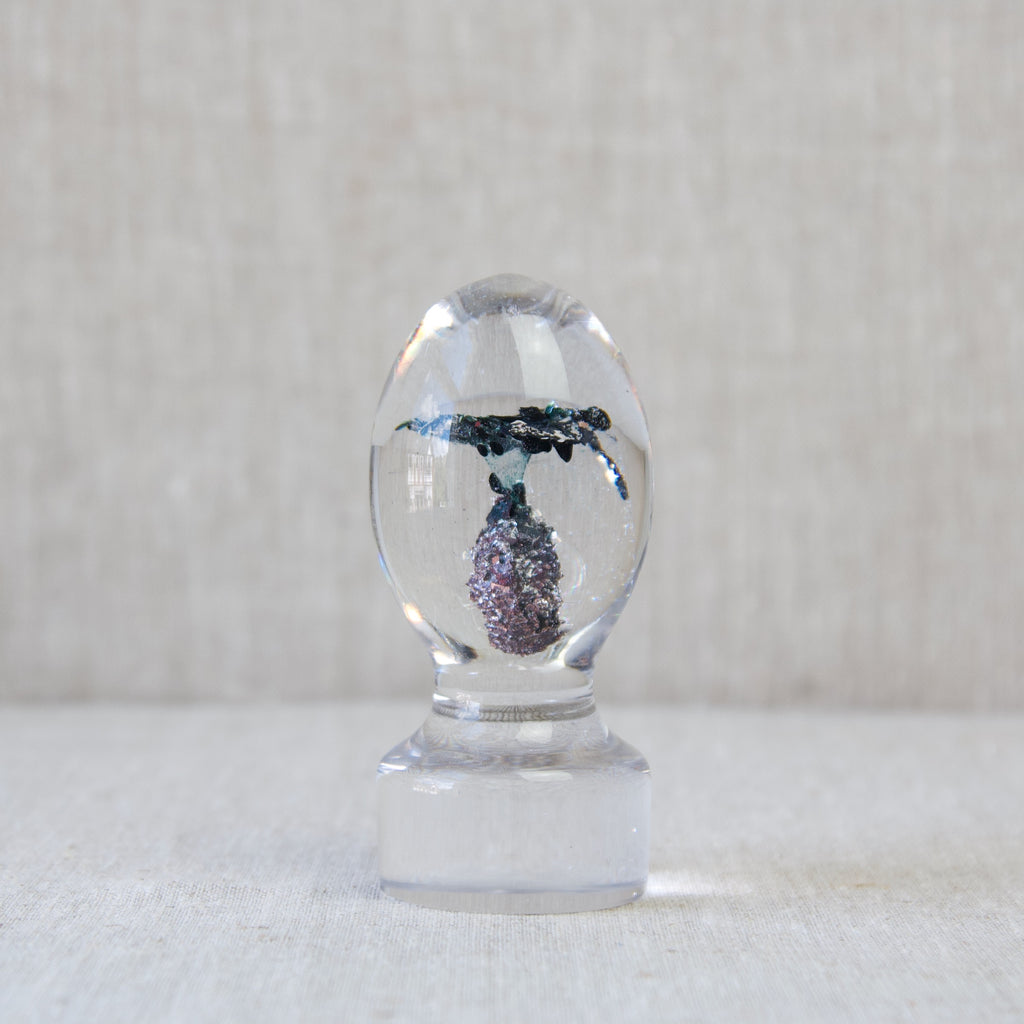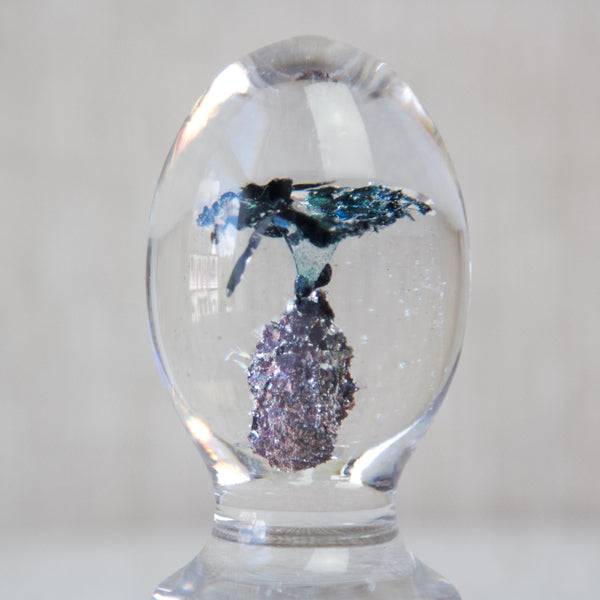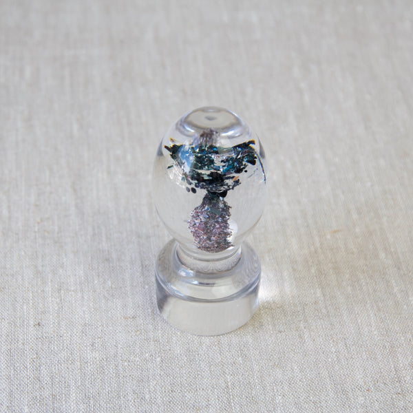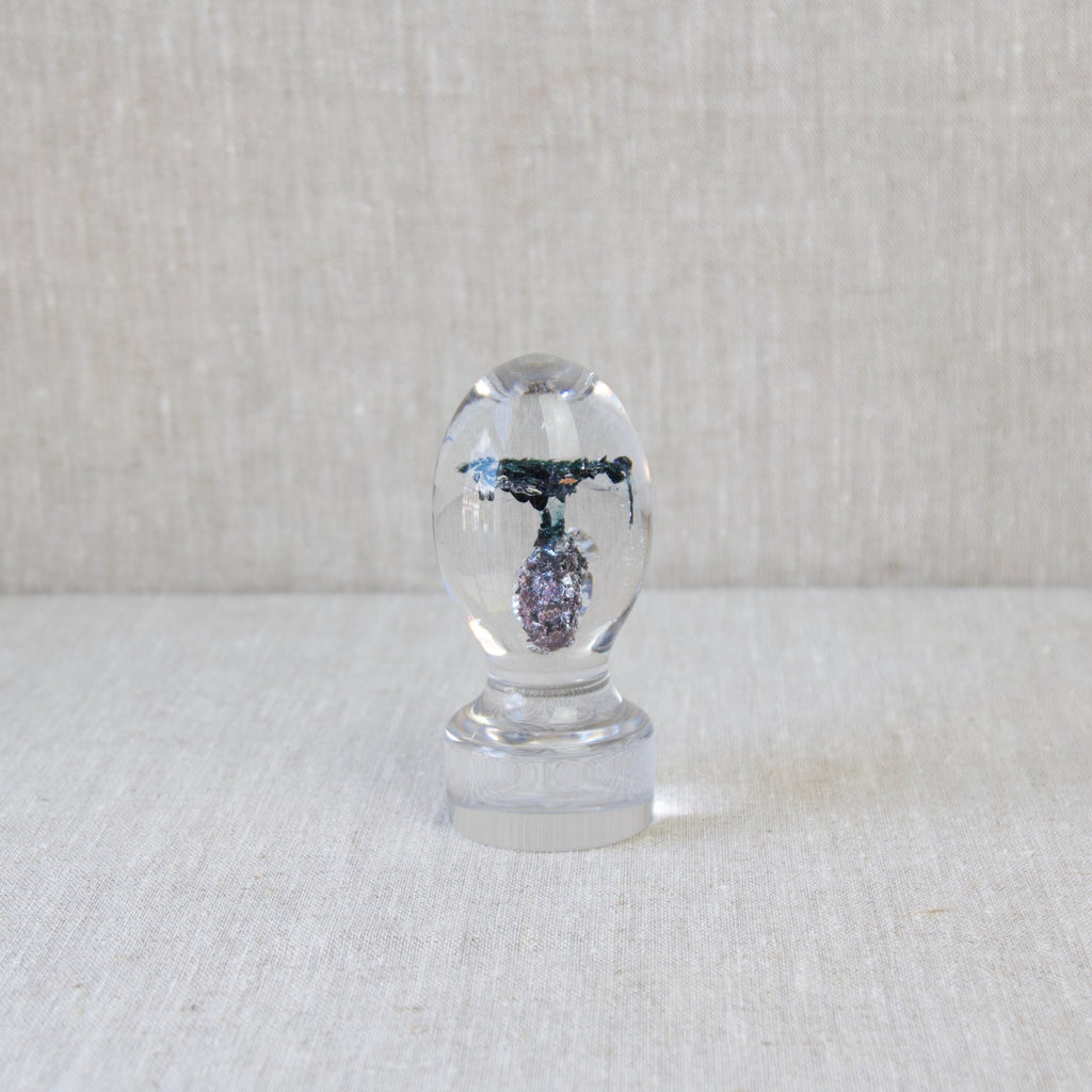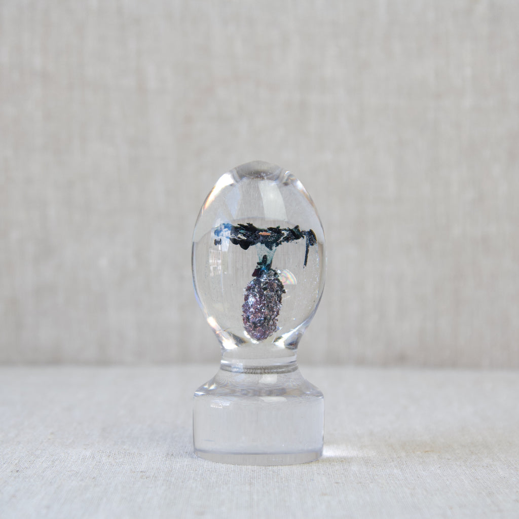 Encased within the glass object are inclusions of coloured metallic flakes. They have been arranged in the manner of an atomic bomb, to emulate the dramatic, explosive sporing of a puffball.