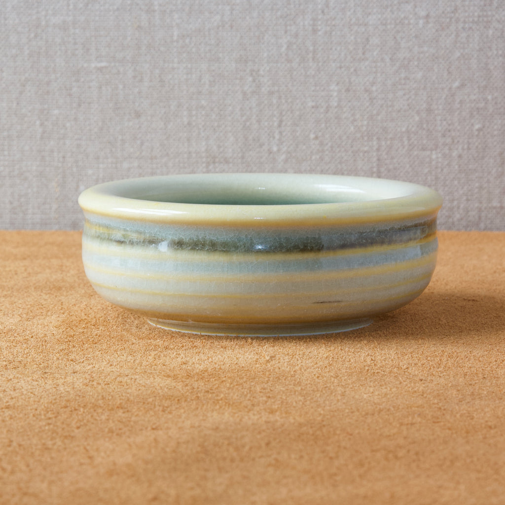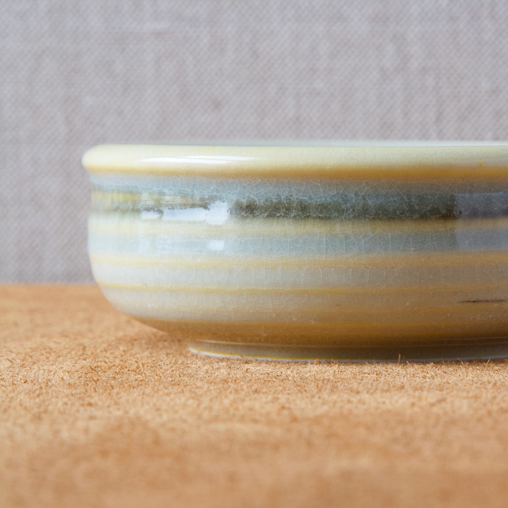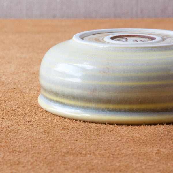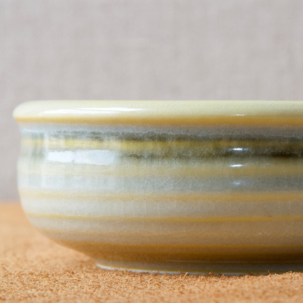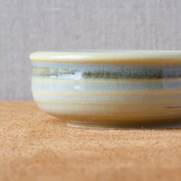 This shallow but generous bowl features a soft yellow celadon glaze, with areas of blue, grey, and green. This piece offers an insight into the designer's experimentations with translucent coloured glazes.