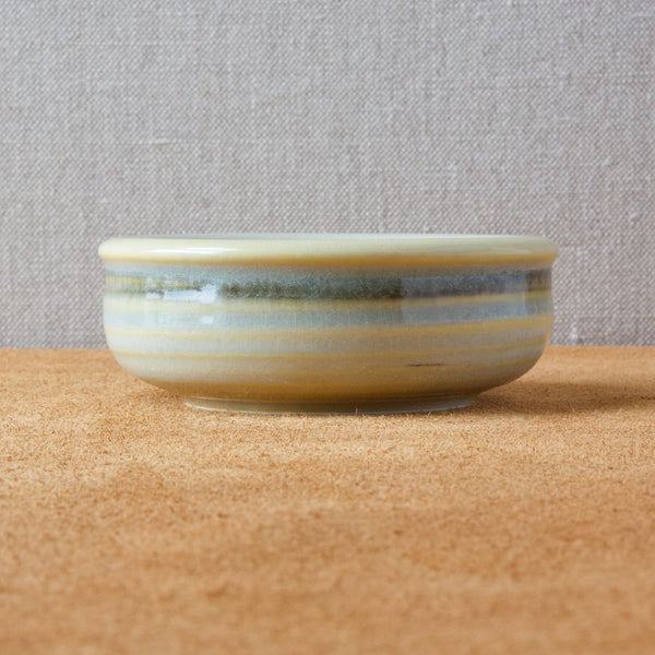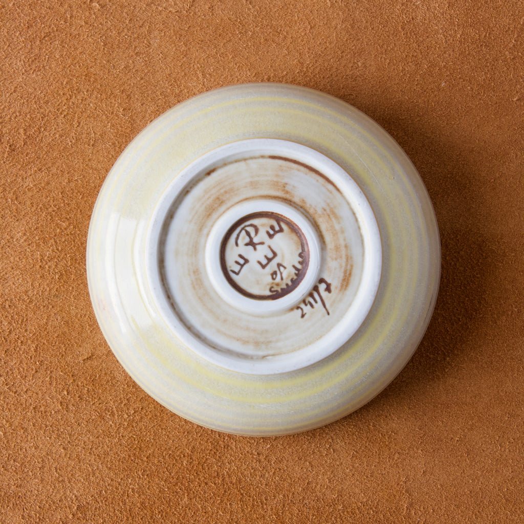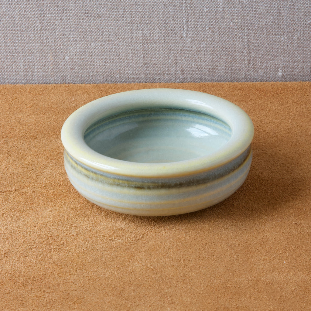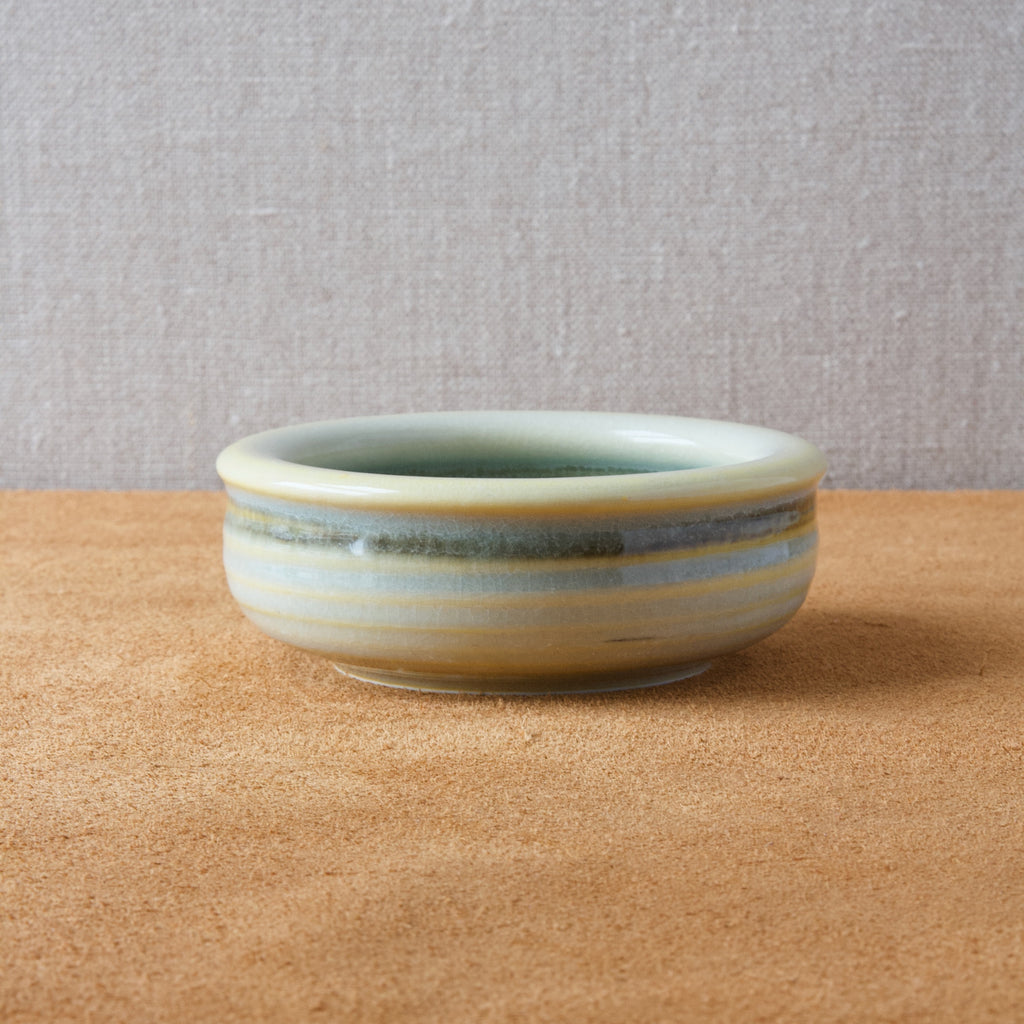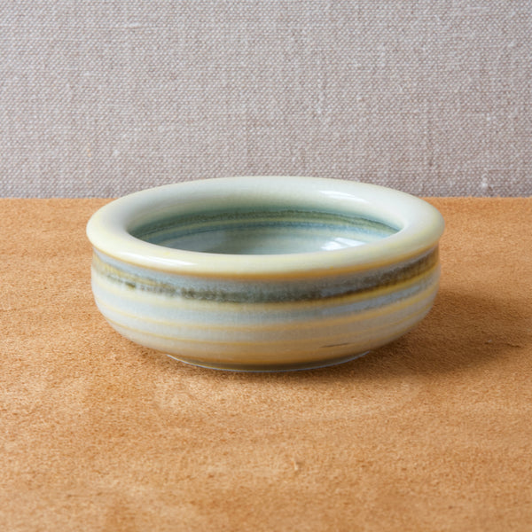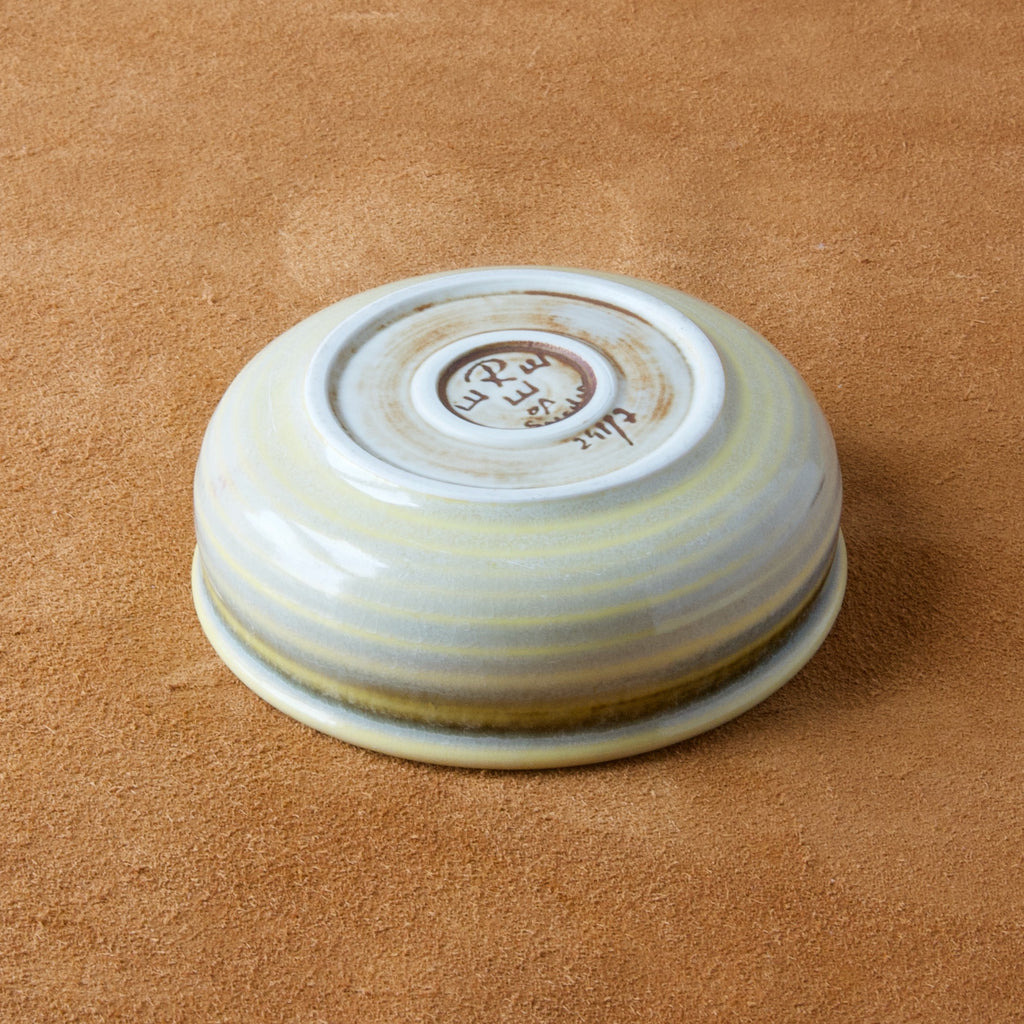 This shallow but generous bowl features a soft yellow celadon glaze, with areas of blue, grey, and green. This piece offers an insight into the designer's experimentations with translucent coloured glazes.