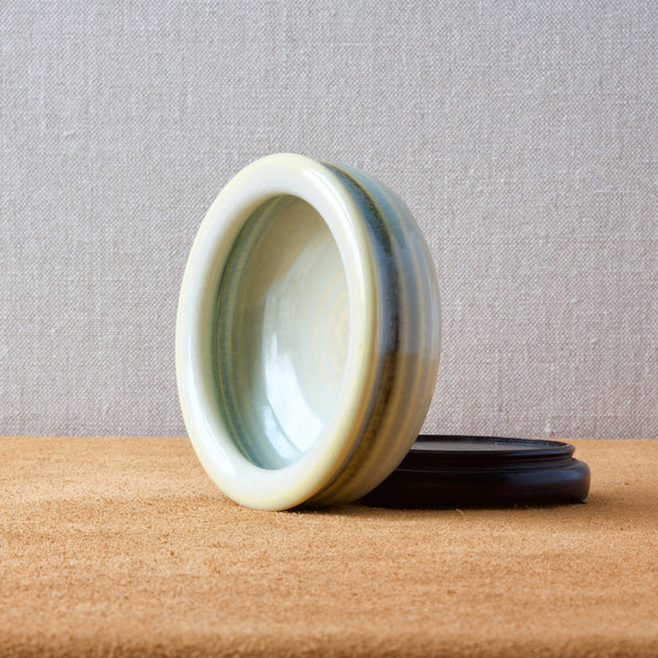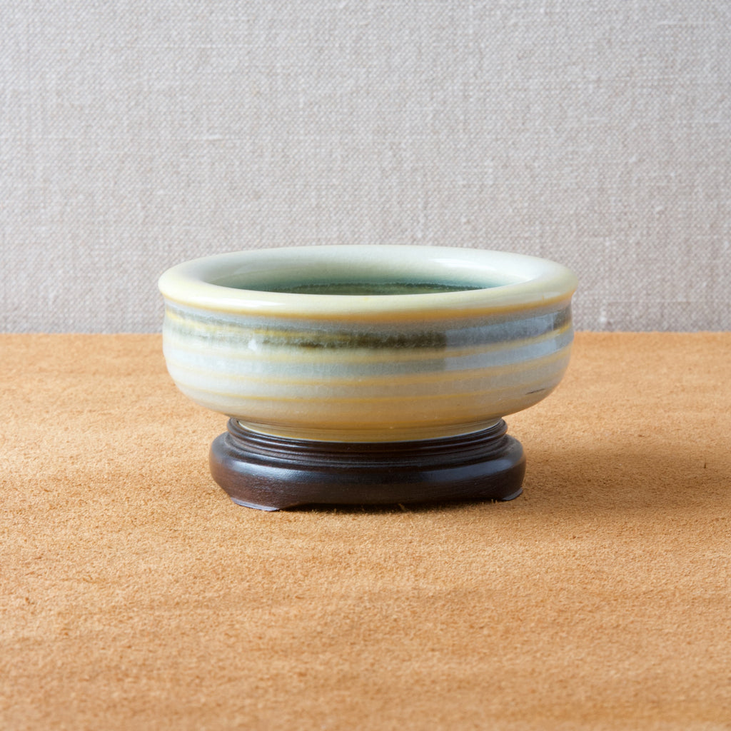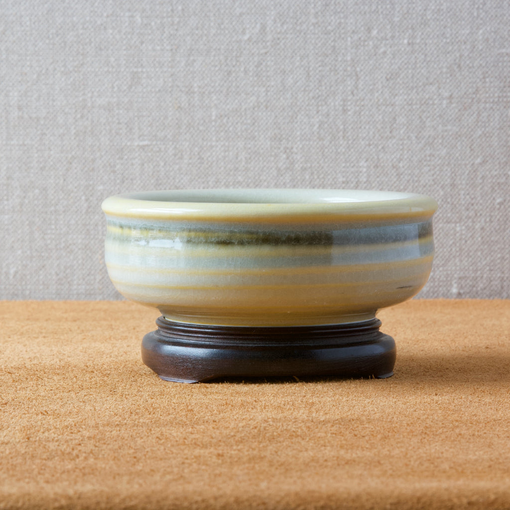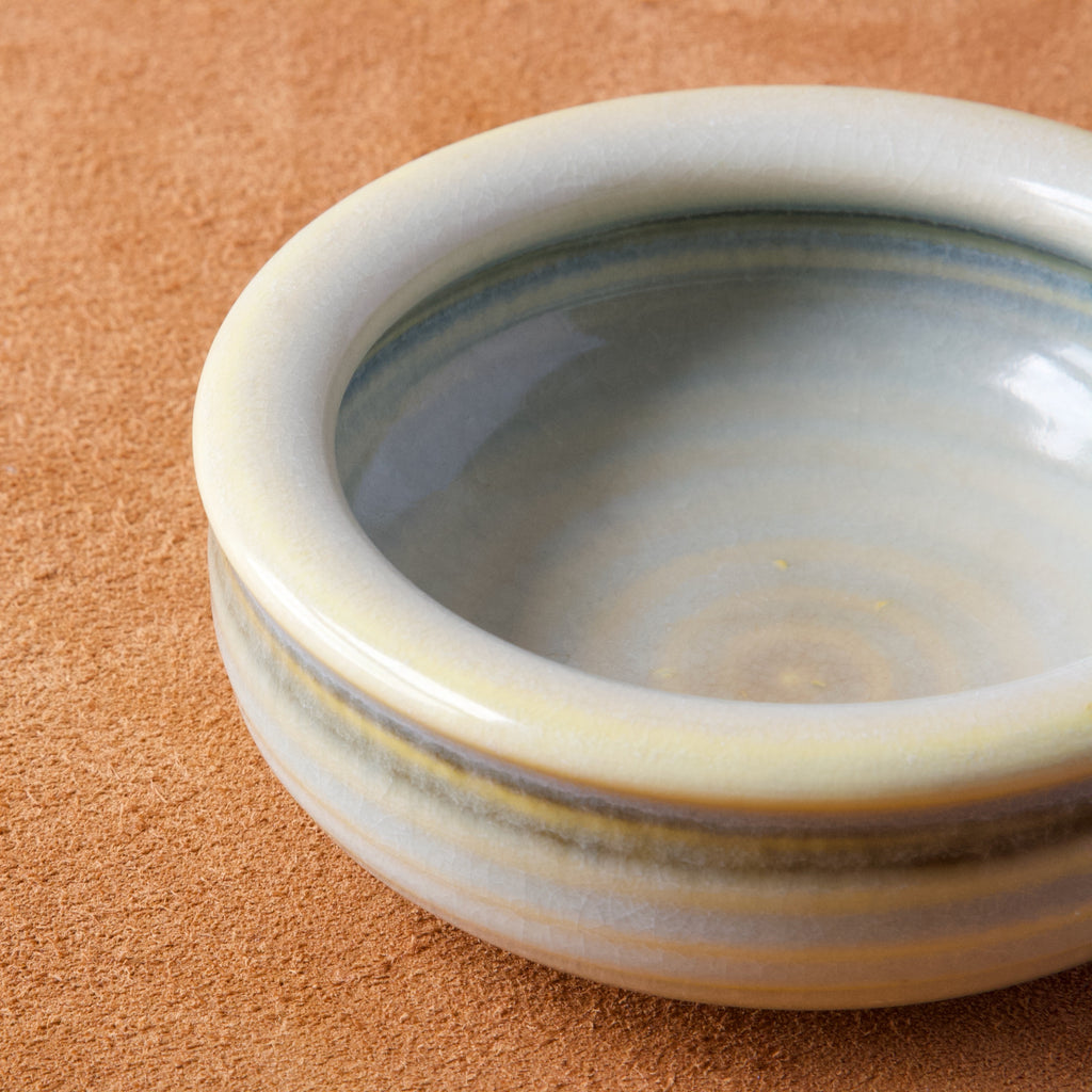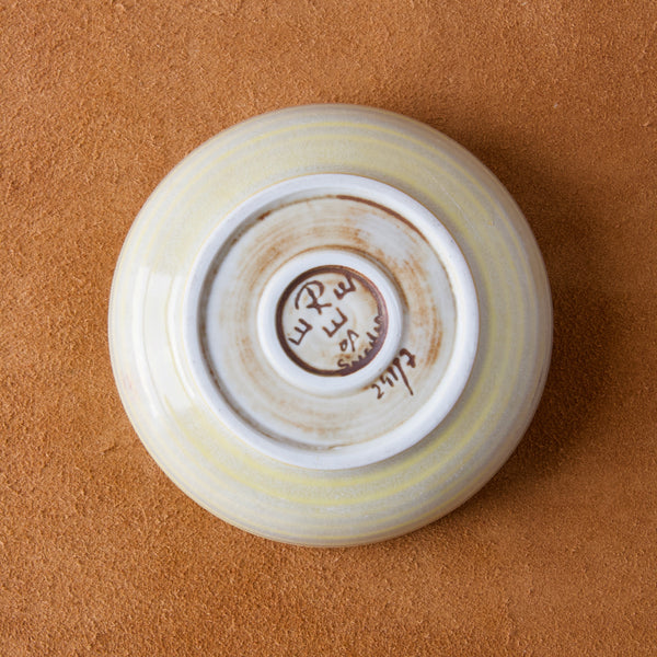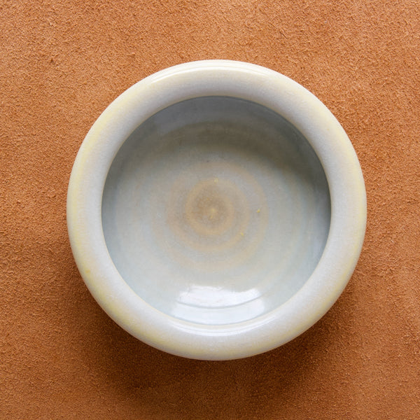 This shallow but generous bowl features a soft yellow celadon glaze, with areas of blue, grey, and green. This piece offers an insight into the designer's experimentations with translucent coloured glazes.