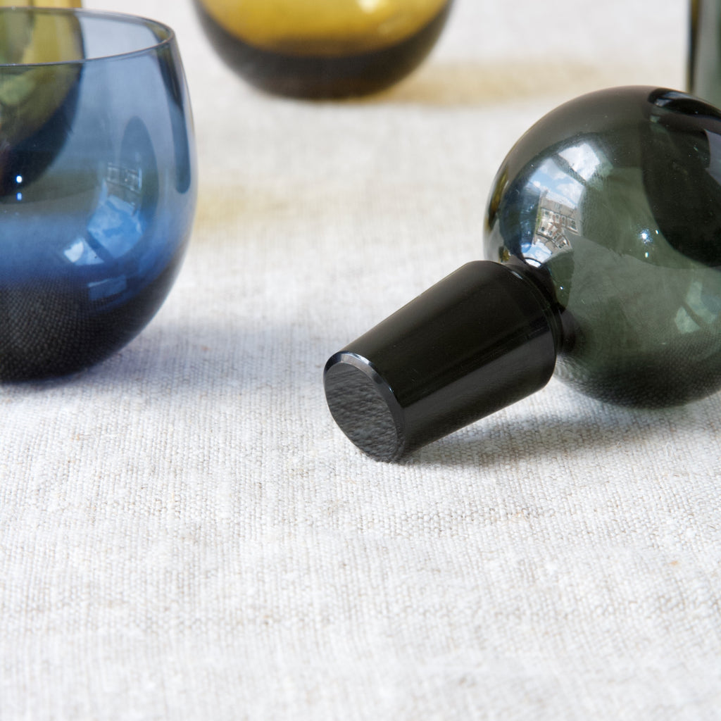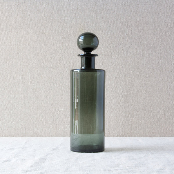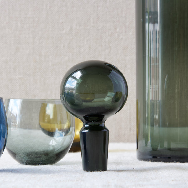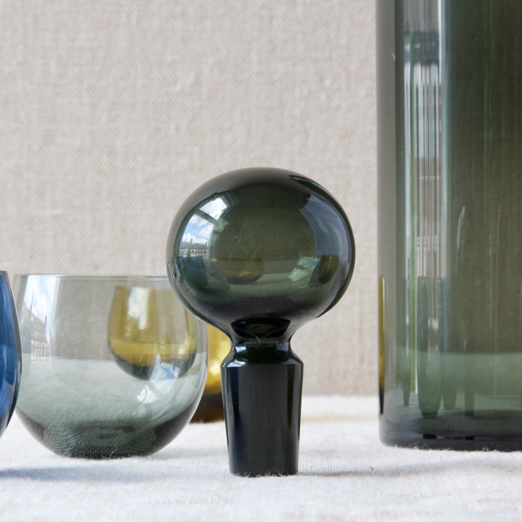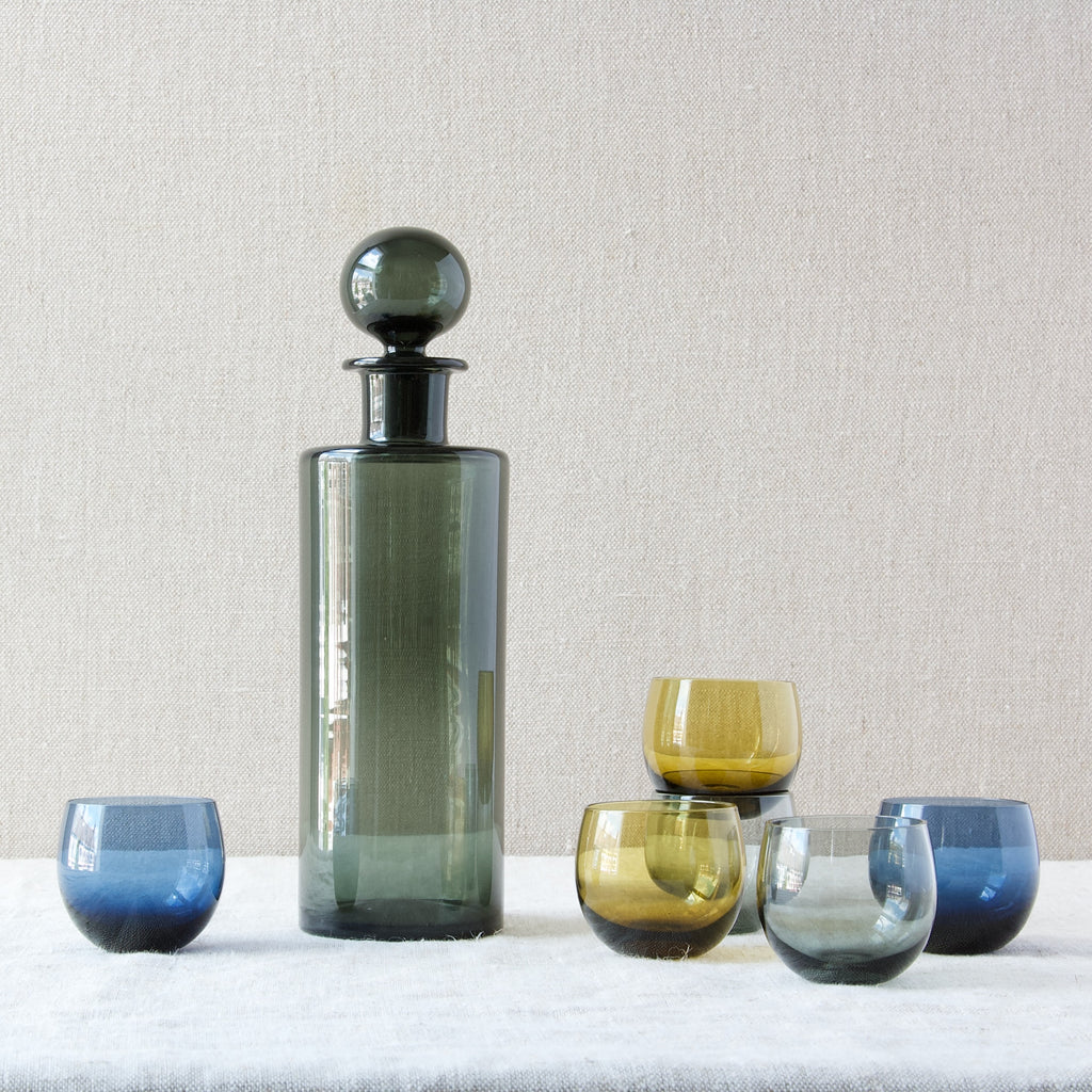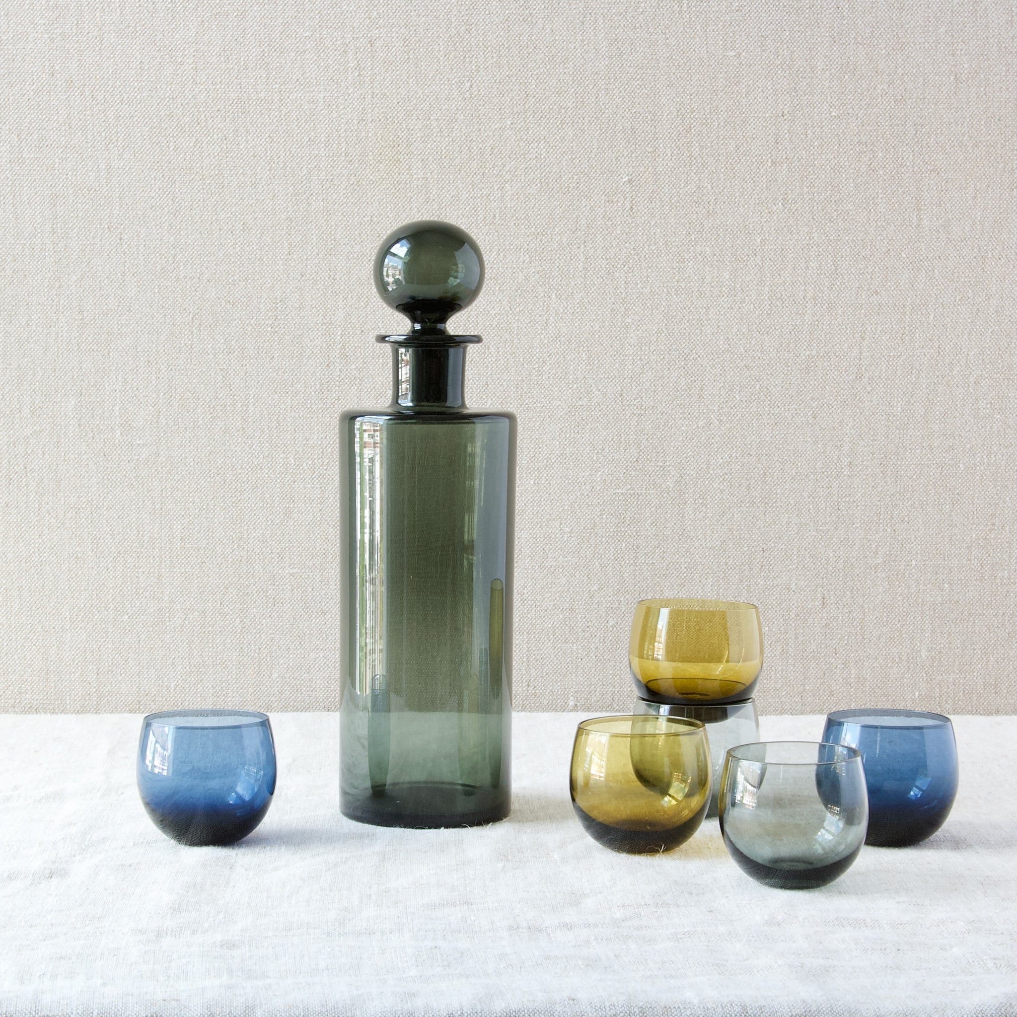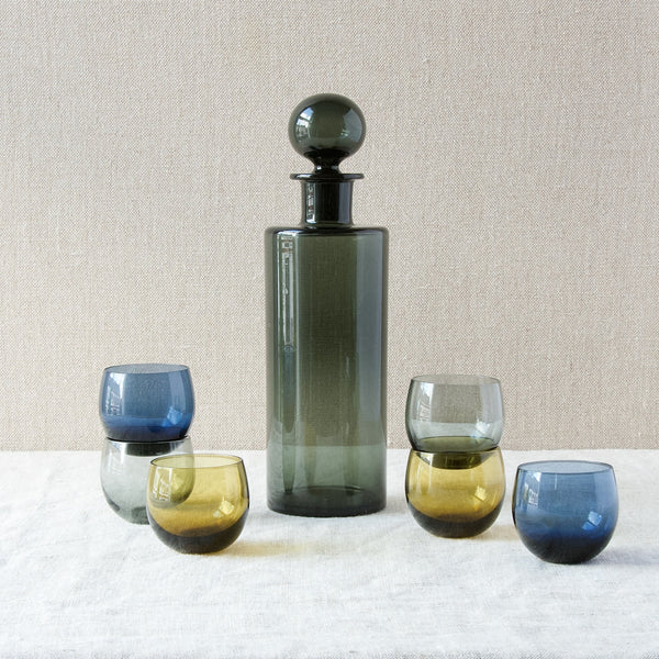 The sleek, unpretentious form of this smoked decanter provides the clean and elegant sophistication associated with Nuutajärvi glassworks and Finnish Modernism as a whole. This refinement is also seen in the six 'Berry' cocktail glasses, with their simple, pleasing forms and restrained palette of grey, amber and indigo.