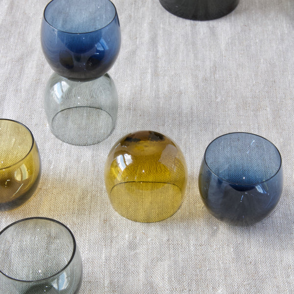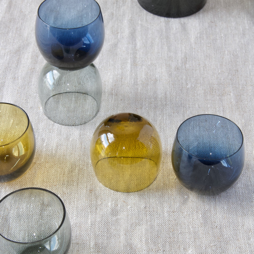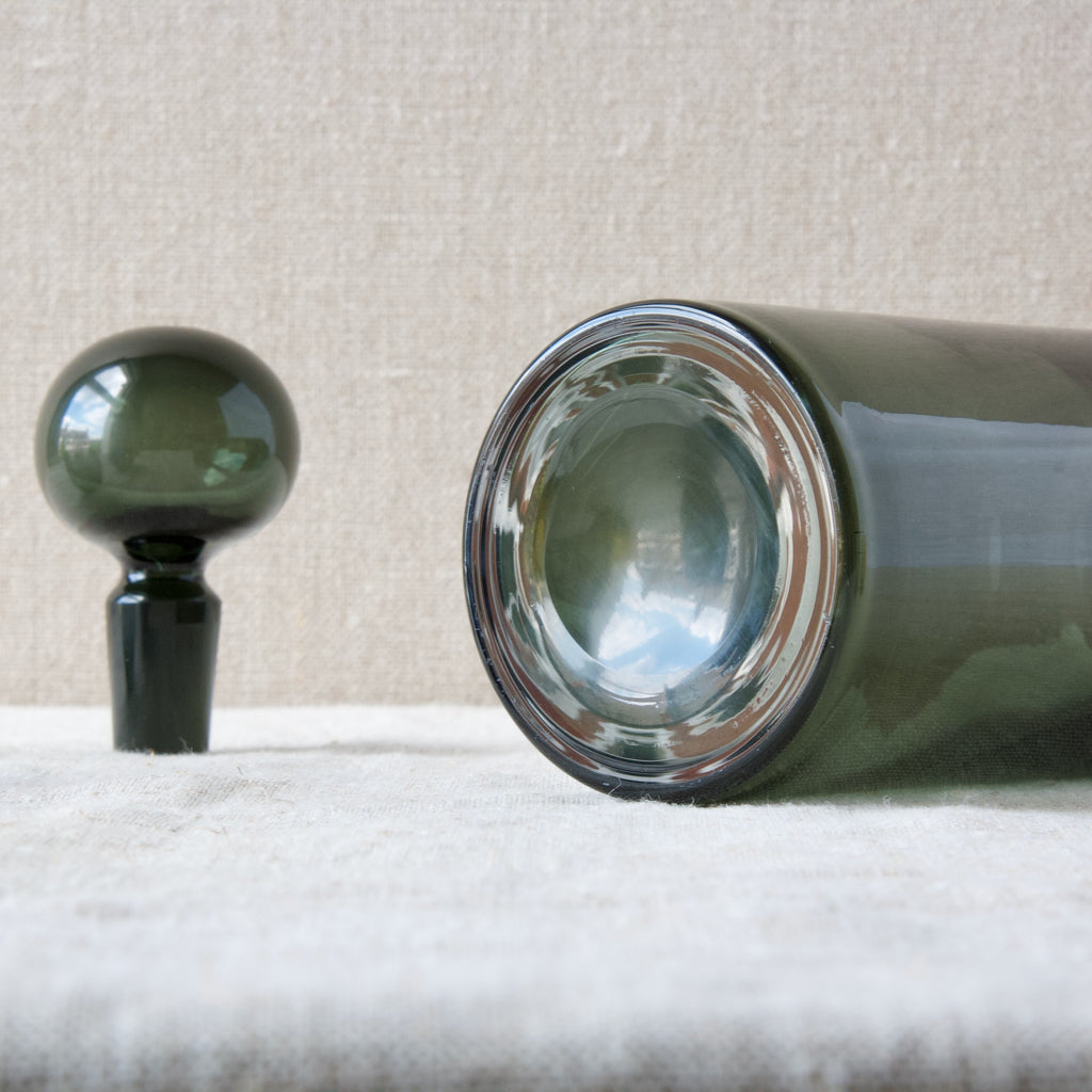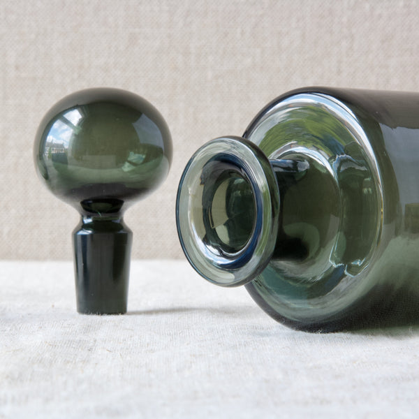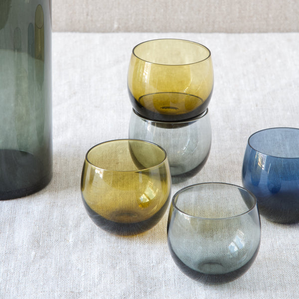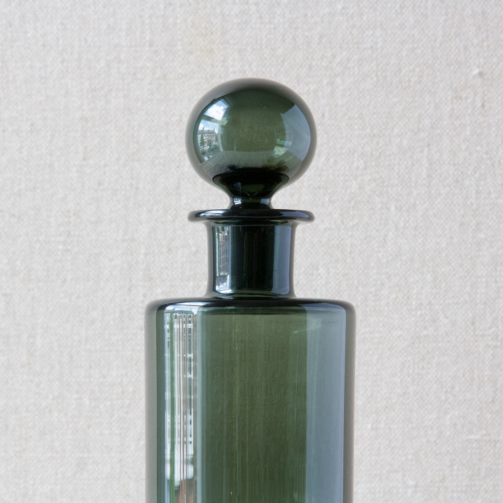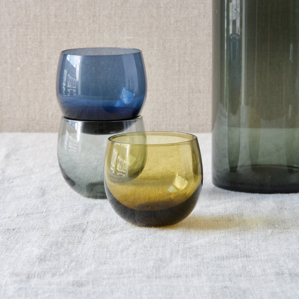 The sleek, unpretentious form of this smoked decanter provides the clean and elegant sophistication associated with Nuutajärvi glassworks and Finnish Modernism as a whole. This refinement is also seen in the six 'Berry' cocktail glasses, with their simple, pleasing forms and restrained palette of grey, amber and indigo.