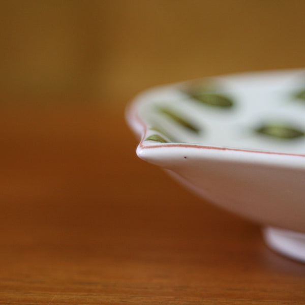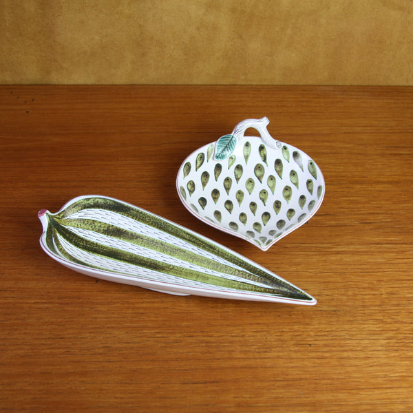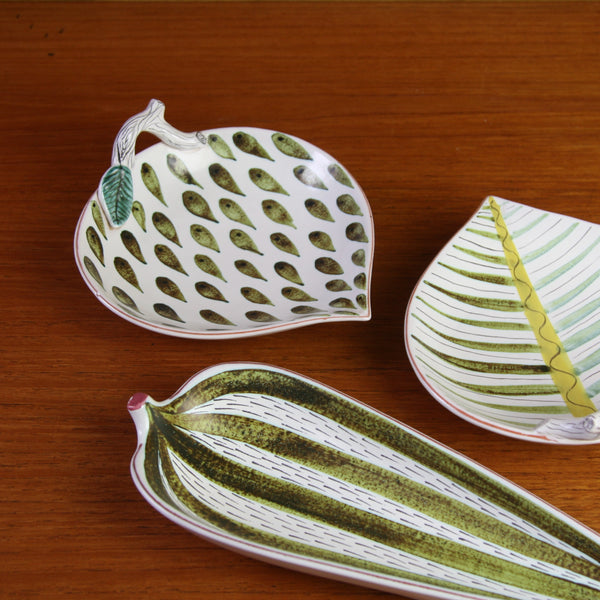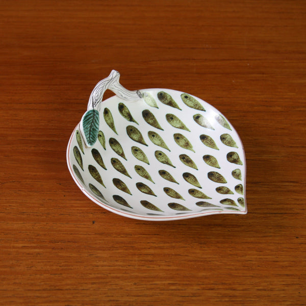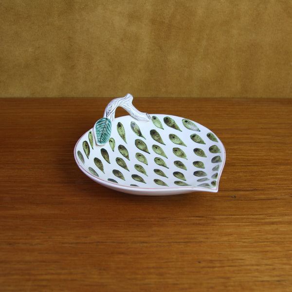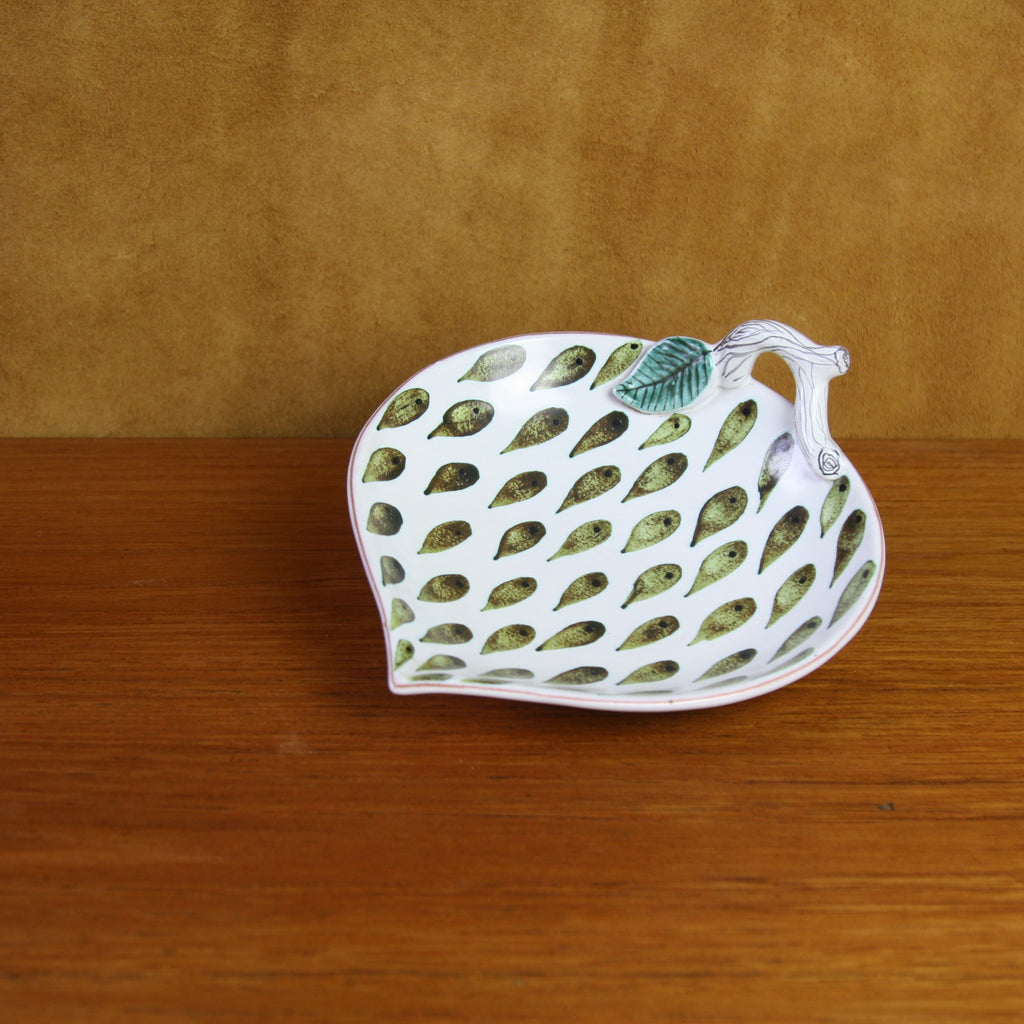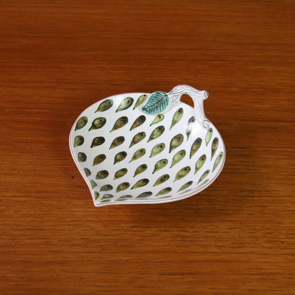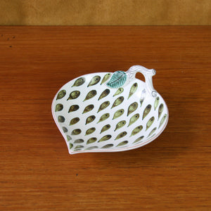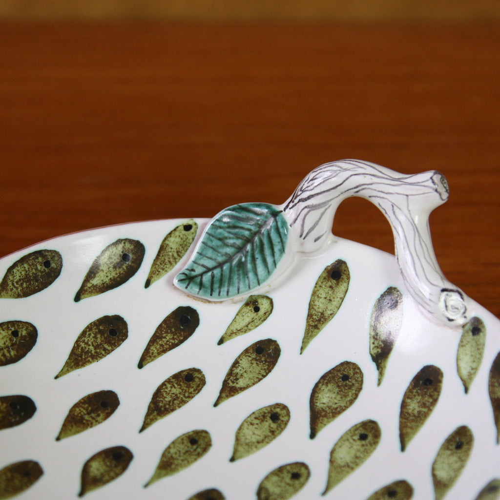 This leaf-shaped dish dates from the 1950's, and displays the unique characteristics of Lindberg's work that have ensured his enduring popularity. The playful shape has been hand-decorated with glazes and oxides in an abstract green 'tadpoles' design. The dish has an applied branch detail, which has been hand-decorated with a bark effect. This highly decorative and joyful object is also functional, being ideal to serve snacks to friends on a special occasion.