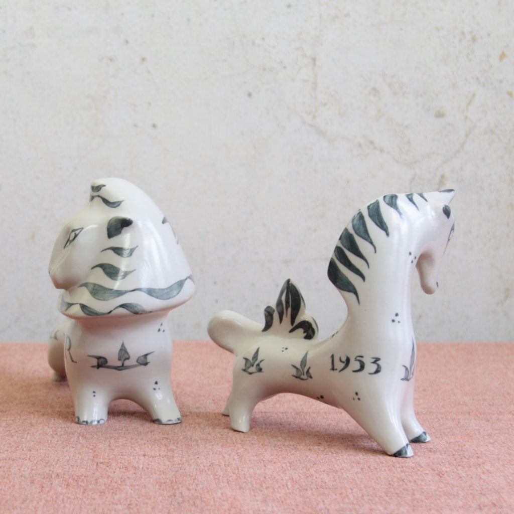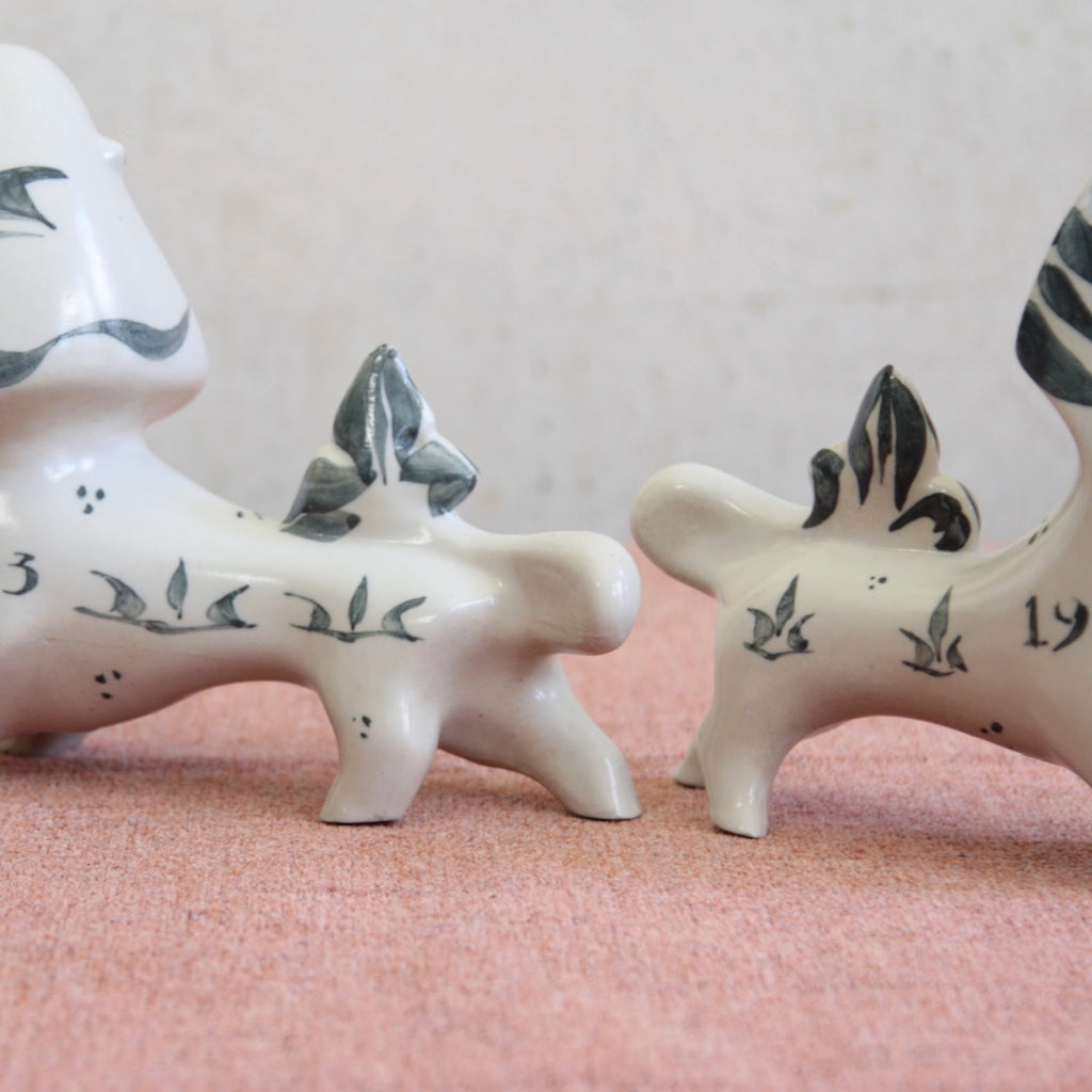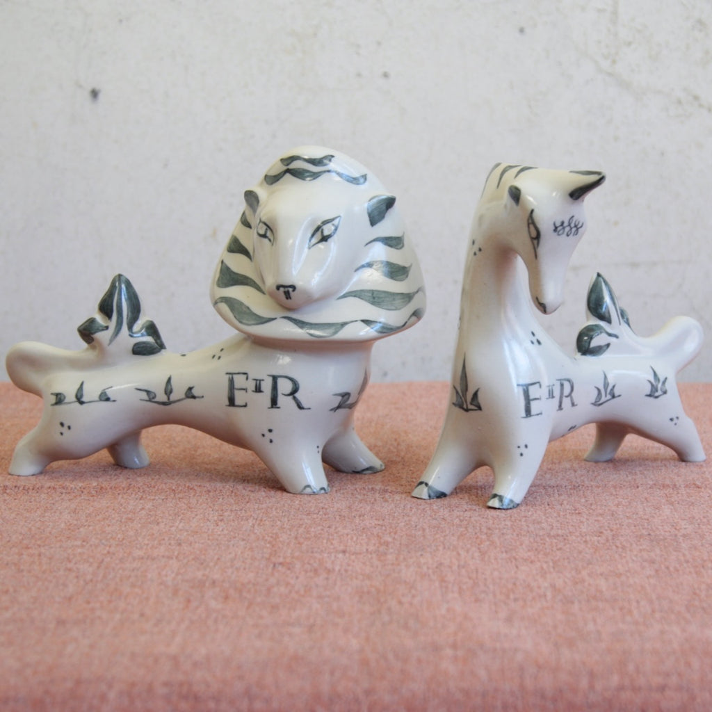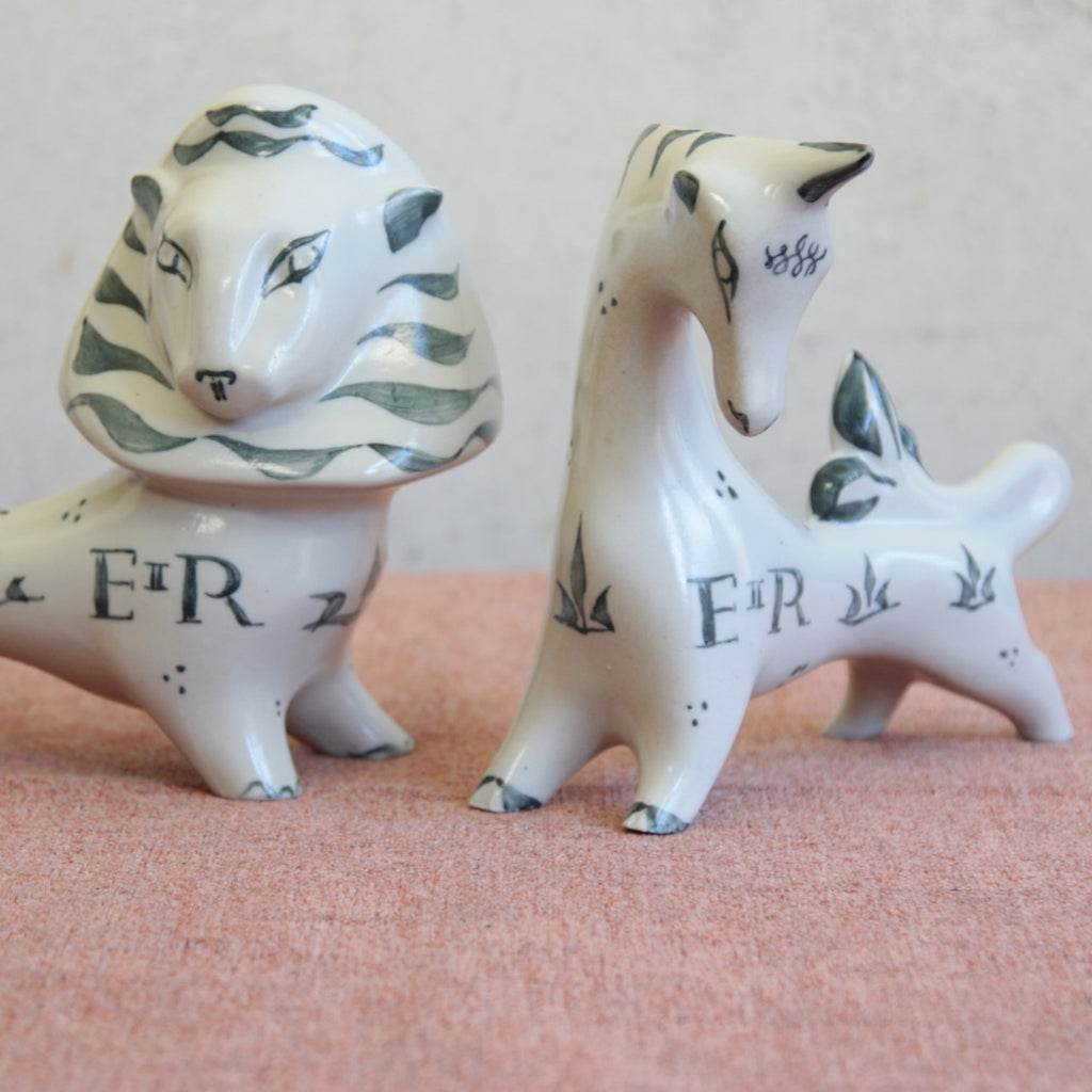 A pair of Modernist ceramic statues in the form of a Lion & Unicorn designed by Susan Parkinson in 1951. These striking figures are central to the story of Richard and Susan Parkinson’s pottery and are among the earliest designs ever created by Susan.