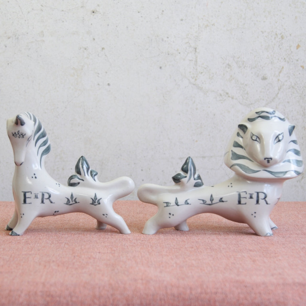 In addition to the slight yet evocative features of the lion and unicorn, each figure is painted with stylised fleur-de-lis, '1953', and 'EIIR' (Elizabeth Regina).