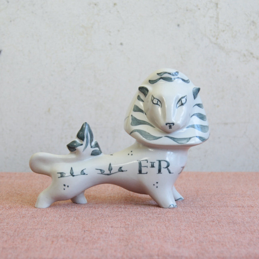 The sculptural forms of Susan’s lion and unicorn were inspired by Arnold Machin’s Zodiac Bull, manufactured by Wedgwood. First exhibited in the V&A’s Britain Can Make It exhibition, Susan was greatly impressed when she saw Zodiac Bull and thought it would be “good fun” to produce a lion and unicorn in a similar style for the Festival of Britain in 1951. [1]