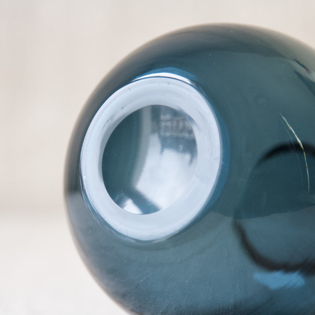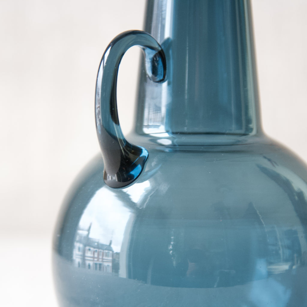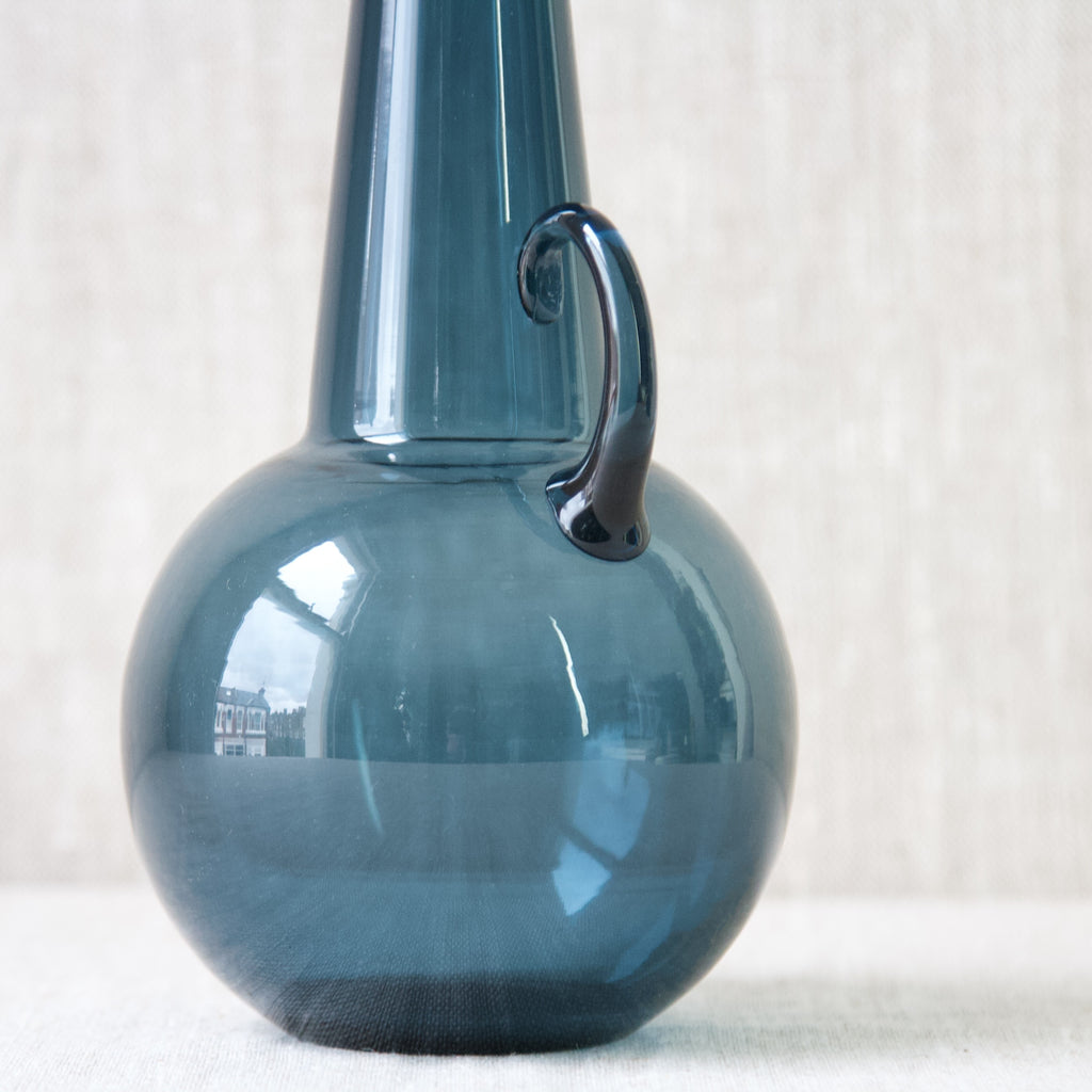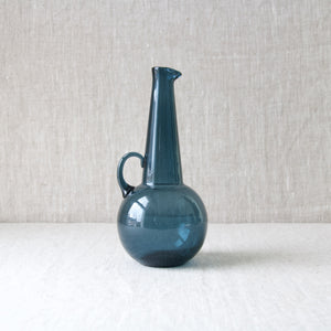 This early object consists of a tall cone atop a sphere. The elegant handle has been applied by hand, and the whole object handmade from attractive steel-blue glass.