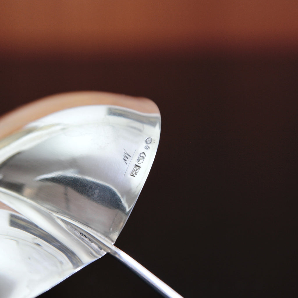Branding (left to right): Three crowns into an oval frame, (Swedish import mark) used from 1912 to 1988 on silver imported into Sweden. 'S' in a hexagonal frame indicating the minimum silver standard of Sweden (which is 800). Recumbent lion (Kultakeskus Oy), ‘925’ (925/1000 silver fineness -Sterling), 'TW' (Tapio Wirkkala).