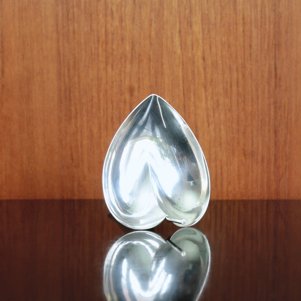 Symmetrically, the sculptural bowl undulates gently outward from a central, stalk-like carrying handle to form what we perceive as two halves of an ivy-like leaf blade. Others discern a heart more than a leaf, but either way the piece reflects Wirkkala’s deep fascination with organic form.
