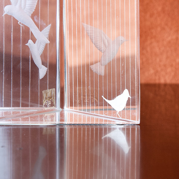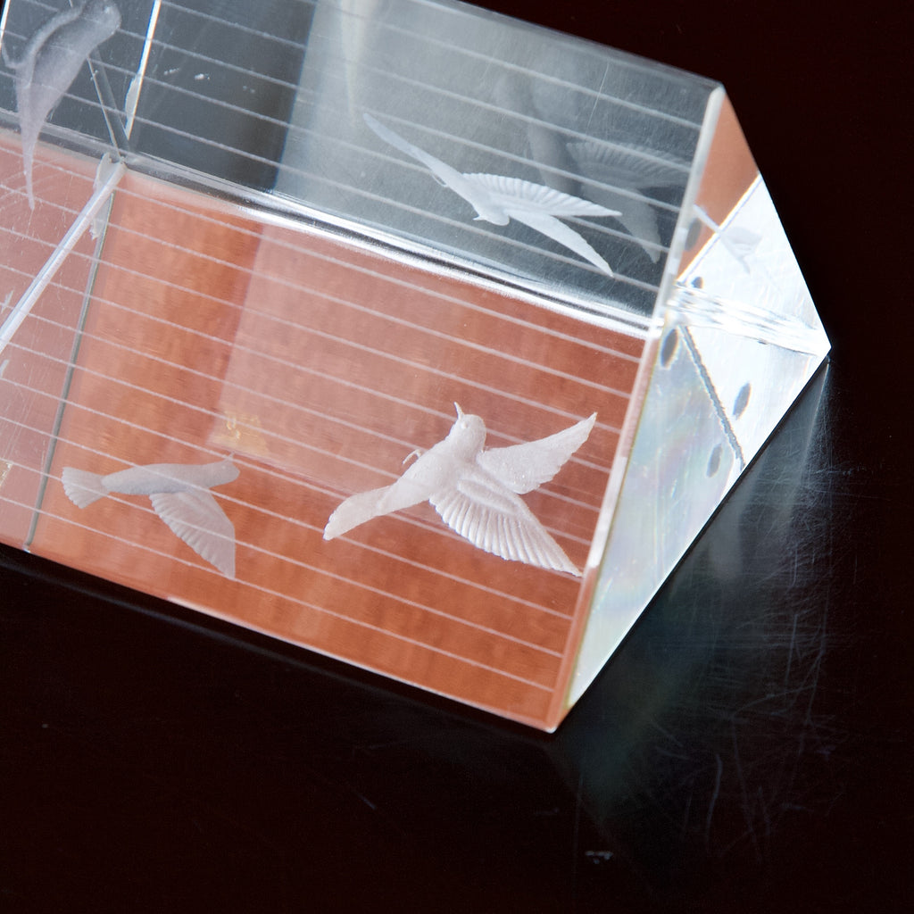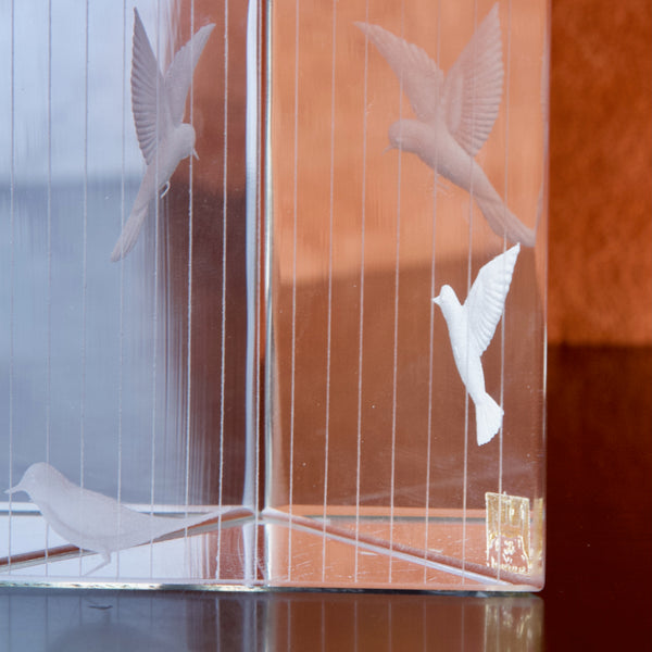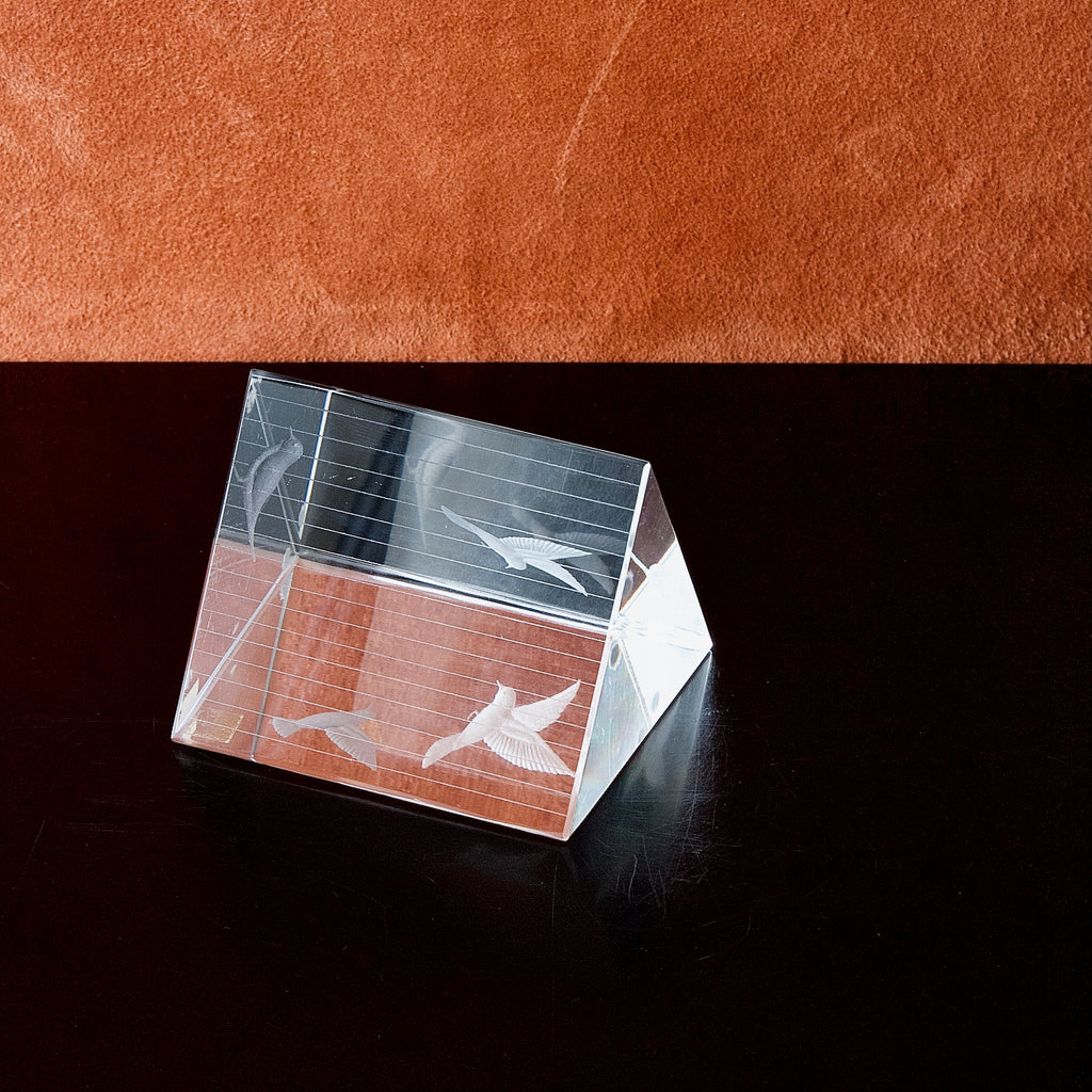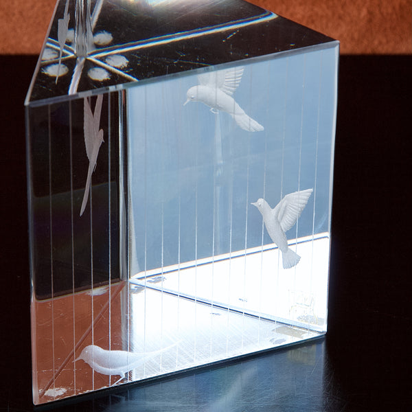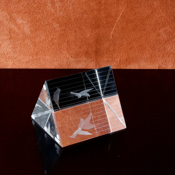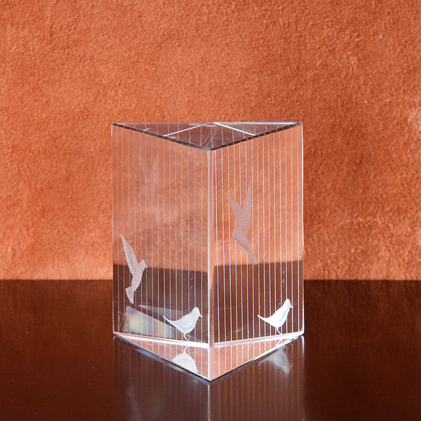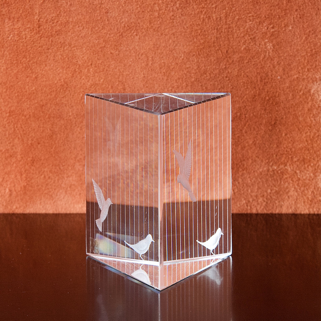 This brilliantly clear glass prism has been hand-engraved with birds. The design makes use of the naturally reflective properties within a prism; the birds are reflected within, creating a different three-dimensional scene from each of the object's three sides.