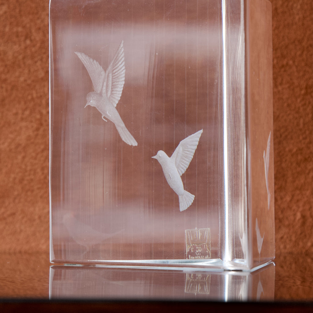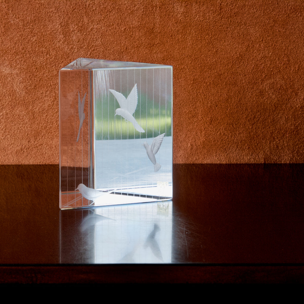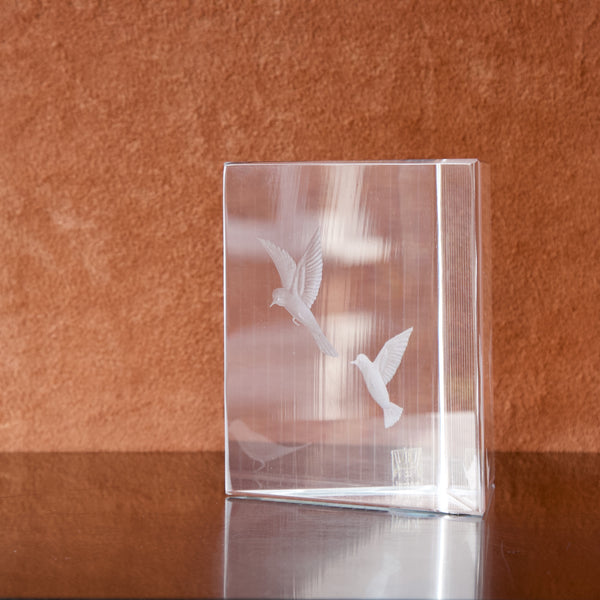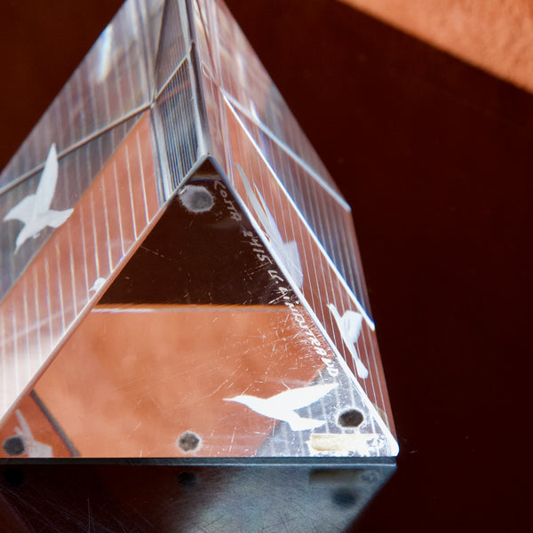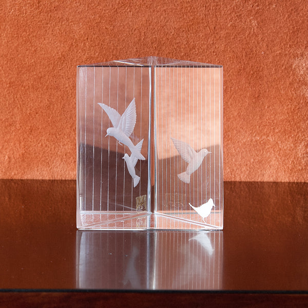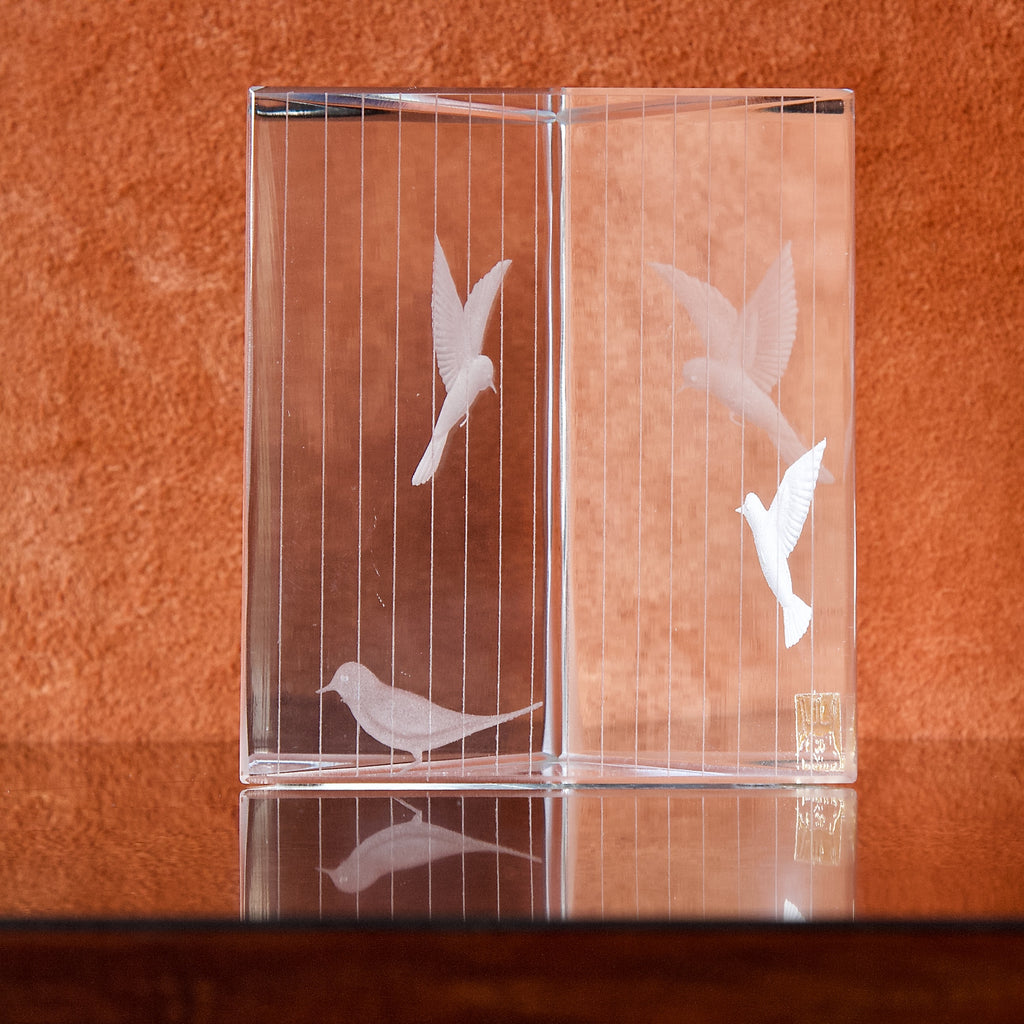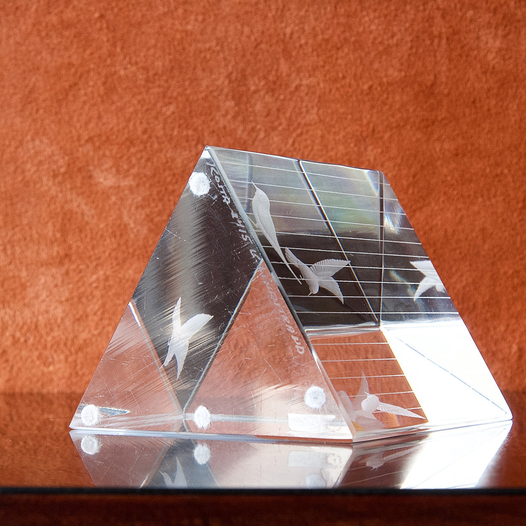 This brilliantly clear glass prism has been hand-engraved with birds. The design makes use of the naturally reflective properties within a prism; the birds are reflected within, creating a different three-dimensional scene from each of the object's three sides.