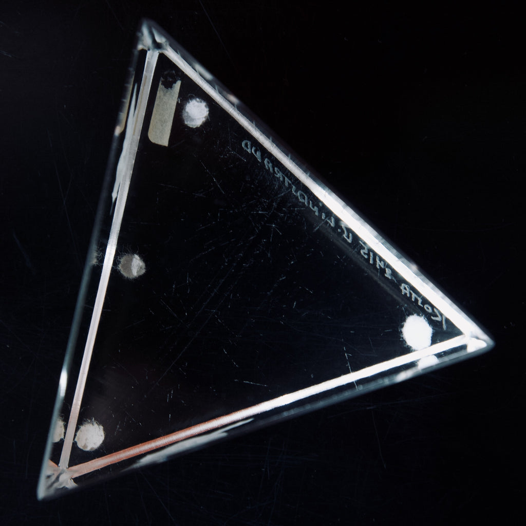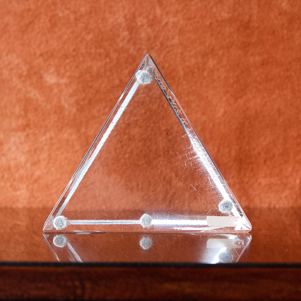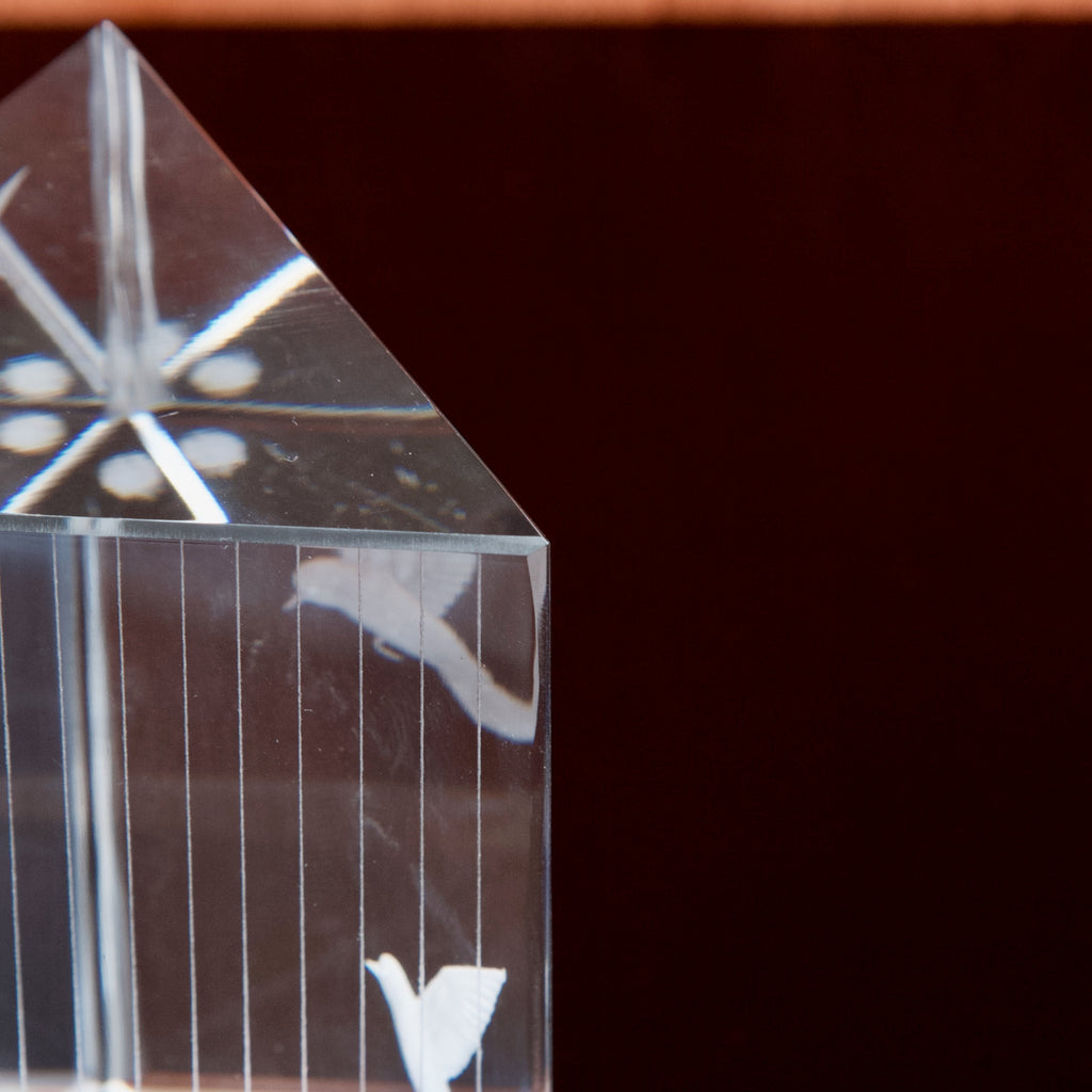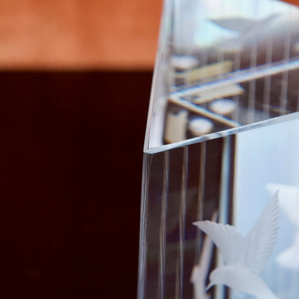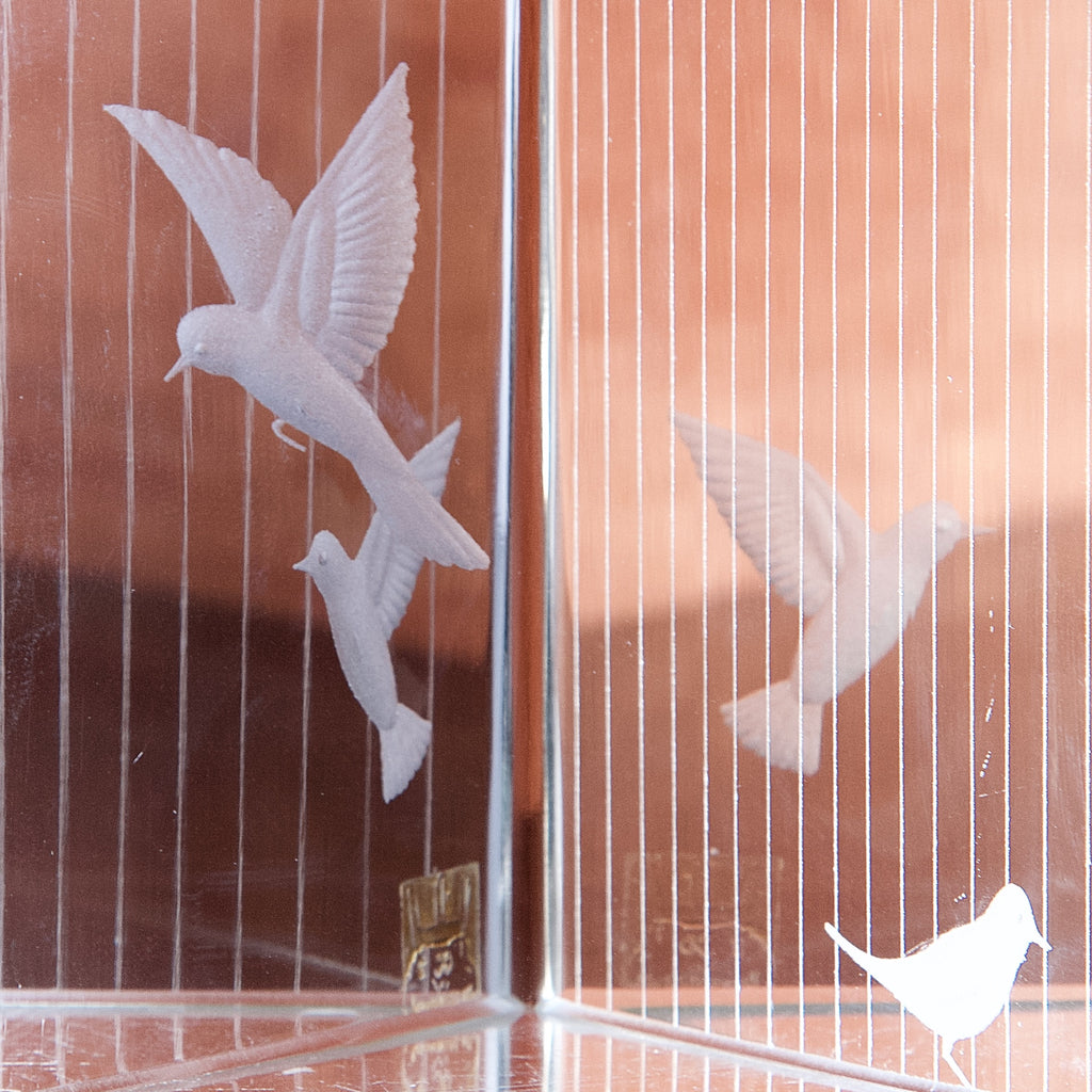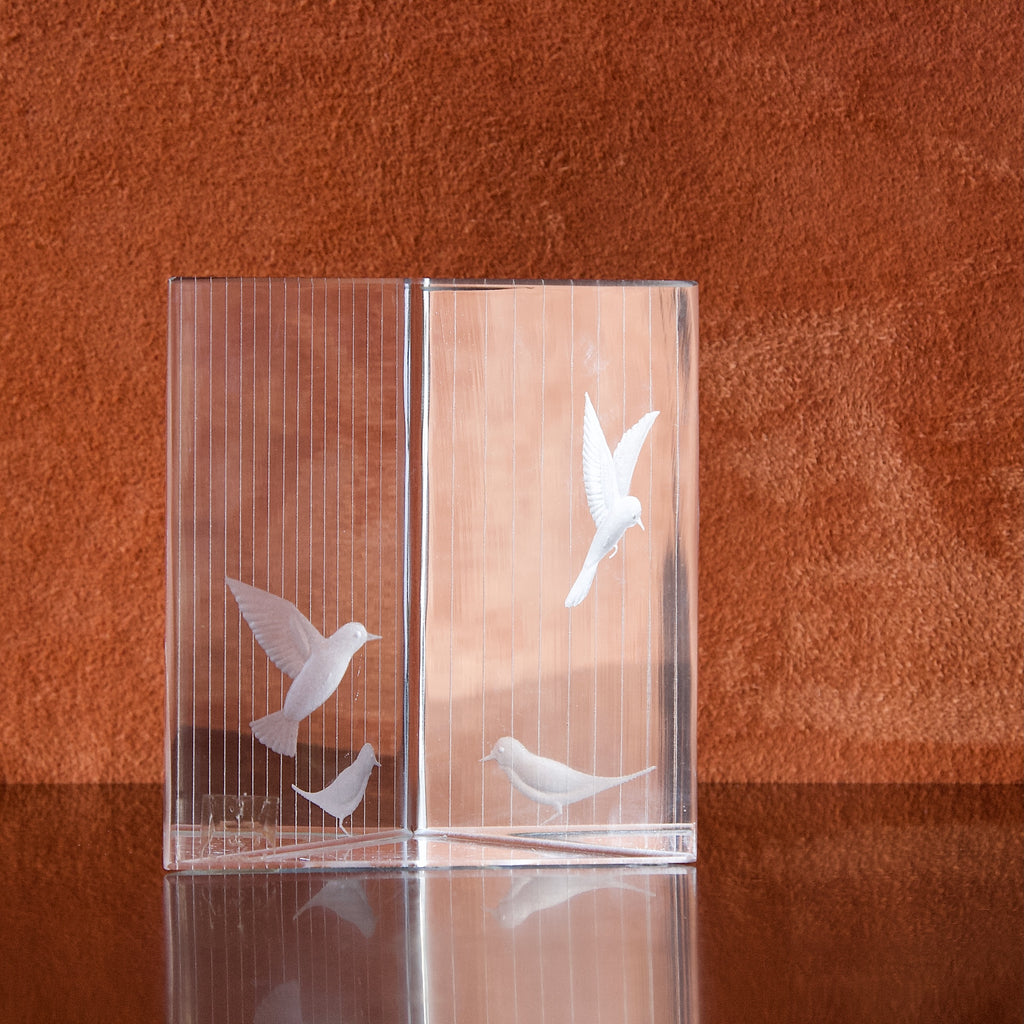 This brilliantly clear glass prism has been hand-engraved with birds. The design makes use of the naturally reflective properties within a prism; the birds are reflected within, creating a different three-dimensional scene from each of the object's three sides.