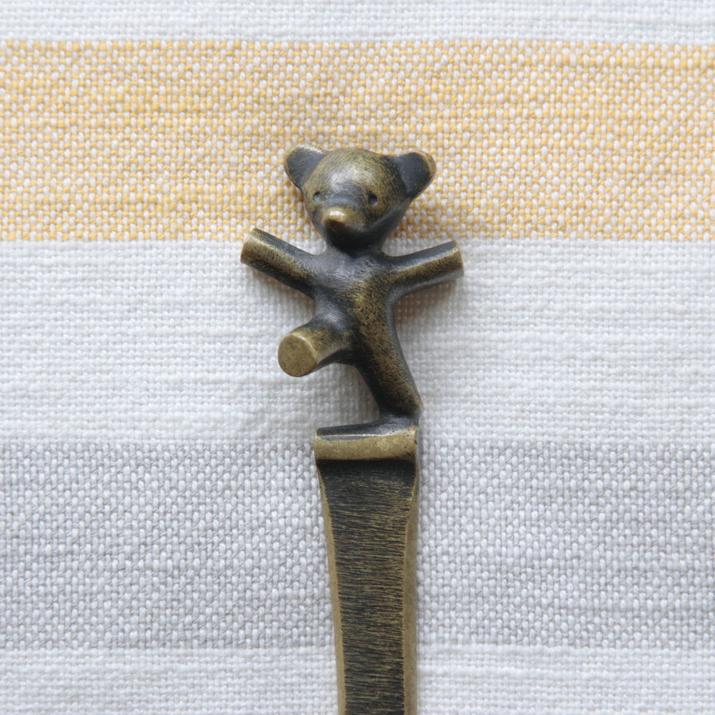 Aside from the brilliantly modelled bear cub that dances happily on the hilt of the letter opener, what makes this object so sumptuous is the attention to detail in its manufacture. The opener, cast as one single piece of metal, has been hand tooled to perfection. The shape is not only pleasing to the eye but in the hand also.