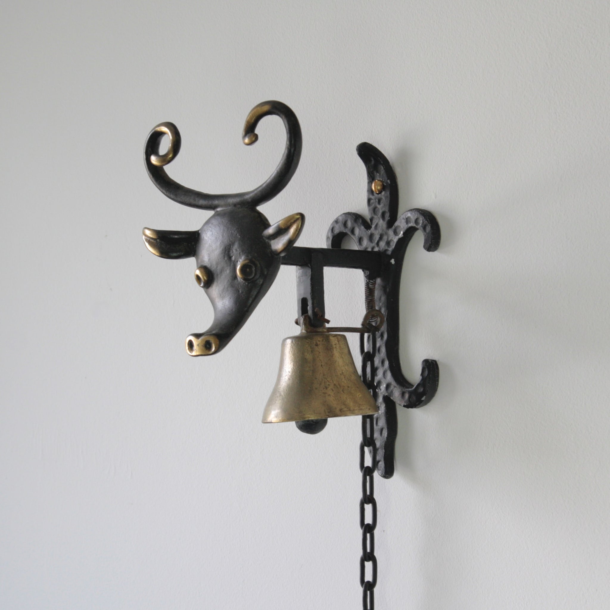 Condition: Very good with signs of age and use. Some small chips to the bracket paintwork. The cow's head is in good condition, but has a green-grey patina in places. Some scratches. Completely functional.