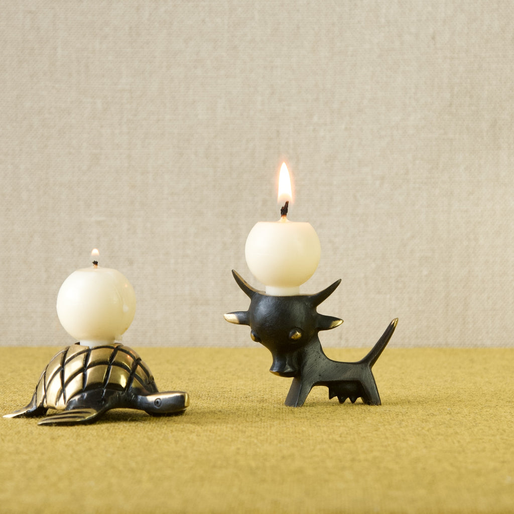 The cow's body and legs are simplified & squared, whilst her head is large and round with pointed ears & horns. The head features a large hole, between the horns, in which to place toothpicks or a candle. Bosse's design results in a playful yet elegant useful object.