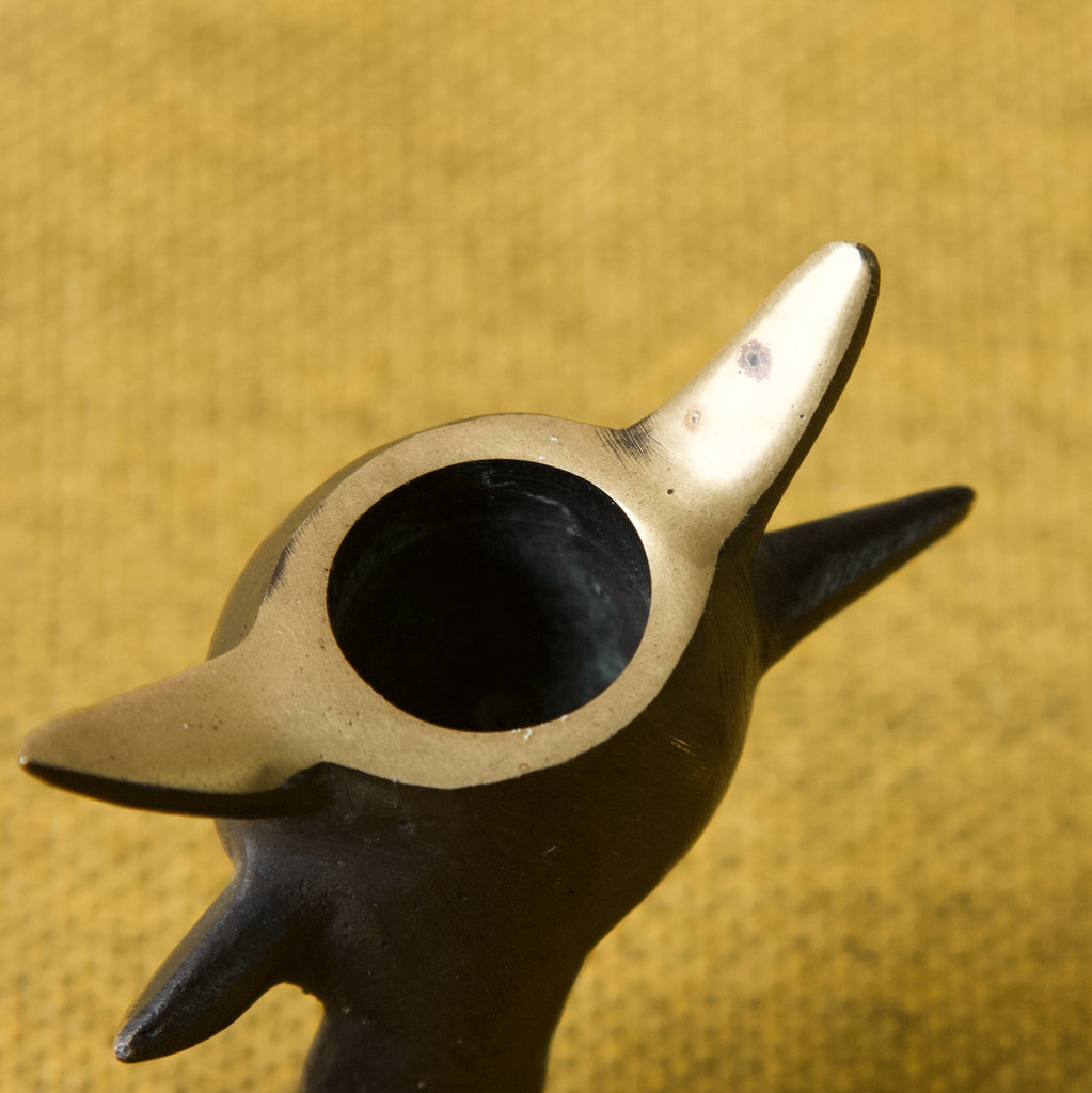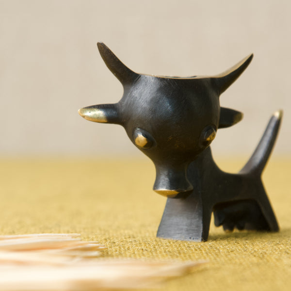 This toothpick holder has been modelled in an abstract way, and is one of Bosse's most strikingly modernist designs. The cow's form is sharp and sleek, and her most notable feature is her large, curved horns which have been polished gold. Other features, such as the eyes, ears & udder have been carefully polished too, whilst the main body of the object is patinated black.
