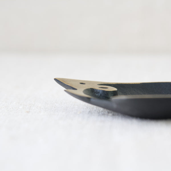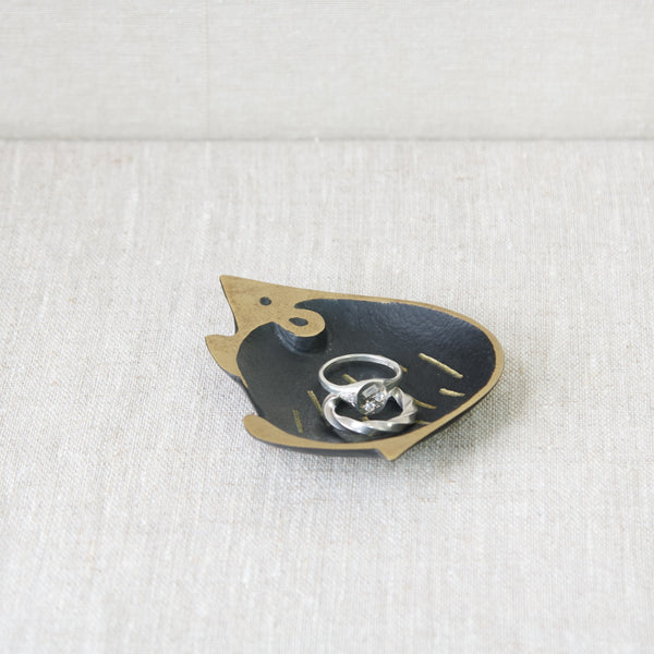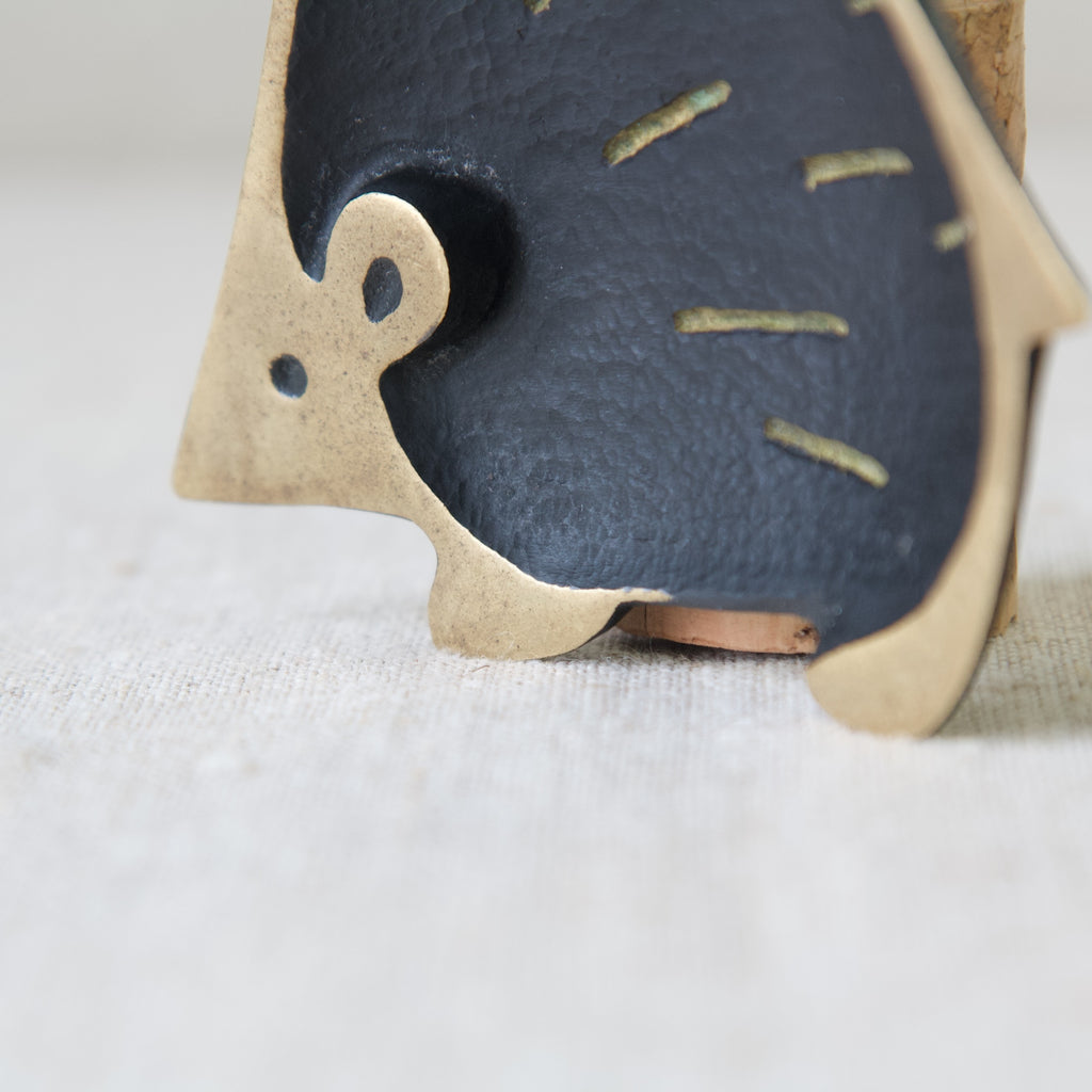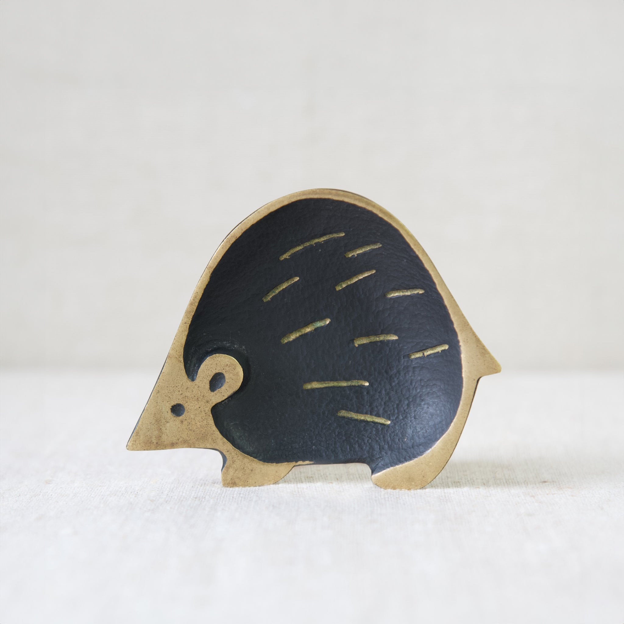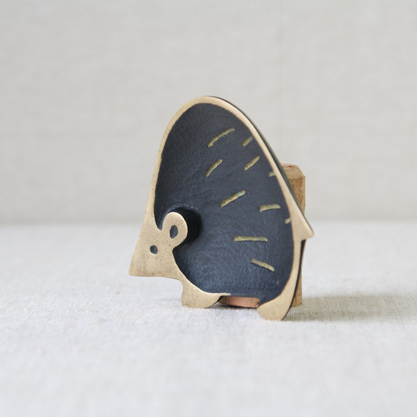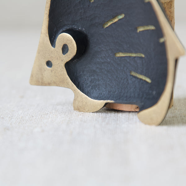 The useful tray is abstract and Modernist in style, yet perfectly captures the essence of a hedgehog with its rotund form, pointed tail, and cute triangular nose. Whilst most of the creature's features are polished to a golden shine, the hedgehog's main body is black, and has been decorated with simplistic lines to indicate quills.