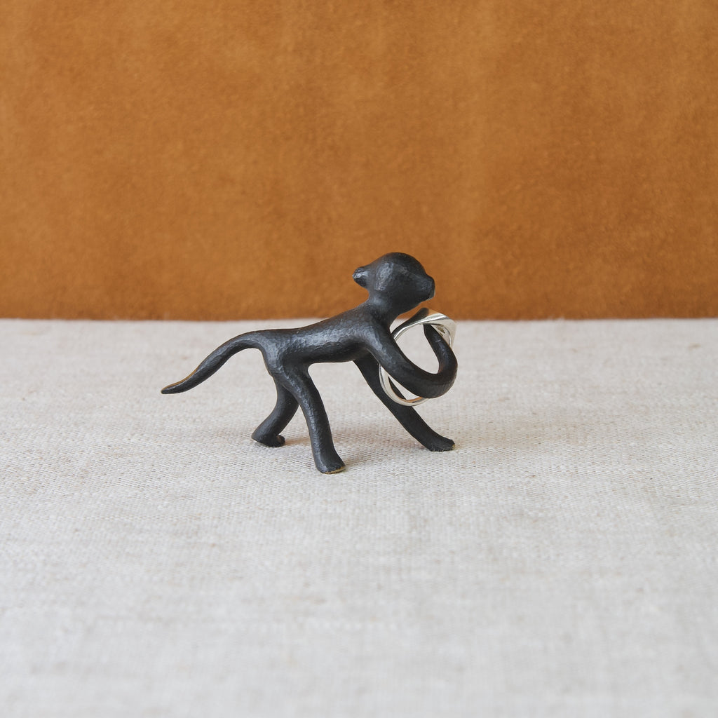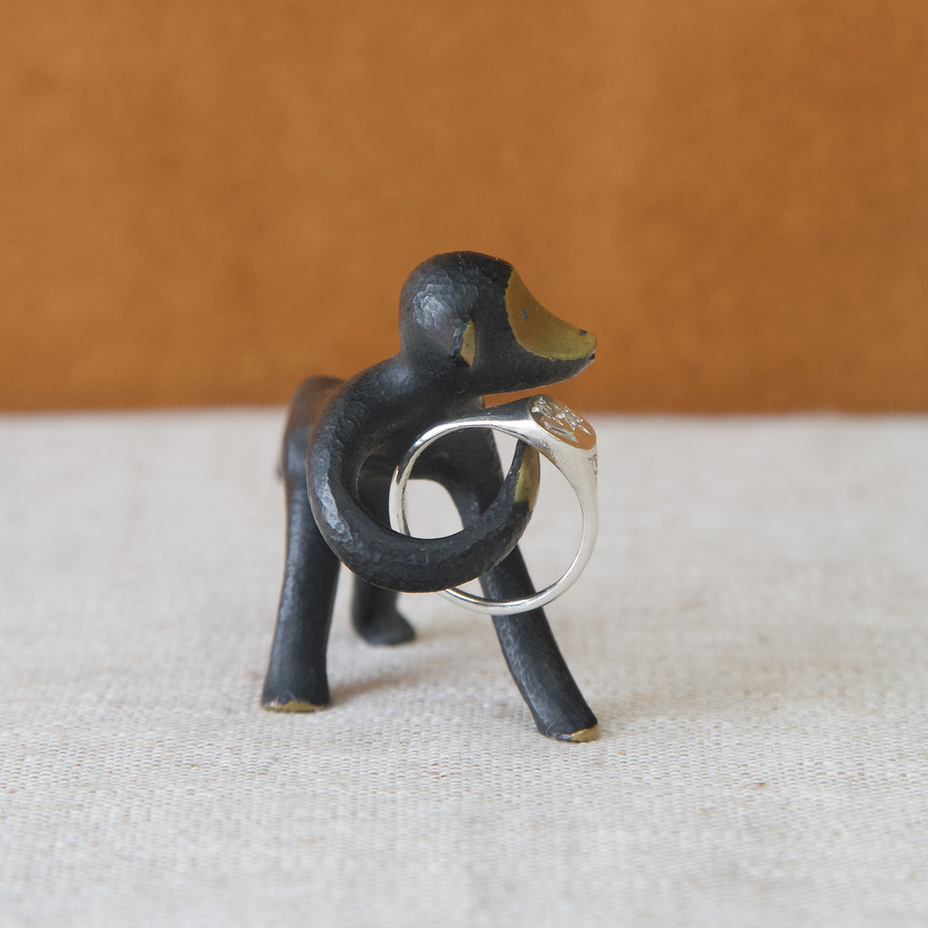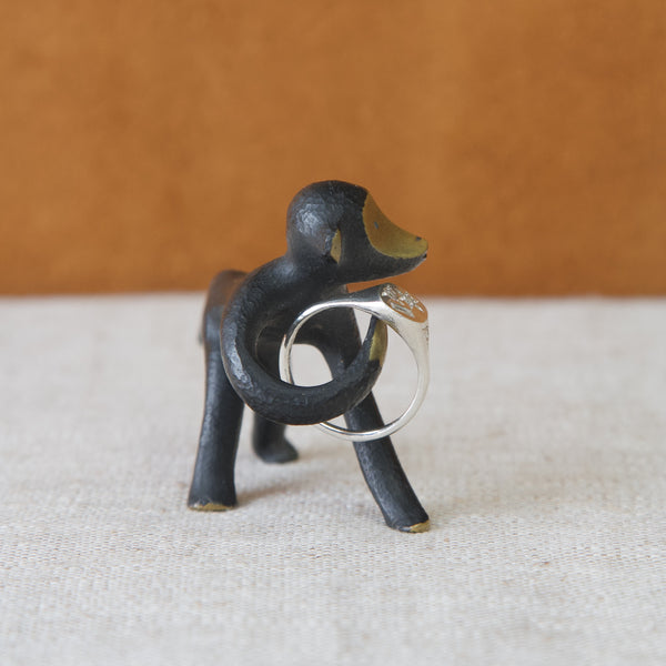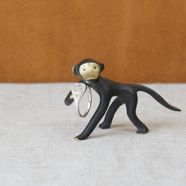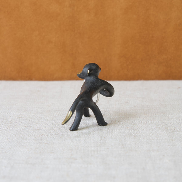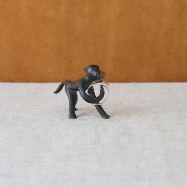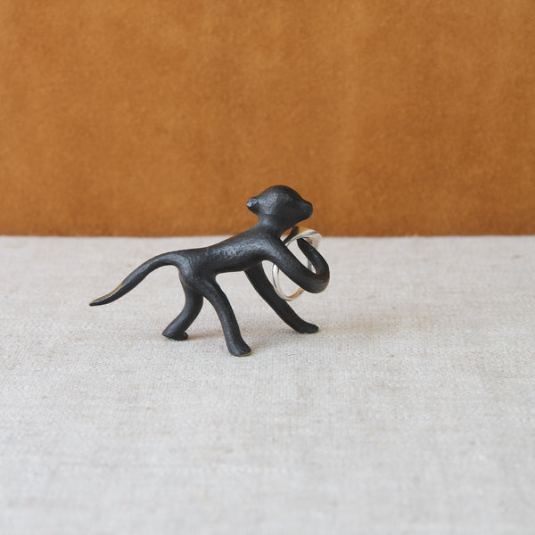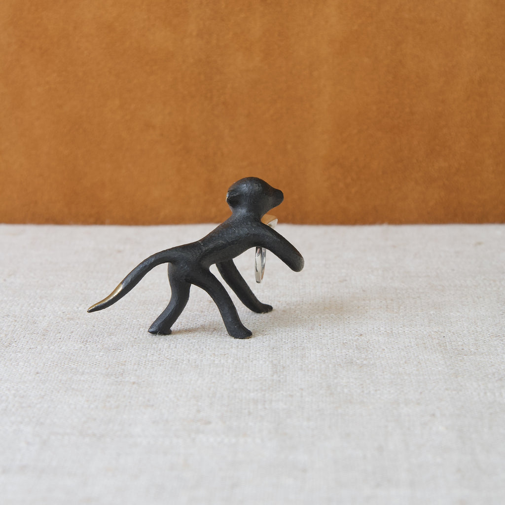 An extremely sculptural brass ring or pen holder in the form of a monkey, designed by Walter Bosse for Herta Baller, Austria, in the 1950s.