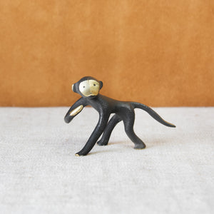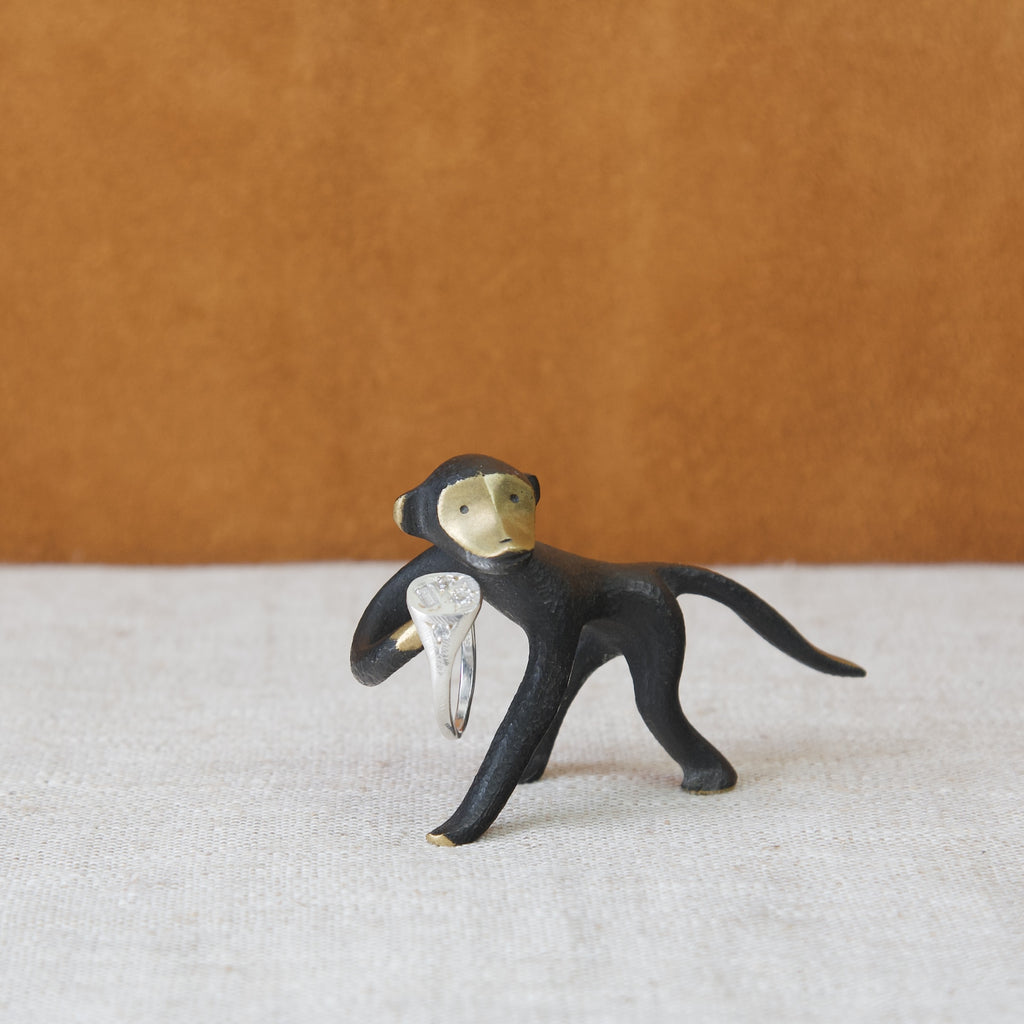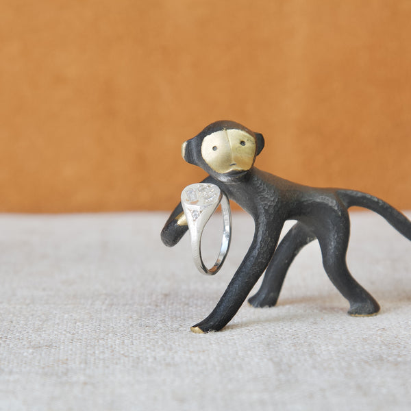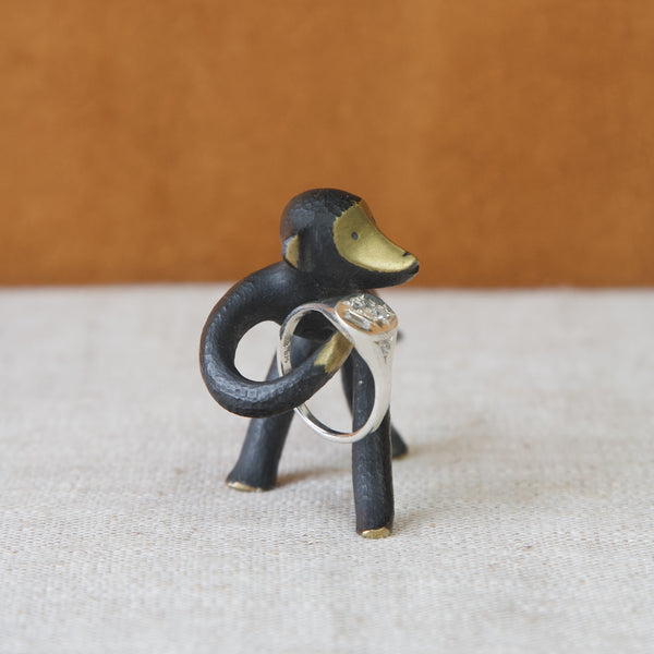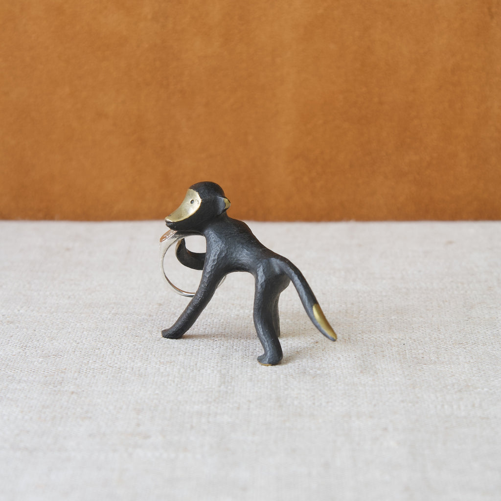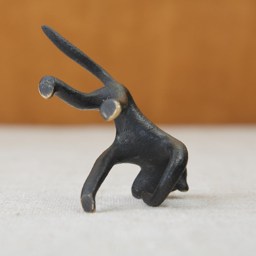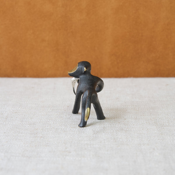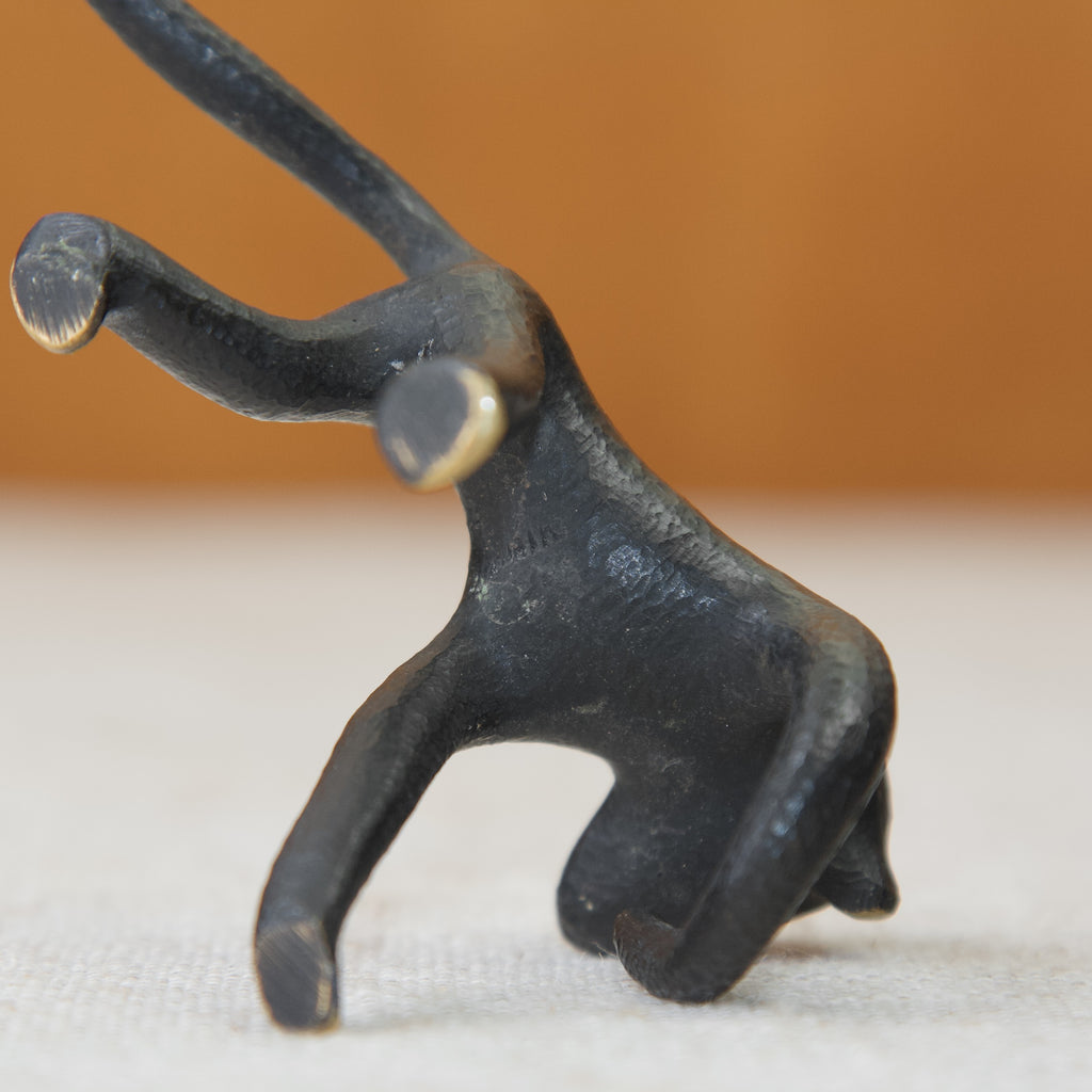 An extremely sculptural brass ring or pen holder in the form of a monkey, designed by Walter Bosse for Herta Baller, Austria, in the 1950s.