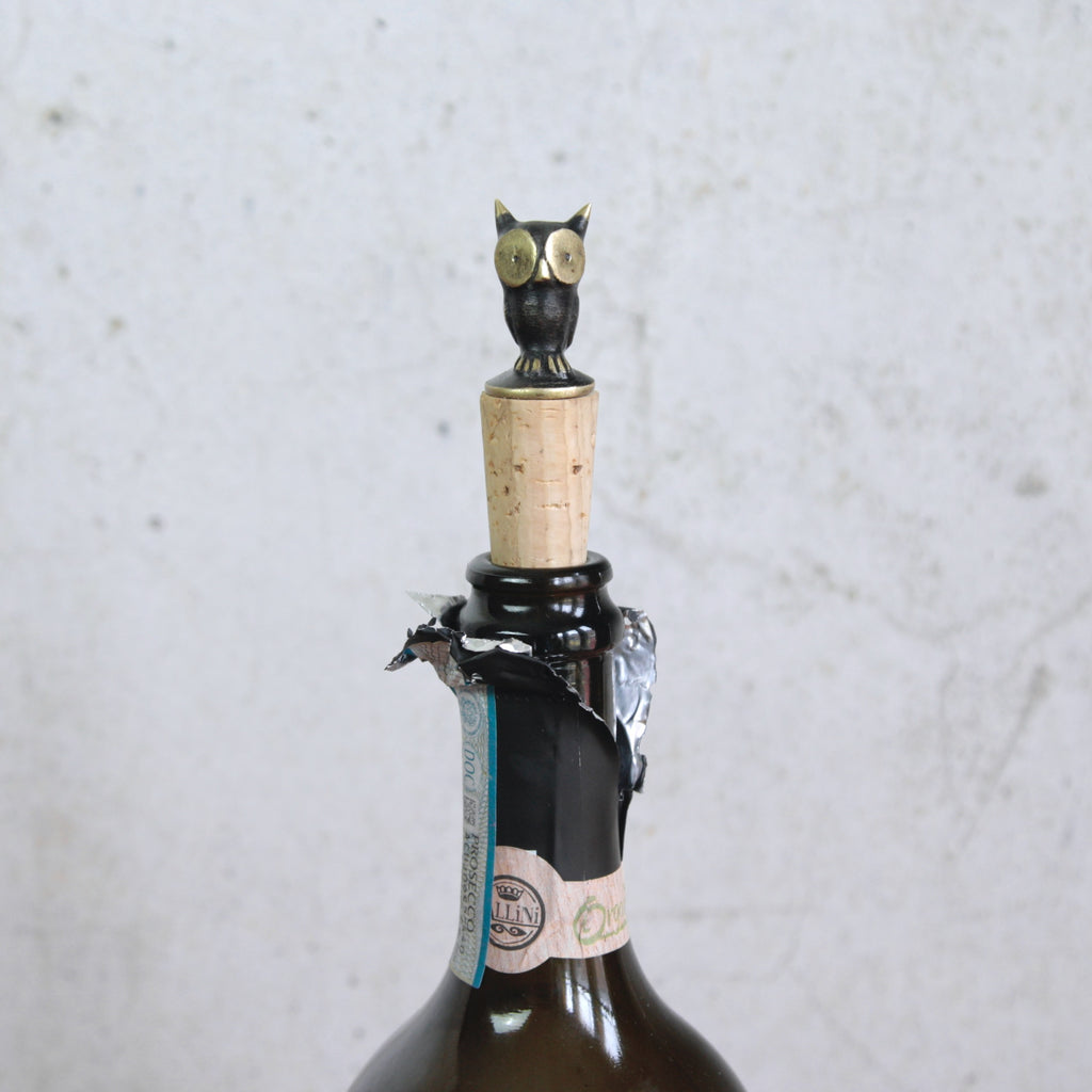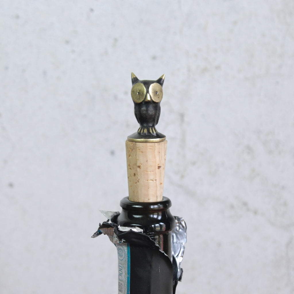 Here, a stylised owl serves as a practical bar accessory, perched neatly above a natural cork stopper. Its perfectly formed black-patinated body is offset by polished golden-brass eyes.