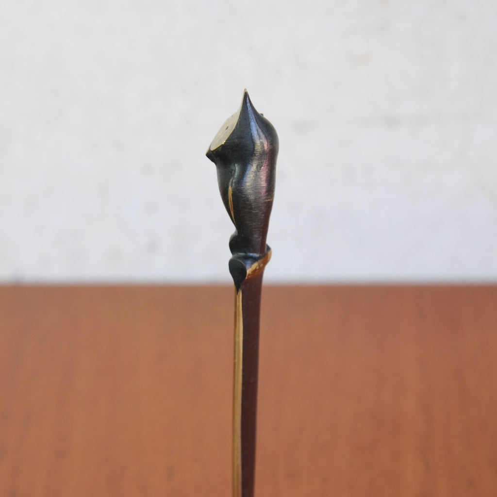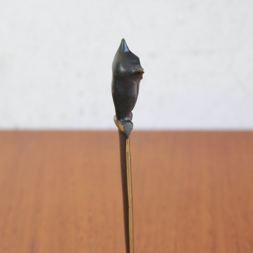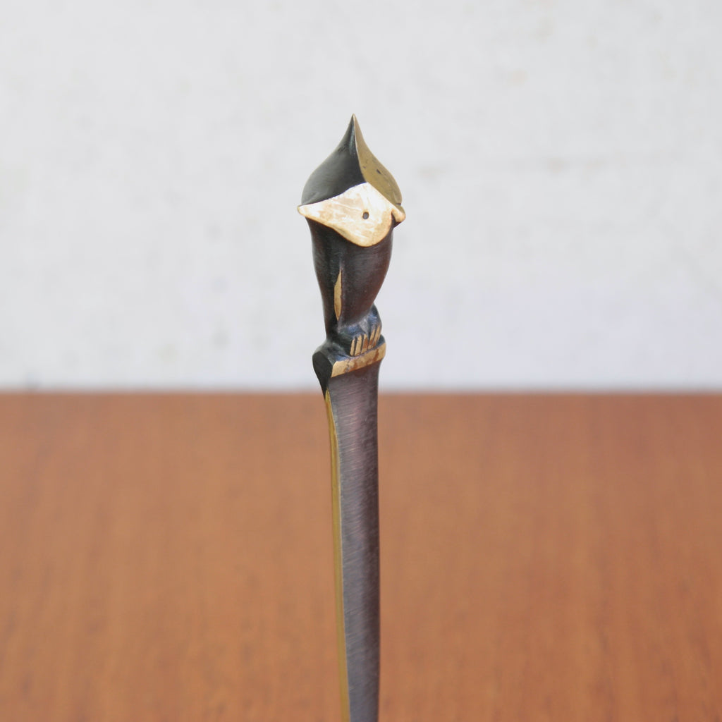 A sleek letter opener adorned with a stylised owl. This sculptural Modernist object was designed by Walter Bosse and made by Herta Baller, in the early-1950s, Austria.