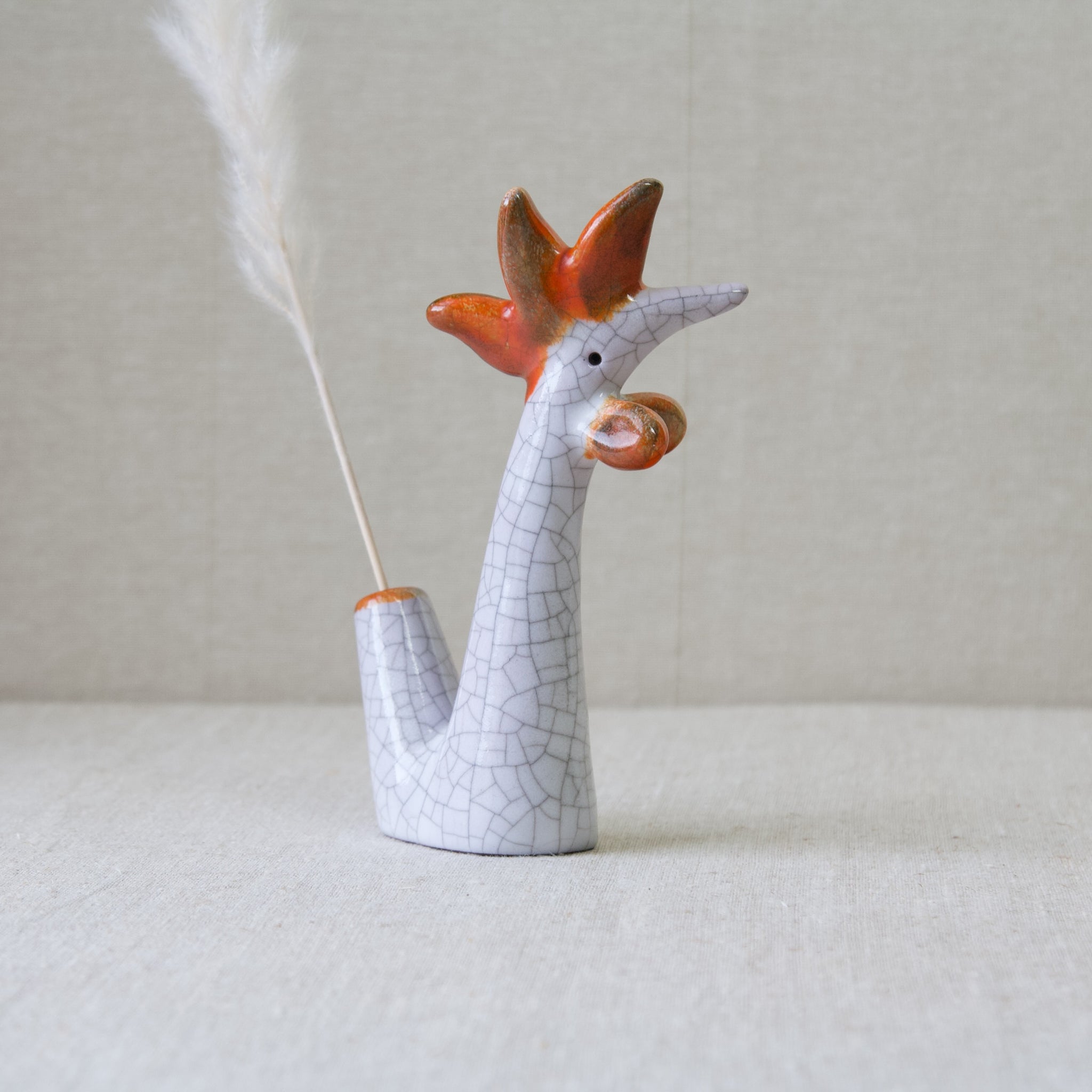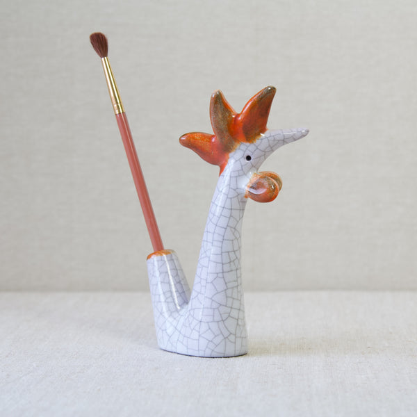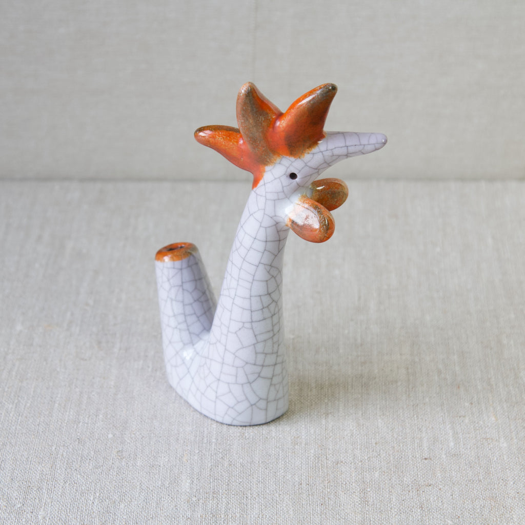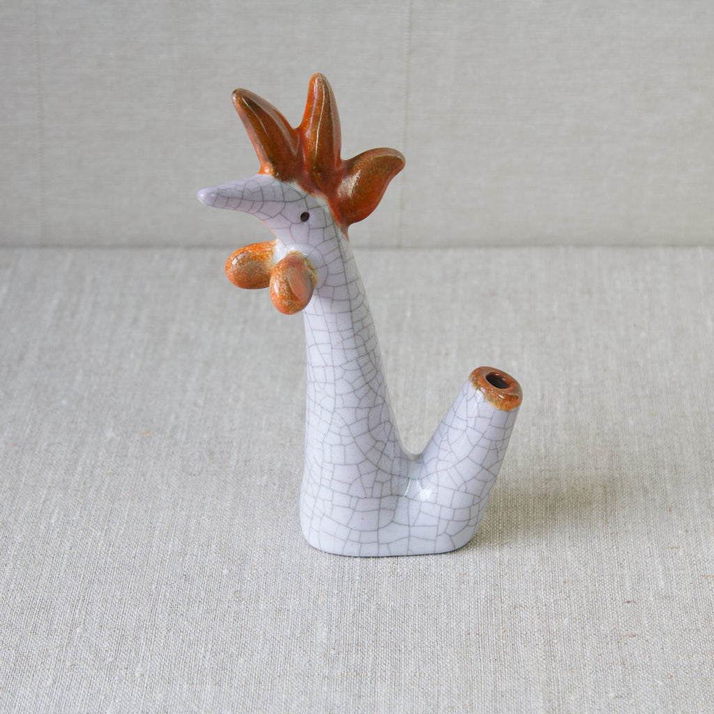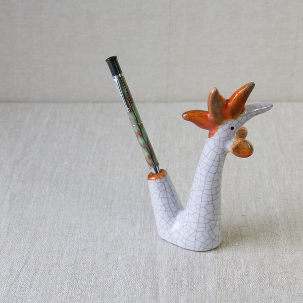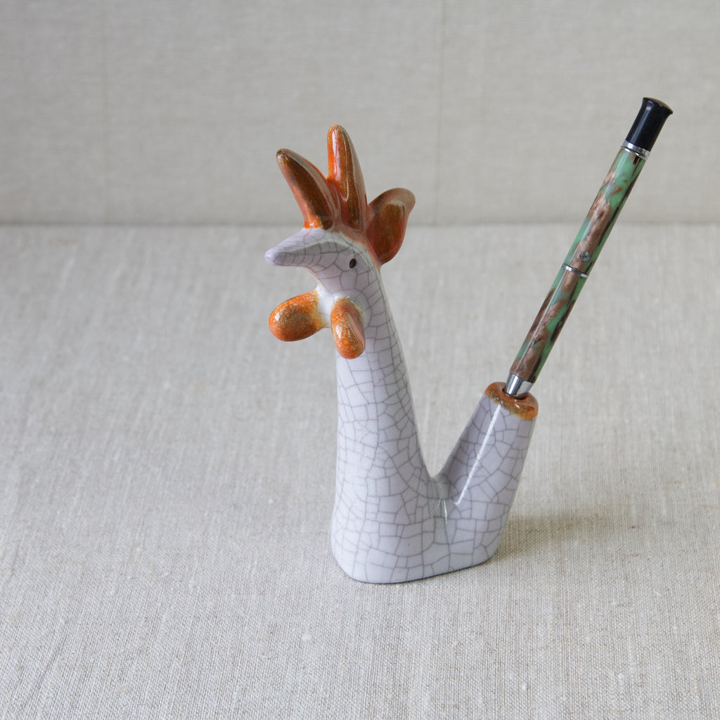 A stylised rooster quill/pen holder designed by Walter Bosse for the majolica ceramic workshop of Karlsruhe, Germany, circa 1960.