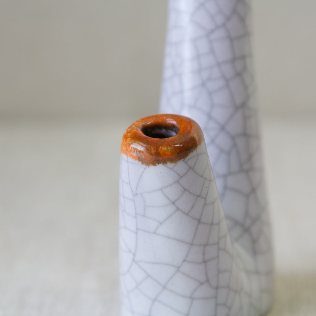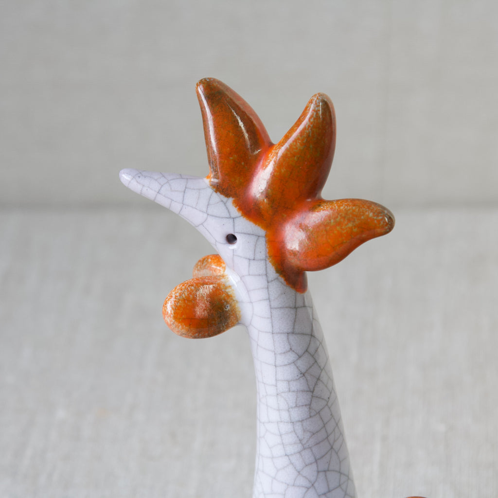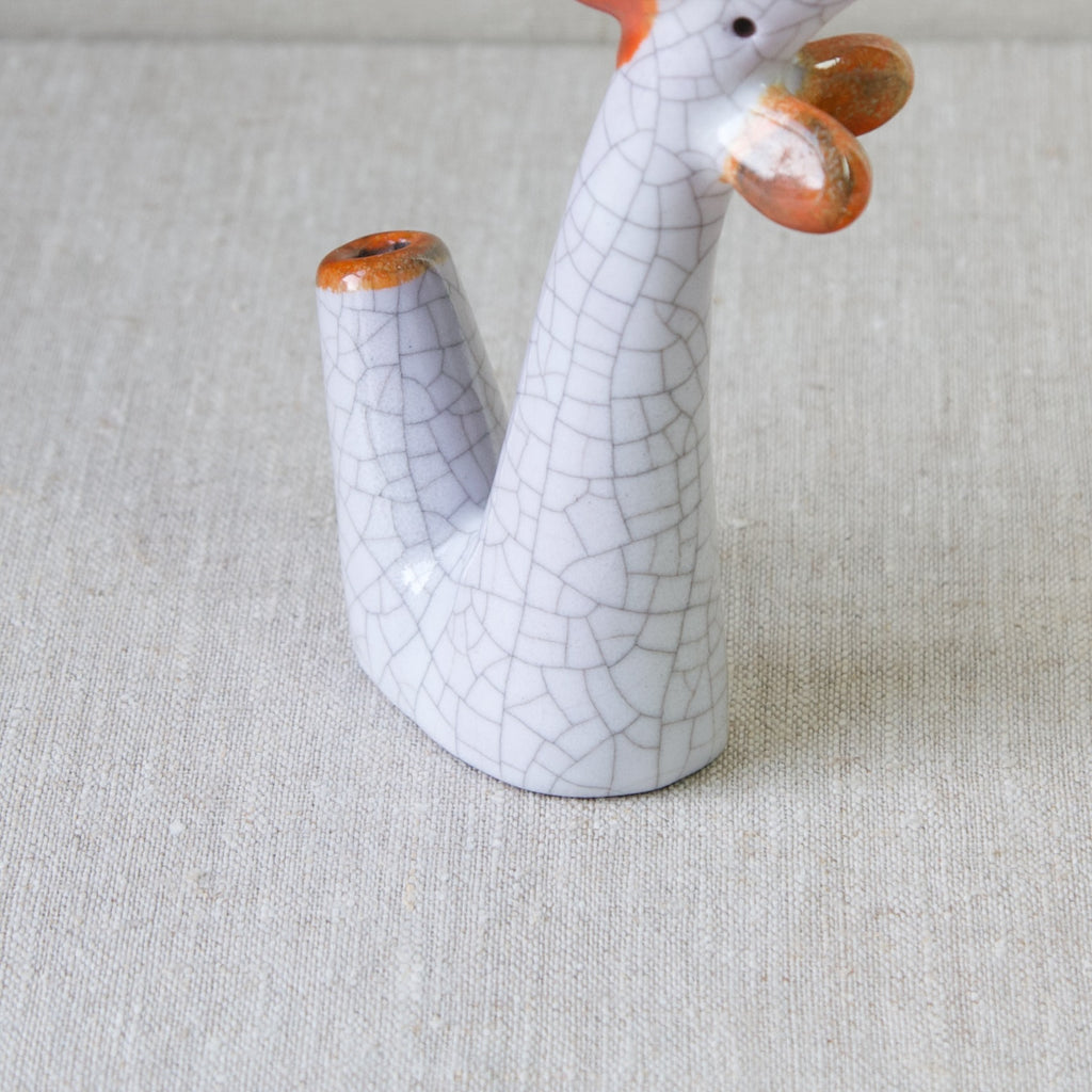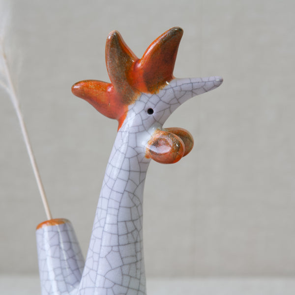 The rooster features a white craquelure glaze which is typical of the Karlsruhe factory, and adds a depth of visual interest to the piece. His expressive combs have been picked out in a vibrant orange glaze.