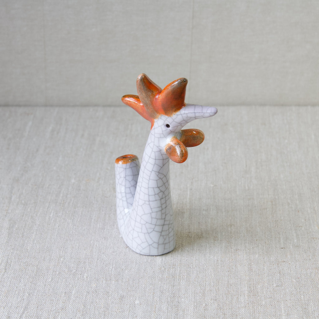 The rooster's sculptural form is superbly characterful. Modelled from two simple conical shapes with applied combs, this Modernist design is abstract yet has a whimsical charm & undeniable warmth. Although this item makes an attractive ornament, it was intended to perform a function; pens, pencils or indeed feathered quills can be stored in the tail.