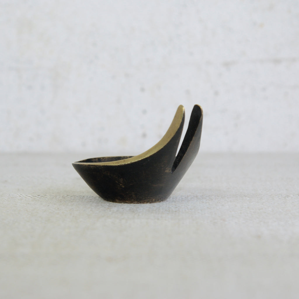 The versatile features a generous bowl which flows into two distinctive points. The stylish object makes a perfect vide-poche for keys or small items of jewellery. The piece is enhanced with a polished-brass rim which varies in thickness. The dish is otherwise patinated black; a technique mastered by Austria's finest metal workshops of this period.